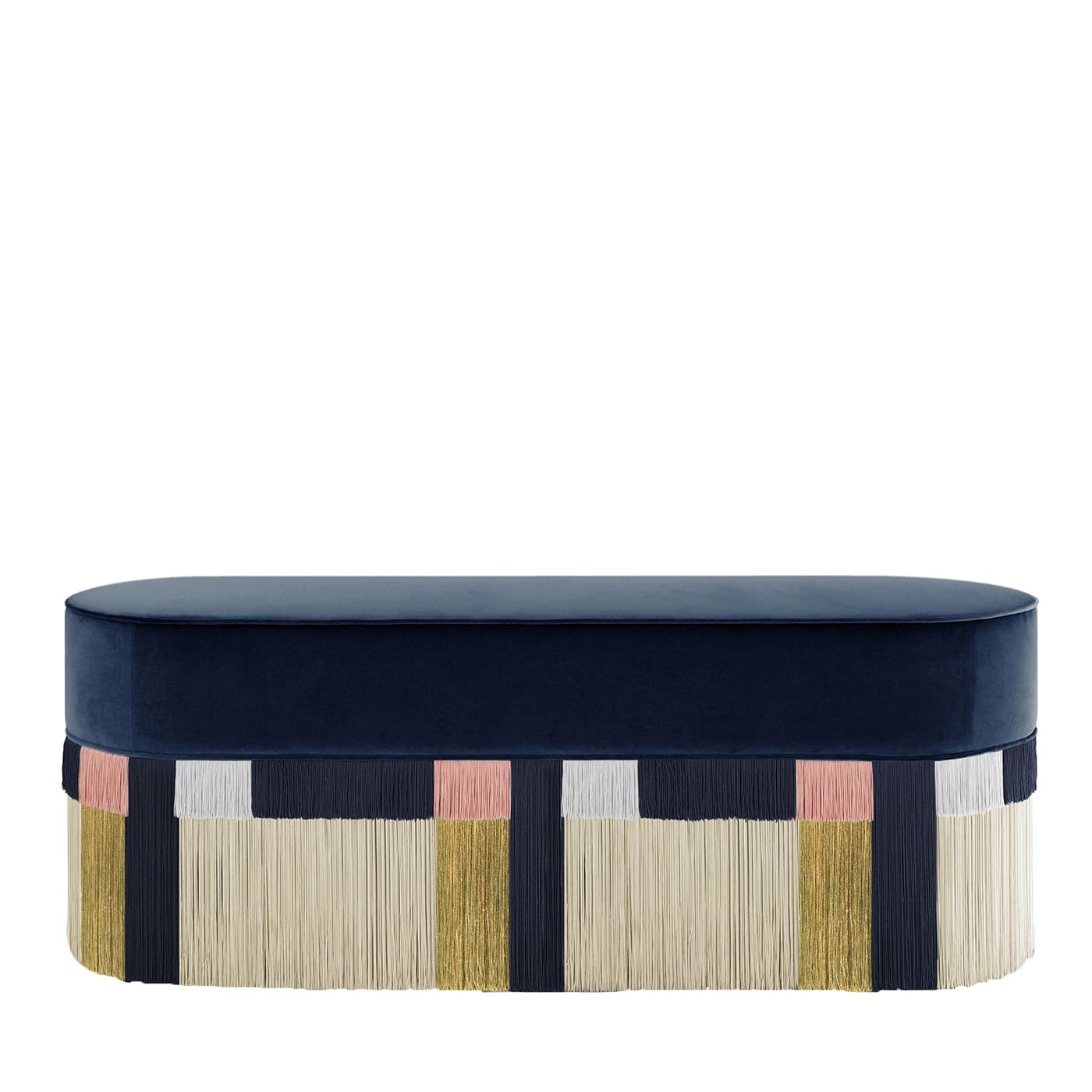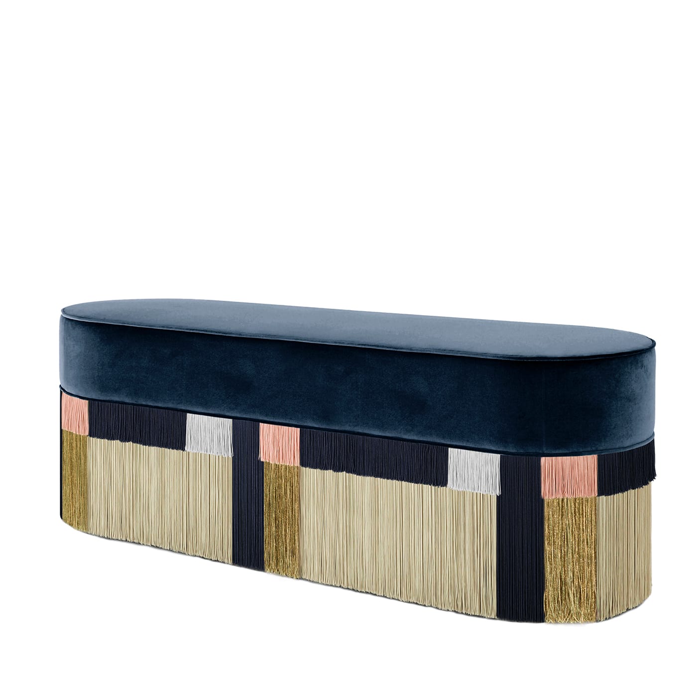 Множество вискозной бахромы разных размеров и цветов, обвивающей гармоничное лакированное основание, создает потрясающий геометрический узор, характерный для этой удлиненной скамьи. Эта стильная деталь, дополняющая изножье двуспальной кровати, дополнена мягким бархатным сиденьем благородного синего оттенка. Свяжитесь с консьержем, чтобы узнать о вариантах персонализации и ценах. Каждый изготовленный на заказ предмет имеет тиснение на нижней части обивки пуфа, а также личную подпись, номер и дату дизайнера.