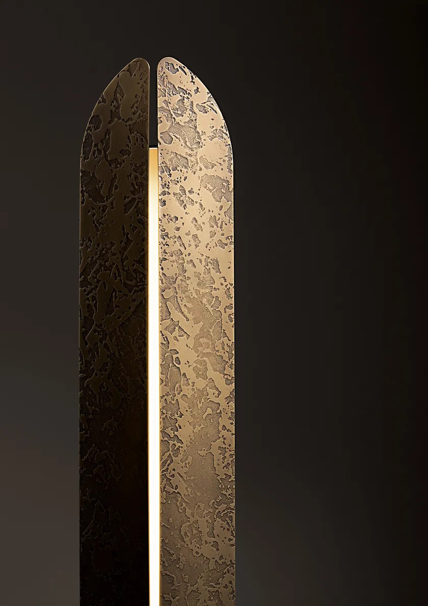 Бра Aare wall от фабрики De Castelli — это не просто источник света, а арт-объект, вдохновленный силами природы. Разработанный Александром Пёрселлом Родригесом, этот настенный светильник воспроизводит эрозию скал в швейцарском ущелье Ааре, где ледник вырезал глубокие трещины. Центральная прорезь в металлических элементах пропускает свет, создавая драматичную игру теней, словно лучи пробиваются сквозь древние известняковые слои.