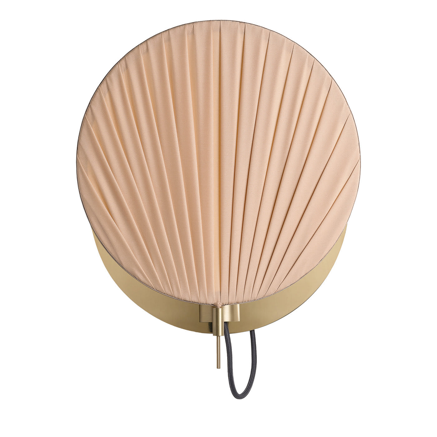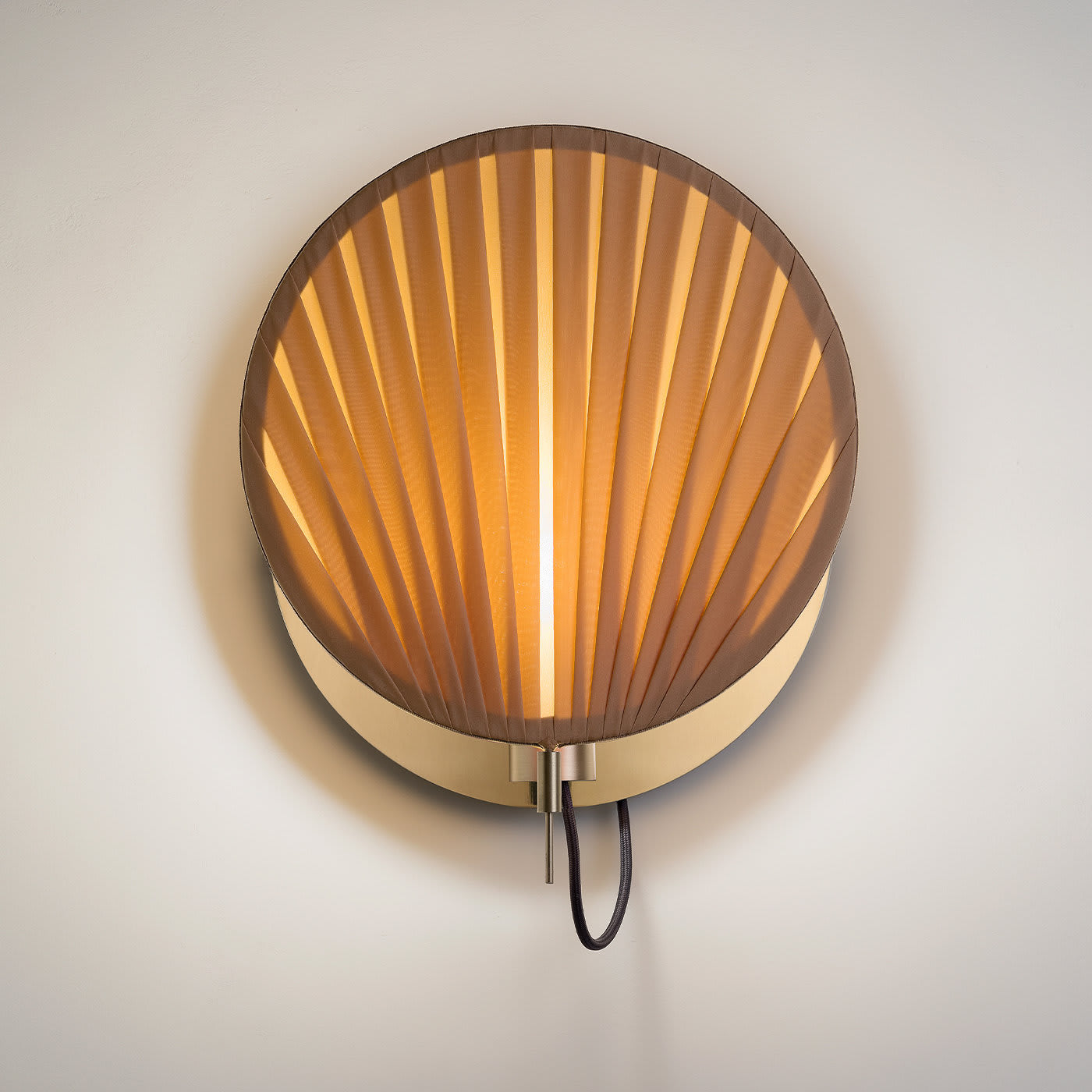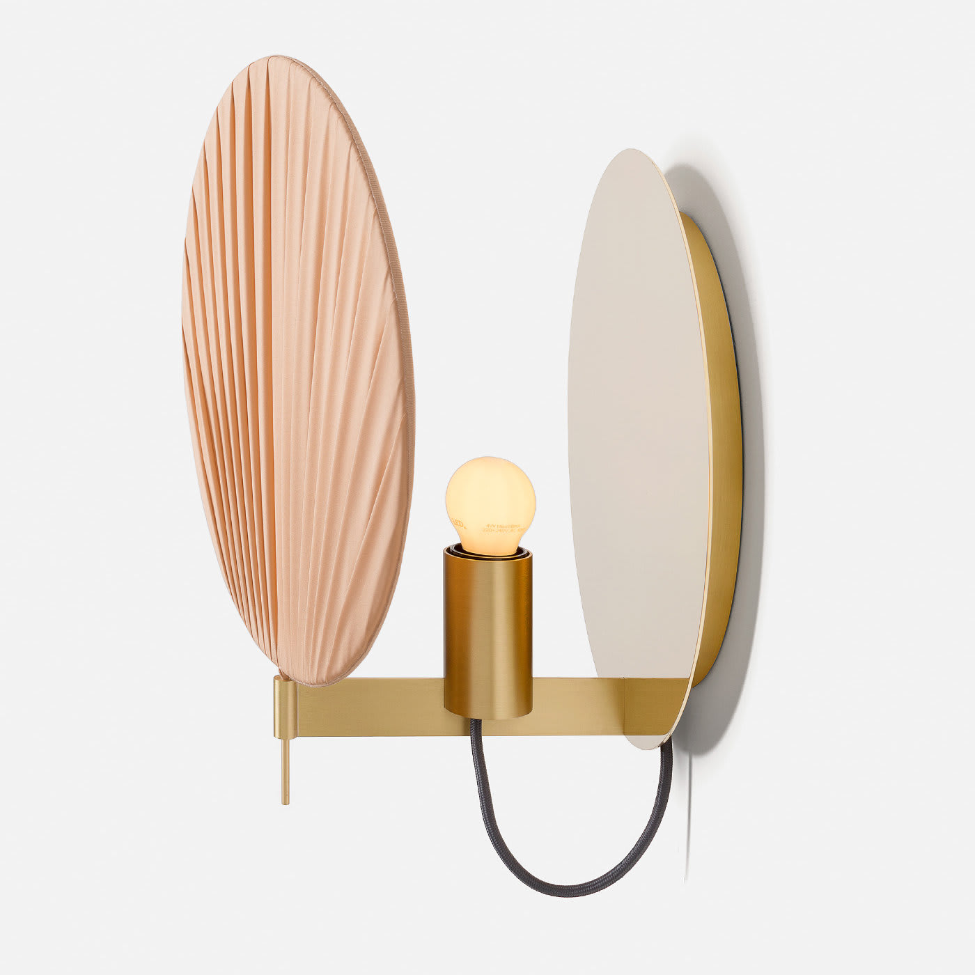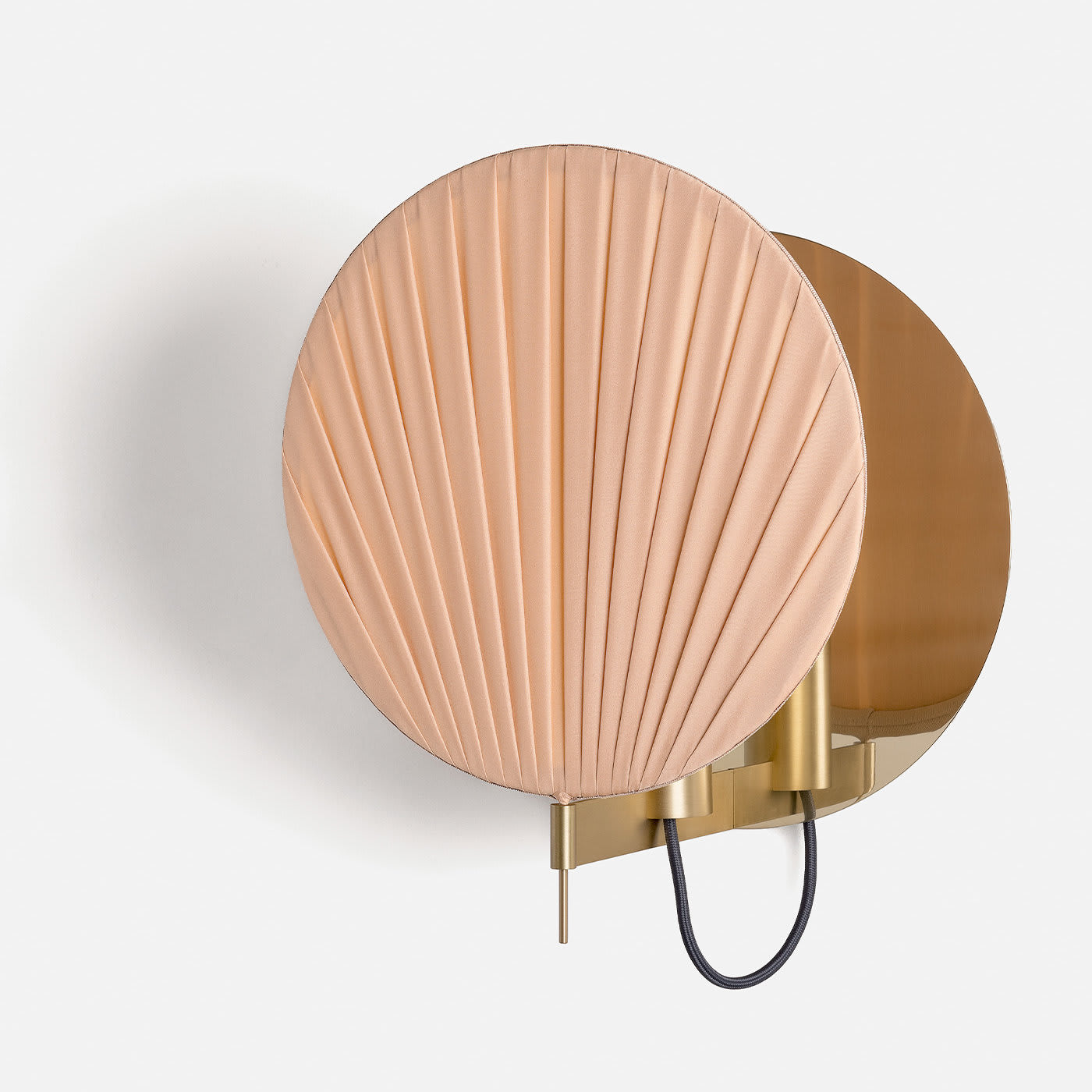Этот интригующий предмет функционального декора был разработан эксклюзивно для выставки Fuorisalone 2018 «Stranger Pinks» компании в рамках Недели дизайна в Милане. Круглая форма абажура состоит из нескольких слоёв плиссированной органзы, создающих потрясающую переливающуюся атмосферу. Он поддерживается латунными кронштейнами, соединёнными с латунным диском, закреплённым на стене. Свет отражается от металла и рассеивается тканевым вентилятором, украшая как современный, так и классический интерьер.