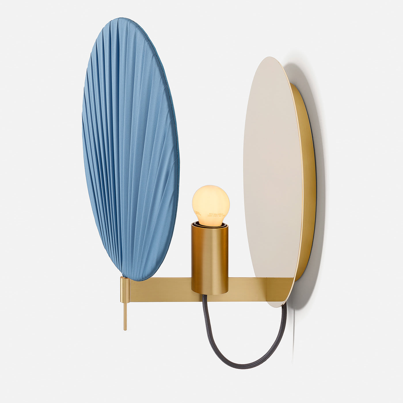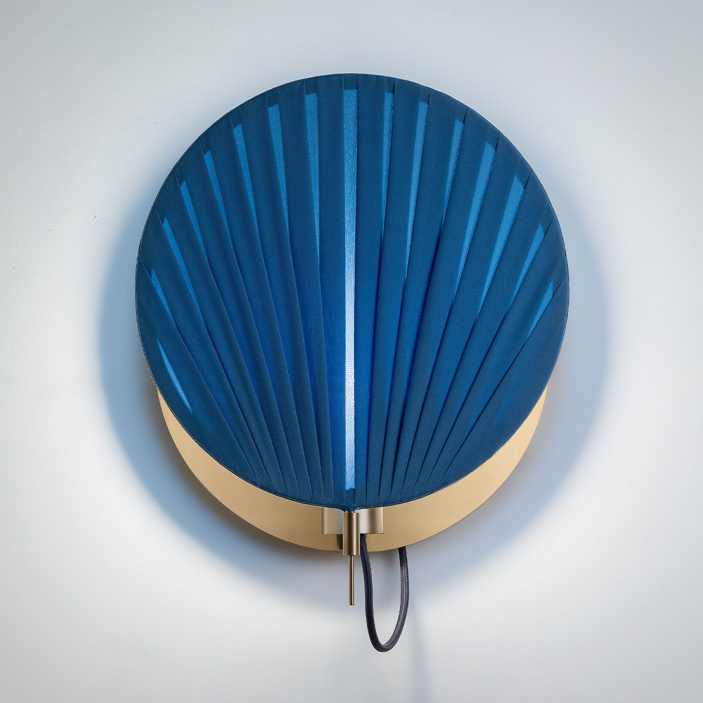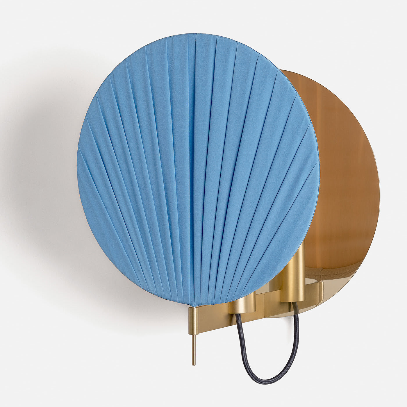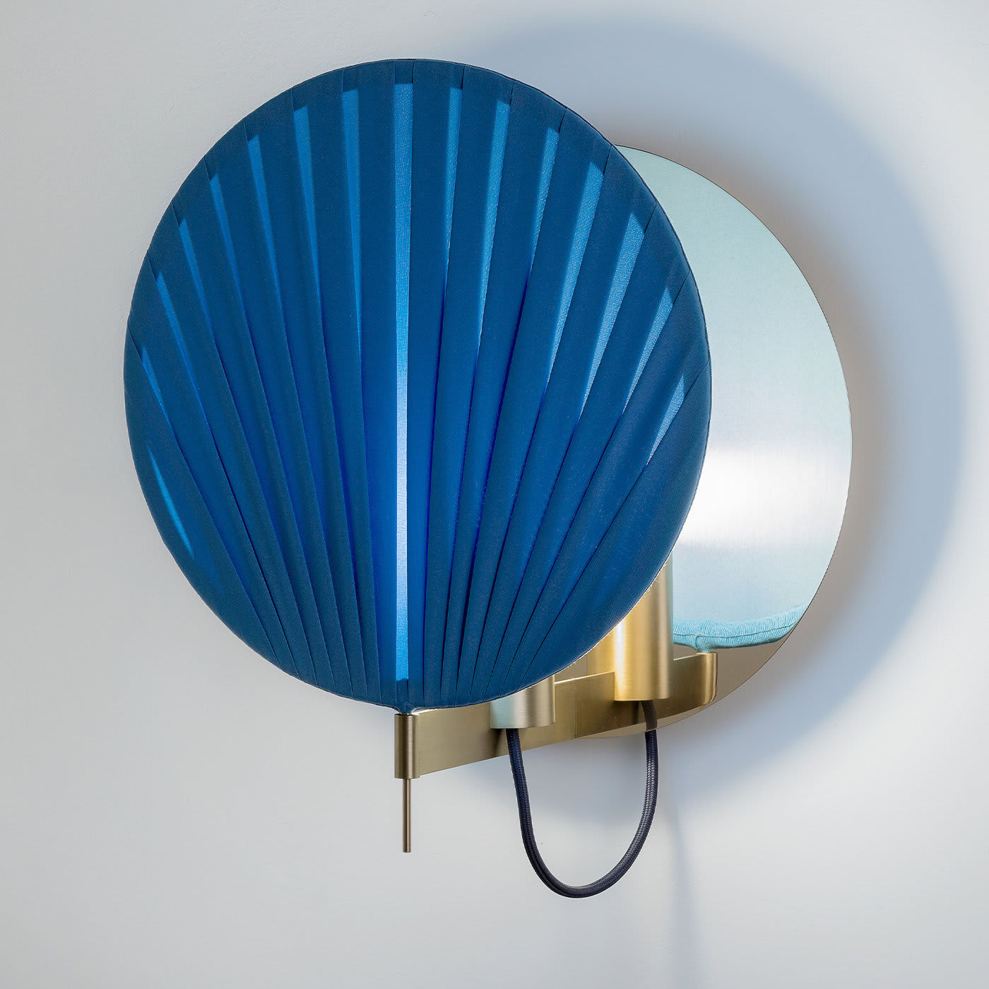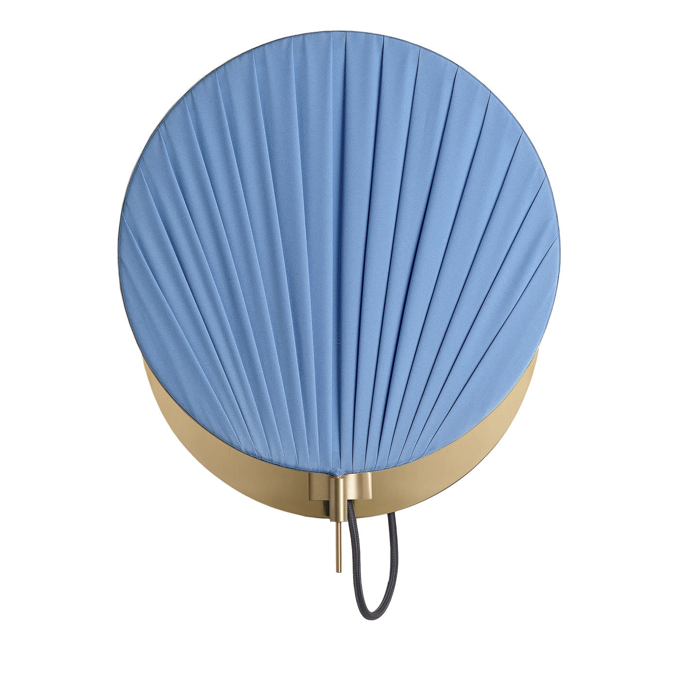 Этот настенный светильник – изысканный функциональный предмет декора, который украсит современный дом. Он состоит из цельного латунного диска, прикрепленного к стене, и кронштейна из натуральной латуни. Абажур изготовлен из диска из позолоченного понже, расположенного в несколько слоев, которые рассеивают свет изнутри, создавая чарующую атмосферу. Нежно-голубой цвет великолепно смотрится и идеально подойдет для яркой прихожей или детской комнаты. Этот светильник можно комбинировать с другими светильниками других оттенков для создания яркого эффекта.