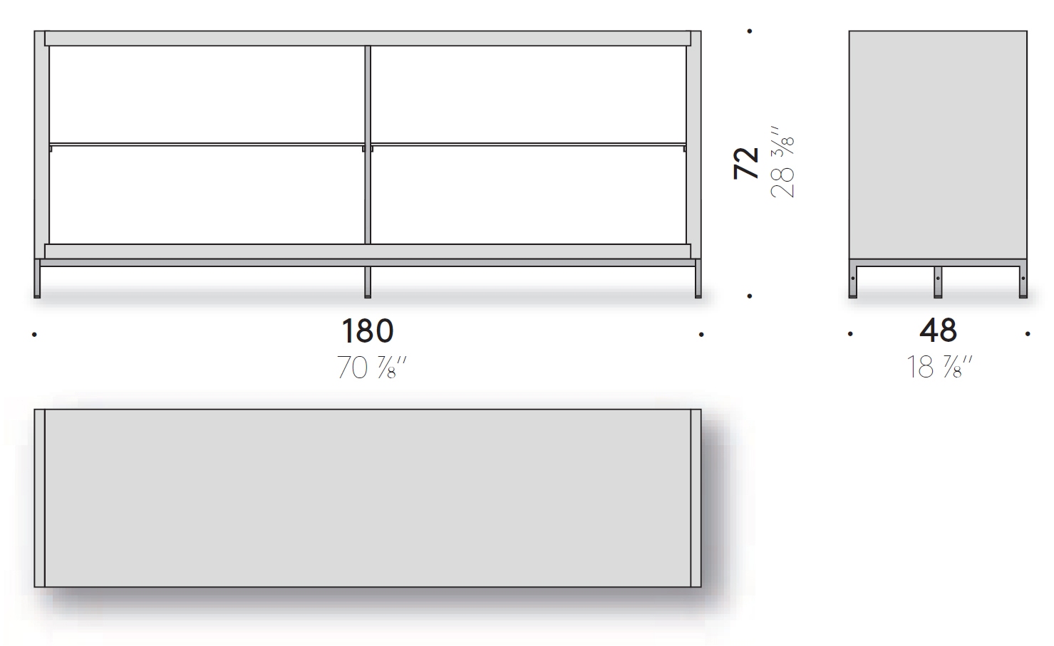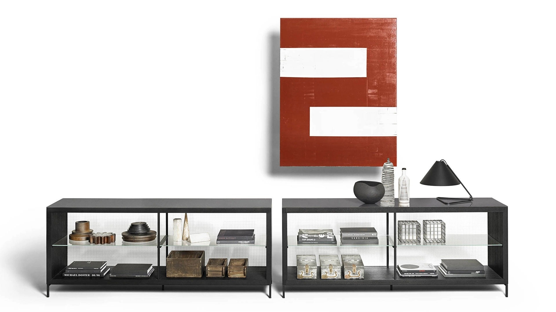 Комби-буфет DePadovaКомби-шкаф, разработанный Пьеро Лиссони для DePadova, представляет собой буфет с основанием из стали с матовым черным порошковым покрытием и регулируемыми ножками. Конструкция выполнена из столярных плит, шпонированных натуральным или крашеным дубом. Полки выполнены из сверхпрозрачного прозрачного стекла, а задняя часть — из армированного стекла или закаленного отражающего стекла кофейного цвета с окраской сзади. Верхняя поверхность выполнена из закаленного стекла кофейного цвета с обратной окраской. Комби-шкаф доступен в различных вариантах отделки, с системой внутреннего освещения или без нее.