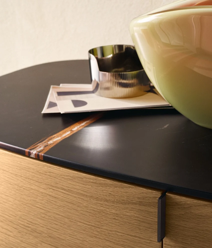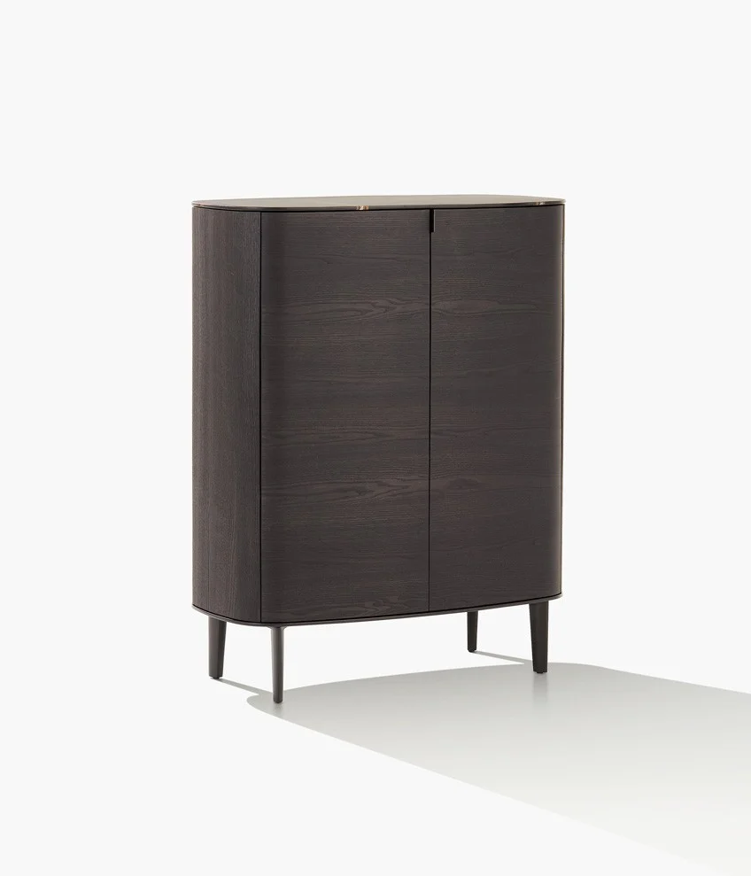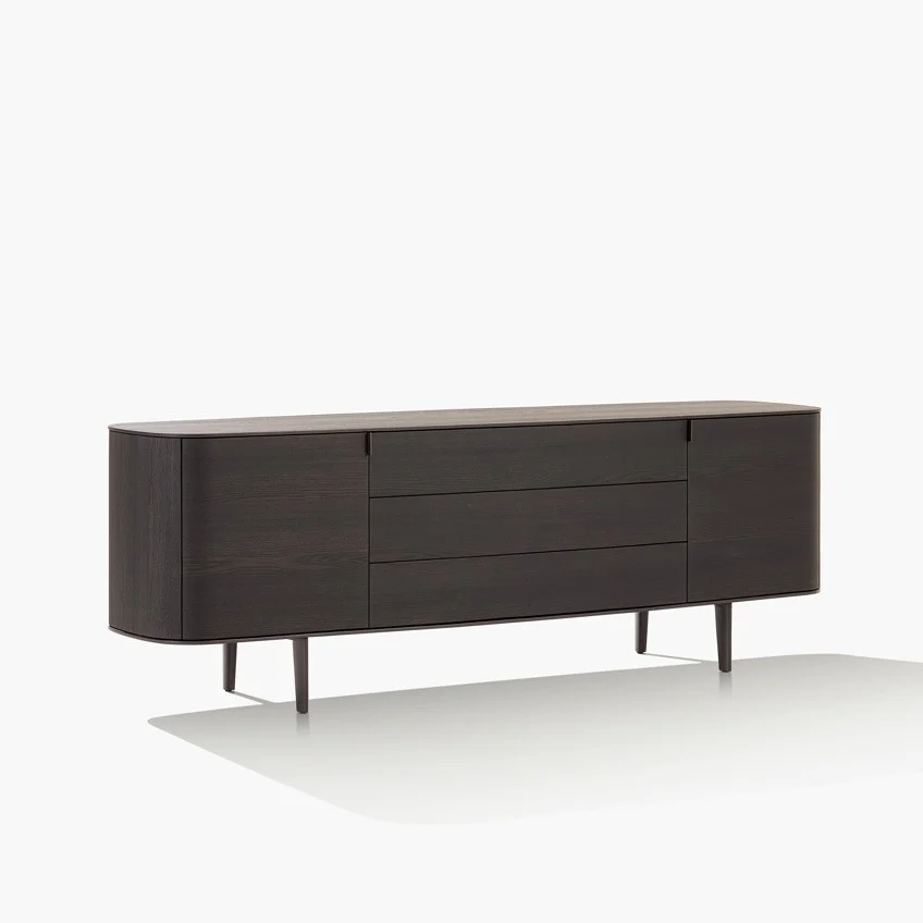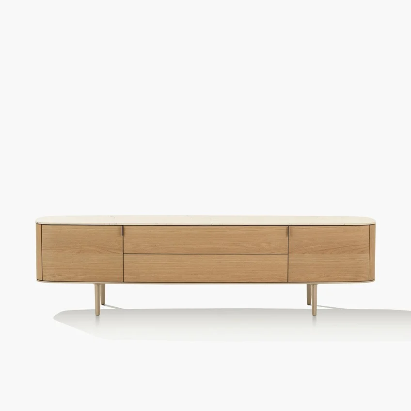 Комод Symphony PoliformSymphony, разработанный Эммануэлем Галлиной для Poliform, представляет собой коллекцию буфетов с металлическими ножками, деревянной структурой и фасадами, а также деревянной или мраморной столешницей.