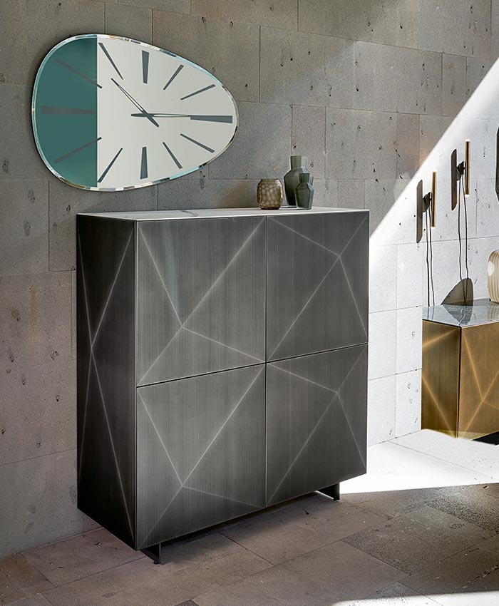 Комод Cubric RiflessiCubric, разработанный Riflessi, представляет собой комод с дверцами и боковинами из металла ромбовидной формы. Внутренняя часть и задняя часть из ореха каналетто. Внутренние полки из прозрачного стекла. Открывание push-pull. По желанию можно вставить внутренние ящики и деревянные полки. Доступны в различных размерах и отделках.
