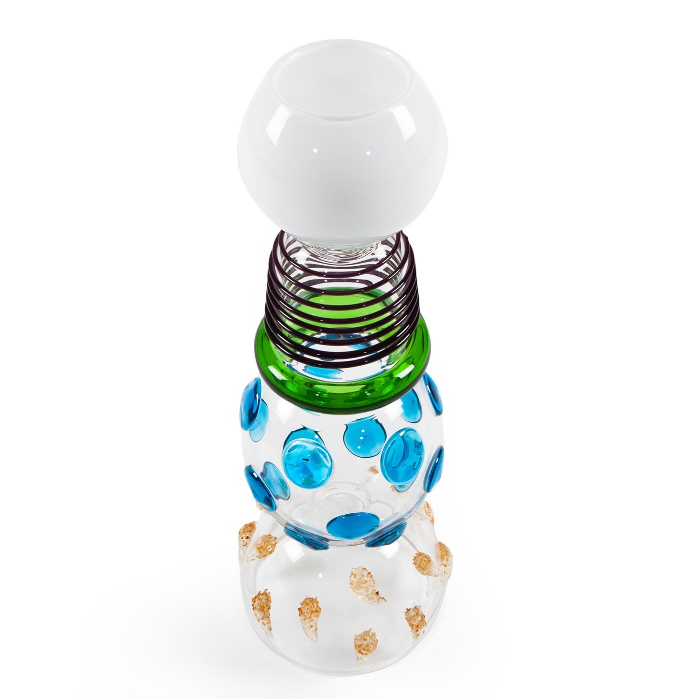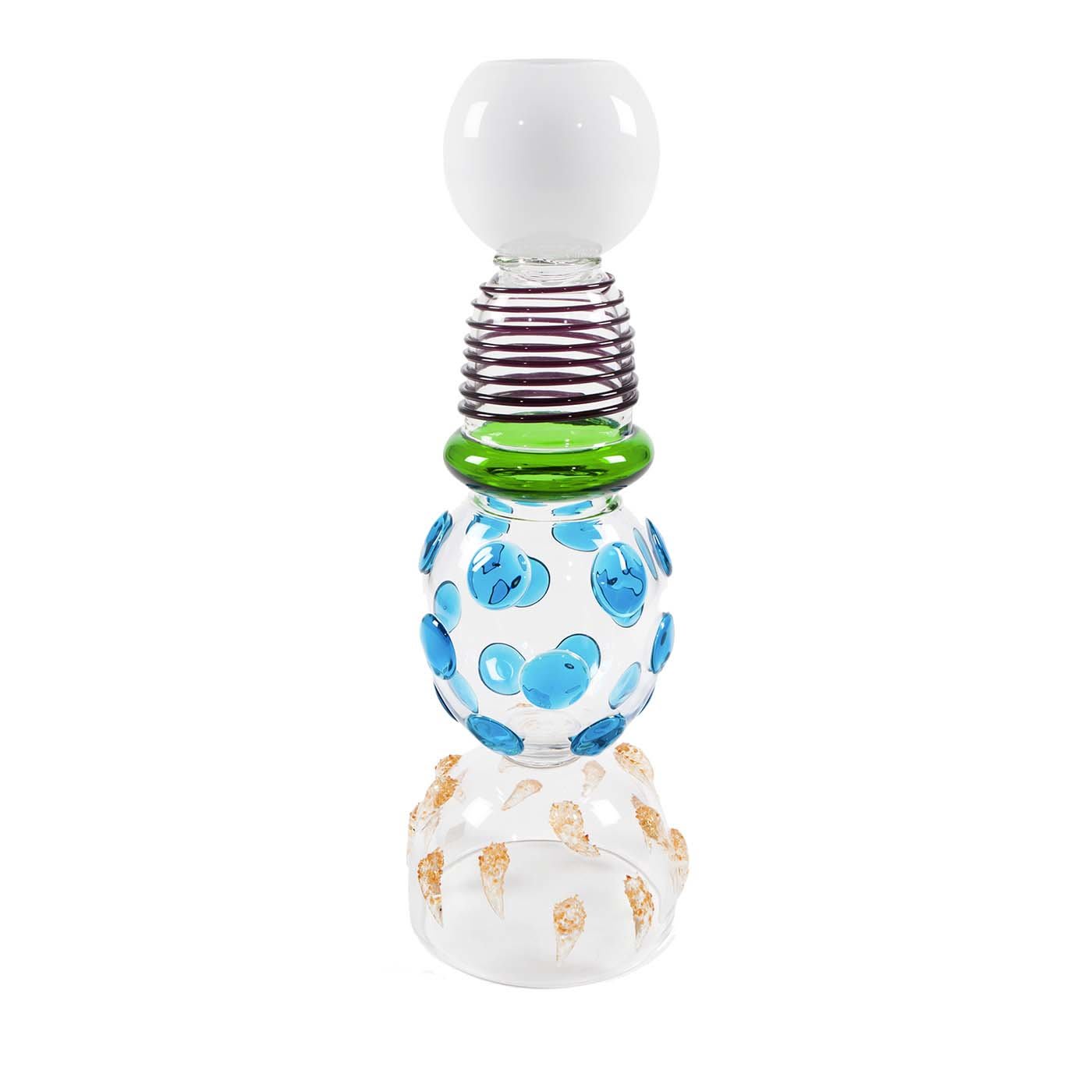Эта ваза из дутого стекла, созданная Этторе Соттсассом в 1983 году, отличается характерной асимметрией и красочной эклектичностью эстетики Мемфиса. В тотемной конструкции изящные округлые элементы накладываются друг на друга, создавая эффектное сочетание узоров и оттенков, достигающее кульминации в сферической белой горловине. Это современное произведение искусства станет прекрасным дополнением к современному интерьеру, будь то отдельно или в сочетании с другими изделиями того же дизайнера. Из-за ручной работы размеры и нюансы могут отличаться от представленных на фотографии.