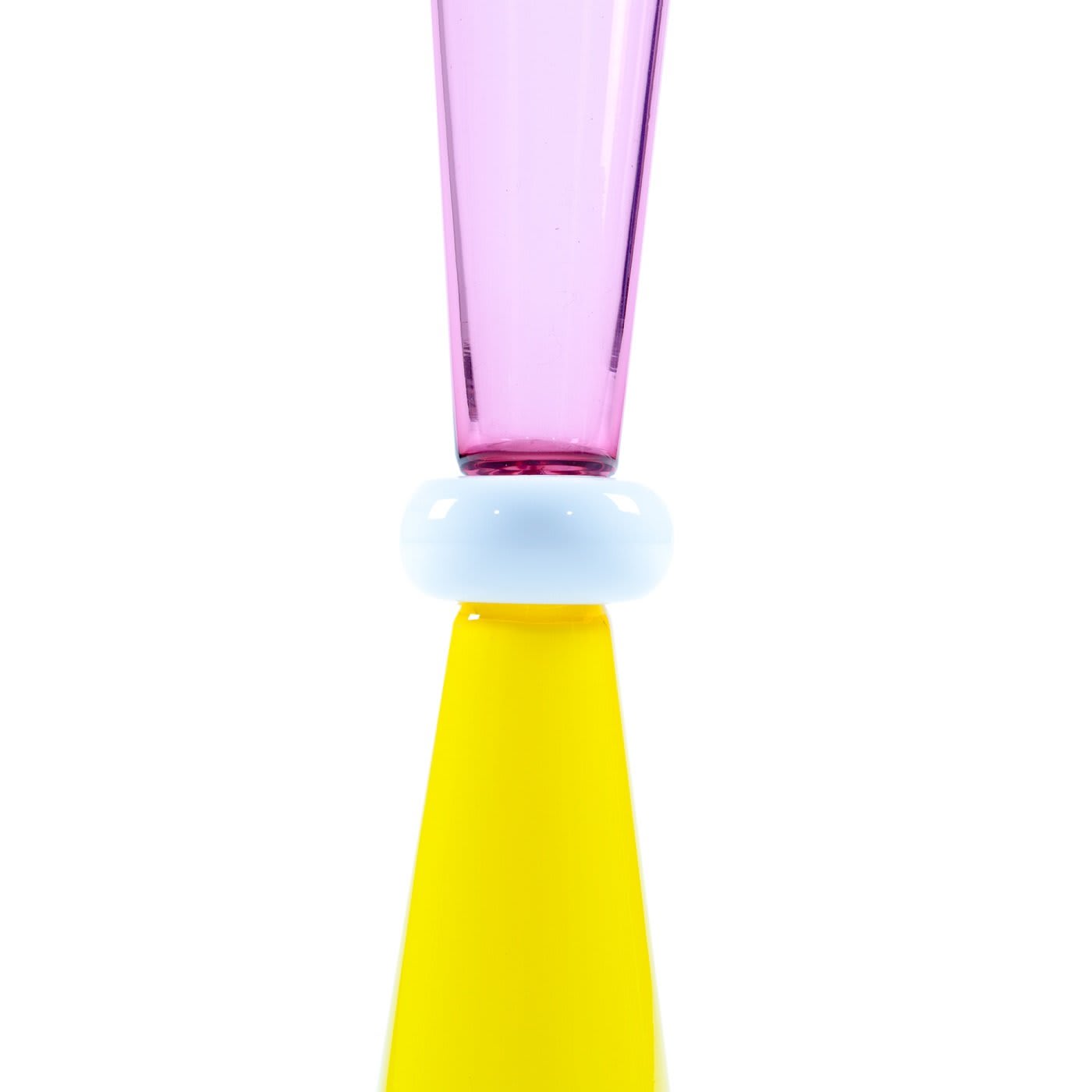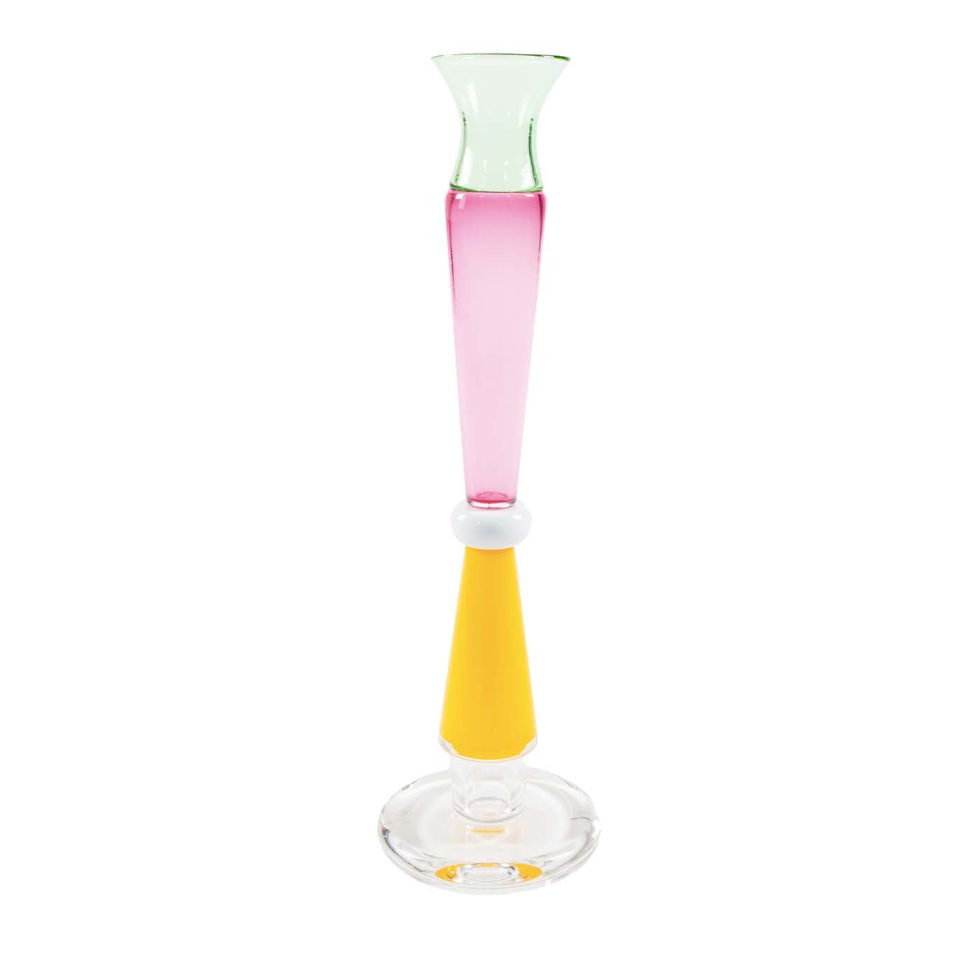 Классический силуэт и изысканное сочетание цветов этой потрясающей вазы делают её великолепным дополнением как к традиционному, так и к современному интерьеру. Эта ваза была разработана Этторе Соттсассом в 1986 году и входит в коллекцию Vetri Glass, изготовленную вручную из муранского стекла. Прозрачное основание украшено подписью художника и поддерживает два конических элемента: один жёлтого, другой розового цвета, с прозрачным расширяющимся горлышком вверху.