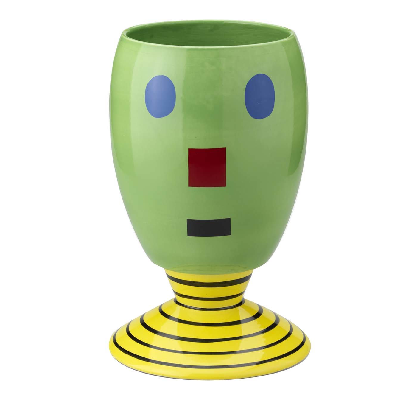 Ваза Bart от Роджера Селдена, отличающаяся необычным, но пропорциональным стилем для современных интерьеров, не нуждается в цветах, чтобы украсить комнату. Зелёная ваза на черно-жёлтом полосатом основании украшена небольшим лицом, составленным из простых фигур. Изготовлена из керамики. Коллекция Flip Flop.