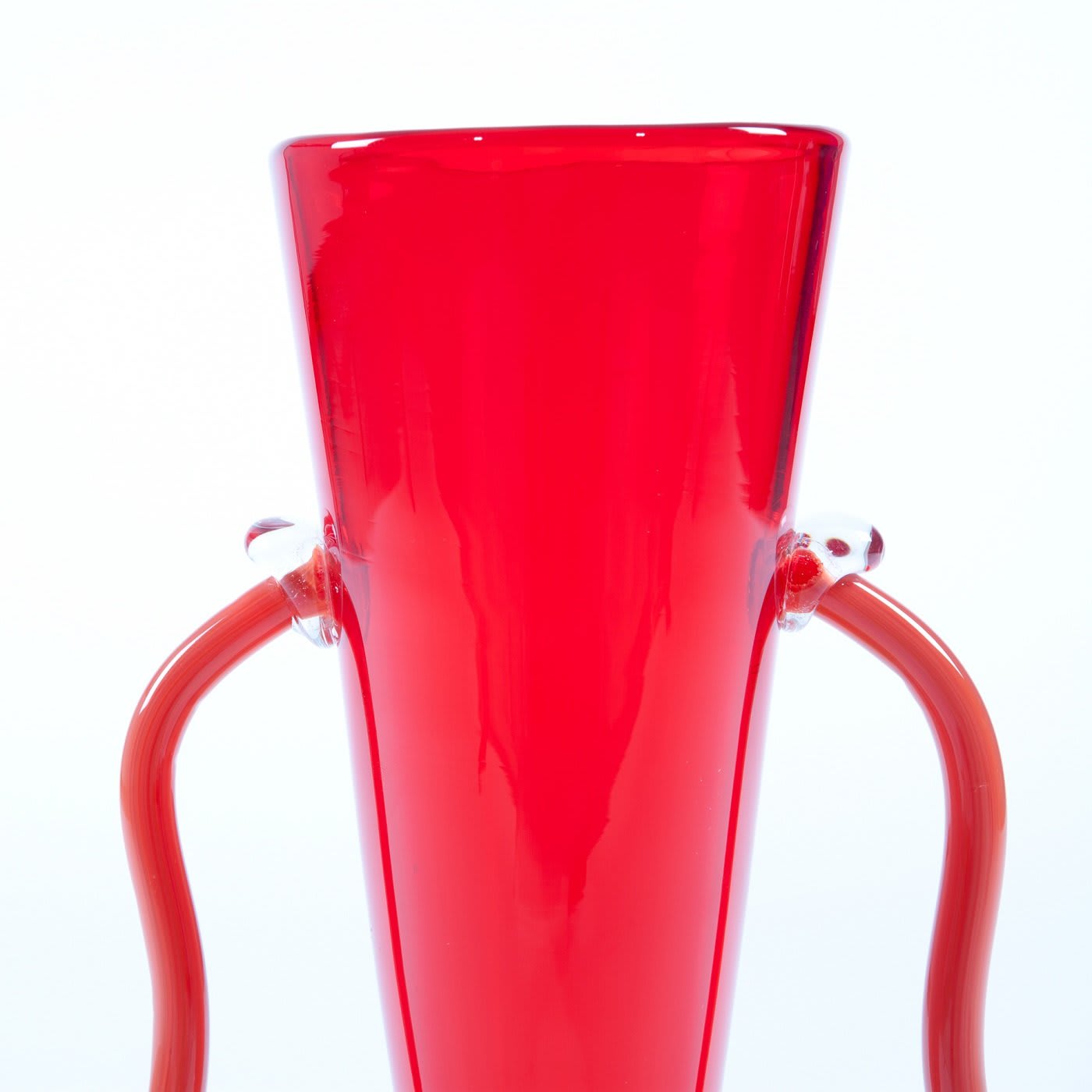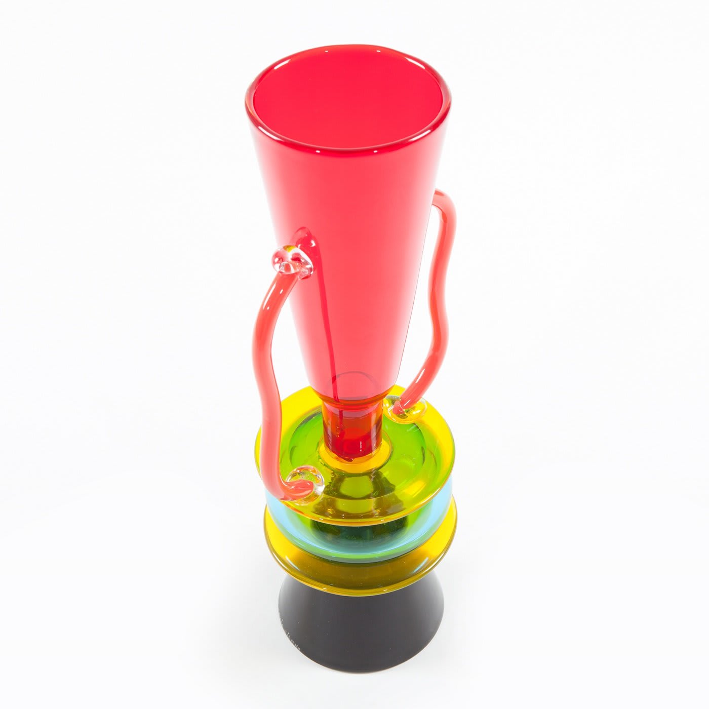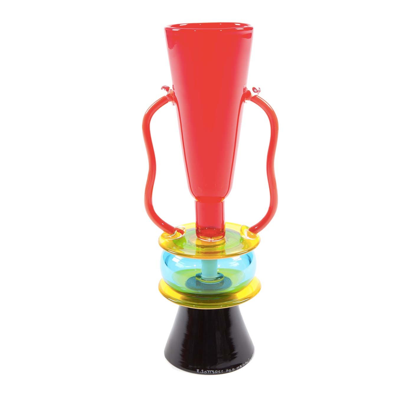 Эта ваза из выдувного стекла, созданная Этторе Соттсассом в 1982 году, входит в серию, призванную оживить современный интерьер динамичным и ярким сочетанием форм и цветов. Симметричный силуэт сочетает в себе коническую черную форму, поддерживающую ножку, состоящую из бледно-голубого шара, окруженного двумя желтыми кольцами. Ярко-красная чаша оснащена двумя боковыми ручками, напоминающими уникальный трофей. В связи с тем, что изделие изготовлено вручную, цвета и размеры могут отличаться от представленных на фотографии.