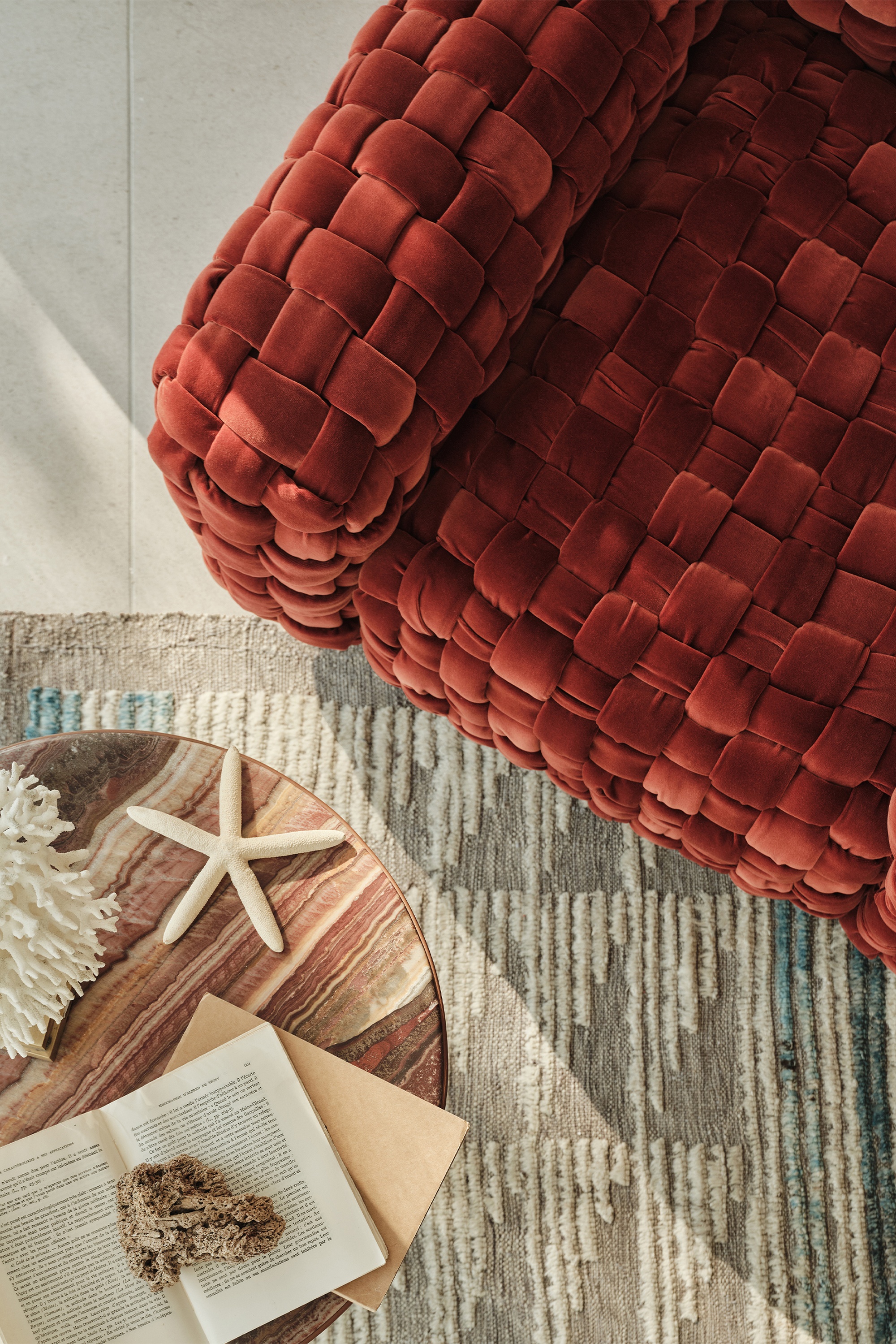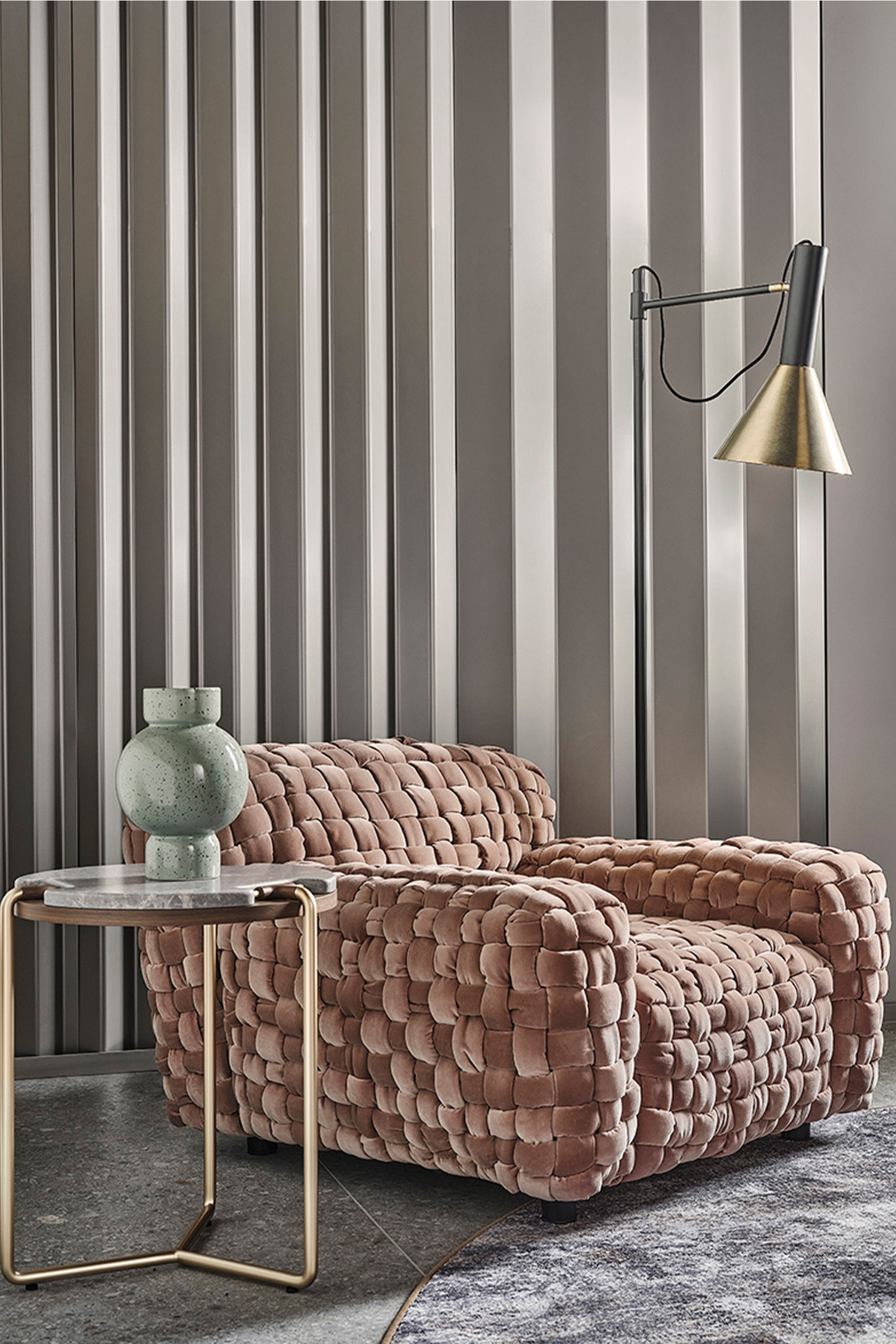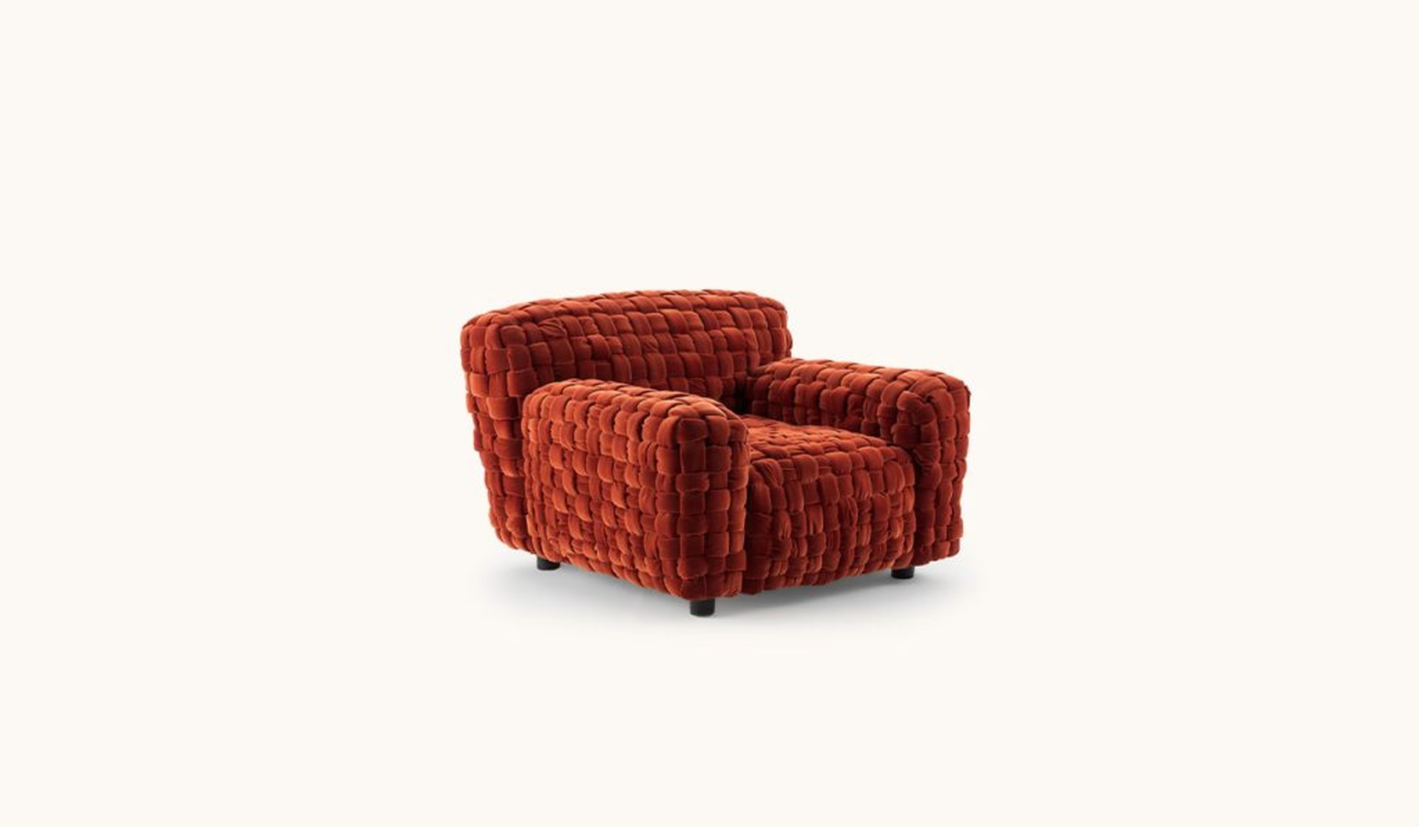 Кресло Azul от фабрики Turri из одноимённой коллекции — уникальное произведение мебельного искусства, вдохновлённое традициями высокой моды. Модель выглядит как изысканное макроплетение из бархата: каждая «трубка» создаётся вручную — вырезается, сшивается, набивается и переплетается мастерами.