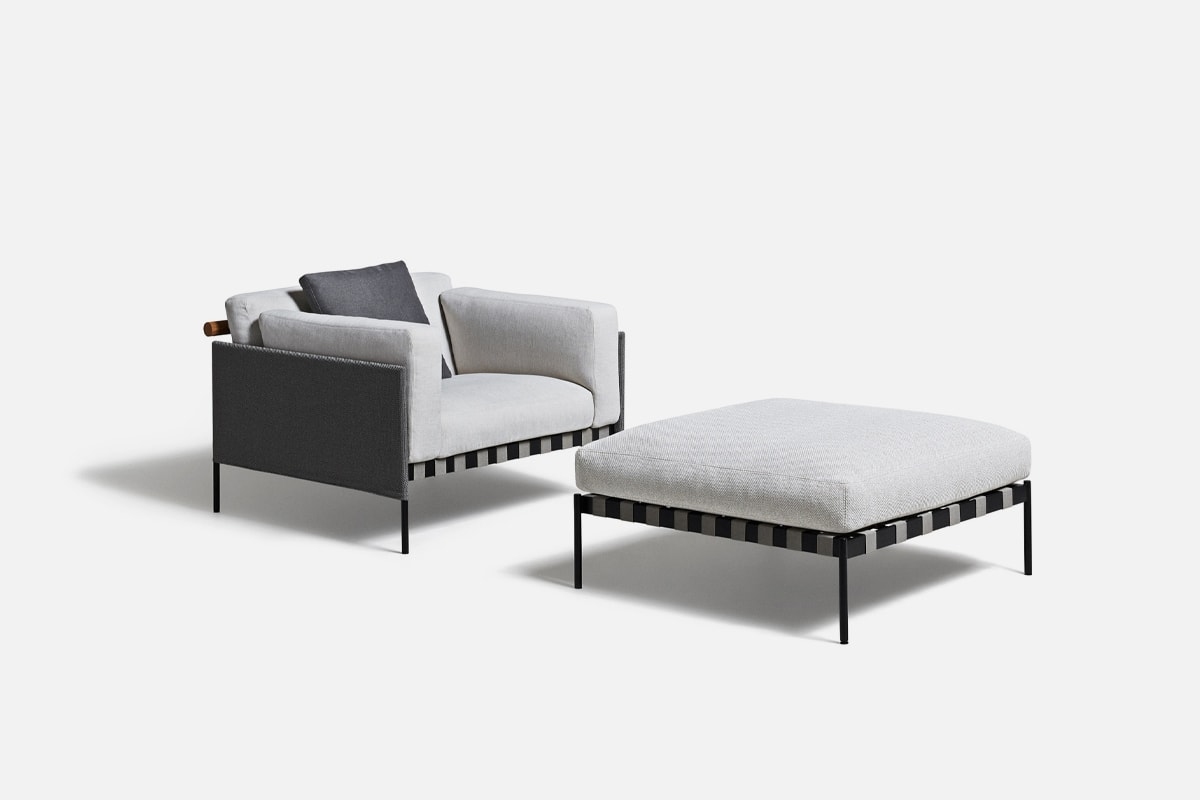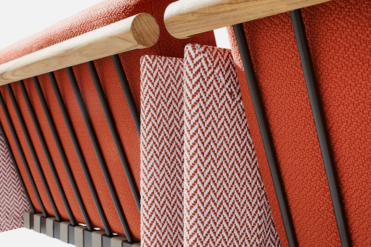 Etiquette Outdoor Кресло DePadovaEtiquette Outdoor, разработанное Гамом Фратези для DePadova, представляет собой кресло для улицы с черной структурой из нержавеющей стали, спинкой из массива натурального тикового дерева, обработанного маслом, и регулируемыми ножками из металла, окрашенного в матовый черный цвет. Подушки сиденья и спинки изготовлены из съемных чехлов с наружной тканью различной отделки. Пуф также доступен в такой же отделке.