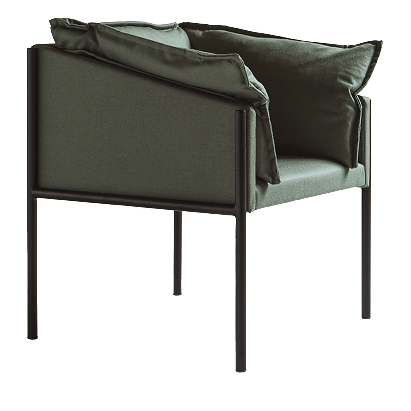 Строгий скульптурный силуэт отличает это изысканное кресло – безупречное дополнение к современной гостиной, как частной, так и офисной. Деревянный каркас, заключенный в цилиндрический металлический каркас, покрытый матовым черным лаком, наполнен пенополиуретаном и полиэстеровым волокном, а затем обтянут устойчивой к пятнам зеленой тканью. Мягкая подушка, набитая стерилизованными гусиными перьями, обеспечивает непревзойденный комфорт. Другие цвета доступны по запросу у консьержа.