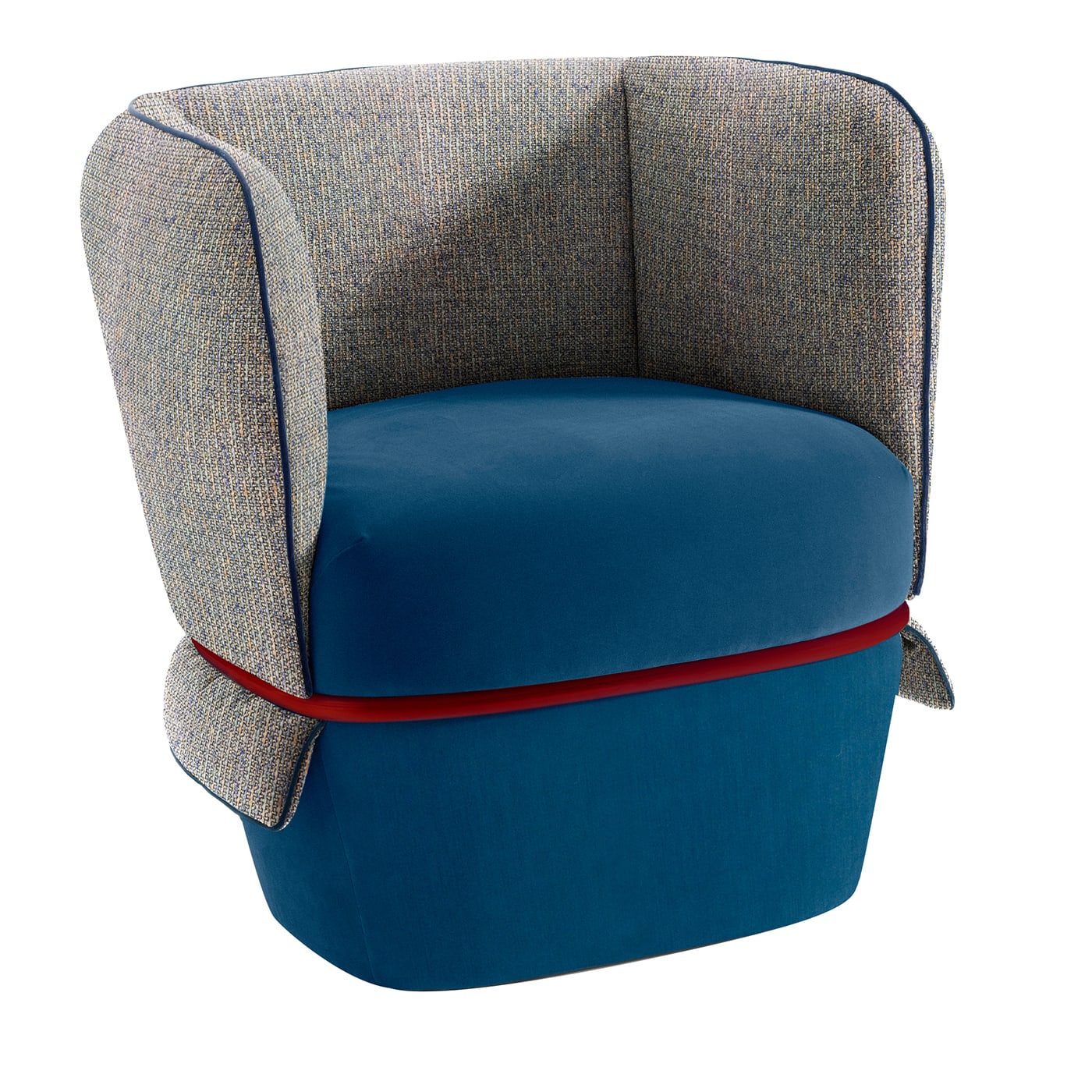 Этот яркий и эклектичный дизайн студии LI_DO станет ярким акцентом в современном интерьере. Деревянный каркас кресла скреплён красным лакированным стальным кольцом, мягкий наполнитель из пенополиуретана и полиэфирного волокна, а также массивное основание с высокой, удобной спинкой. Сиденье обито синим бархатом, а спинка — серо-голубой вышитой тканью.