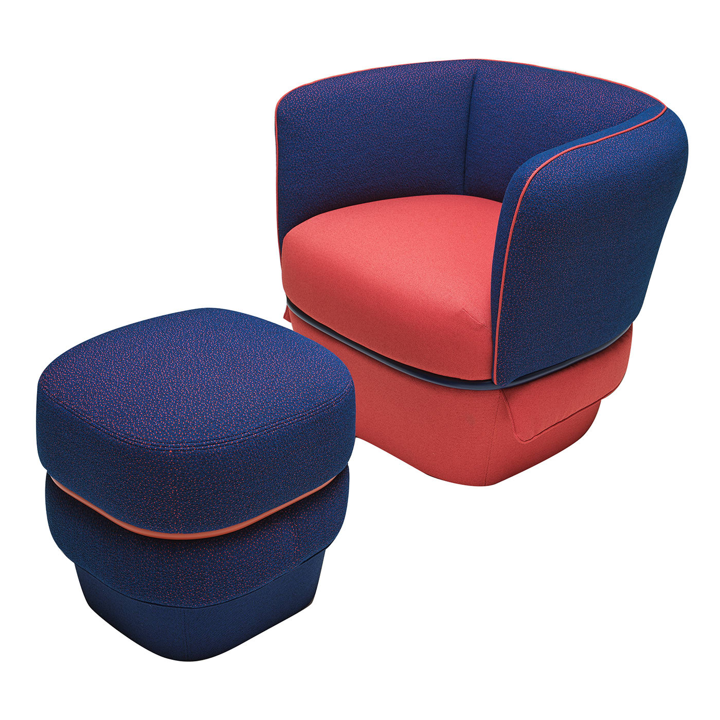 Этот комплект из кресла и пуфа от студии LI_DO – потрясающий образец современного дизайна: эклектичный, но гармоничный благодаря двухцветной палитре, узорчатым деталям и экстравагантным, извилистым формам, он отличается универсальностью и неподвластным времени характером. Оба изделия имеют деревянный каркас, набитый пенополиуретаном и полиэстеровым волокном, и стальное кольцо, поддерживающее каркас. Тканевая обивка сочетает в себе ткань Kvadrat Messenger кораллового цвета и вышитый синий цвет.