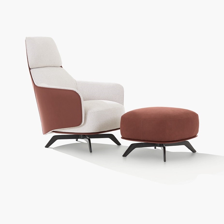 Кресло Kaori Lounge PoliformKaori Lounge, разработанное Жаном Мари Массо для Poliform, представляет собой кресло с компактной полиуретановой оболочкой и гибкой полиуретановой вставкой. Подушка сиденья из гибкого полиуретана различной плотности, детали предварительно покрыты хлопковым полотном с перьями. Подсиденье из дерева и его производные, обтянутые цветной кожей. Поворотное основание с возвратом или фиксированное, из стали, окрашенной в матово-коричневый никель, ножки из алюминия, окрашенного в матово-коричневый никель. Несъемная внешняя обшивка корпуса из цветной кожи, съемная внутренняя обшивка корпуса и сиденье из ткани.
