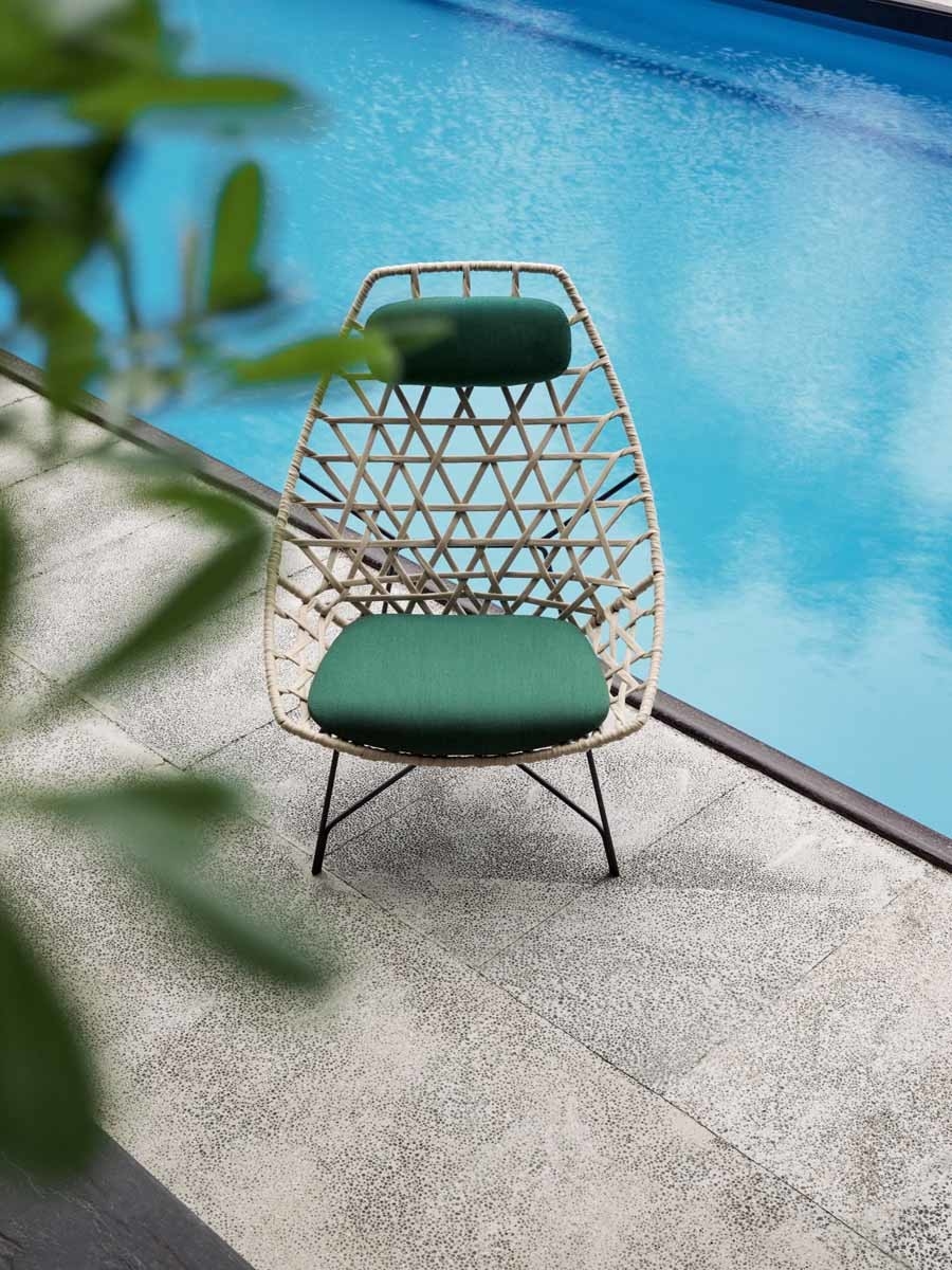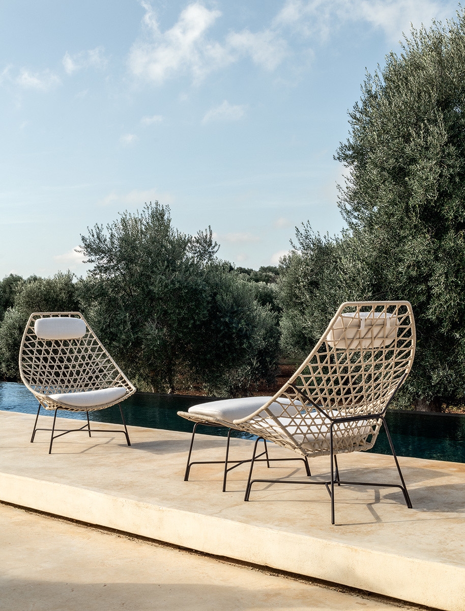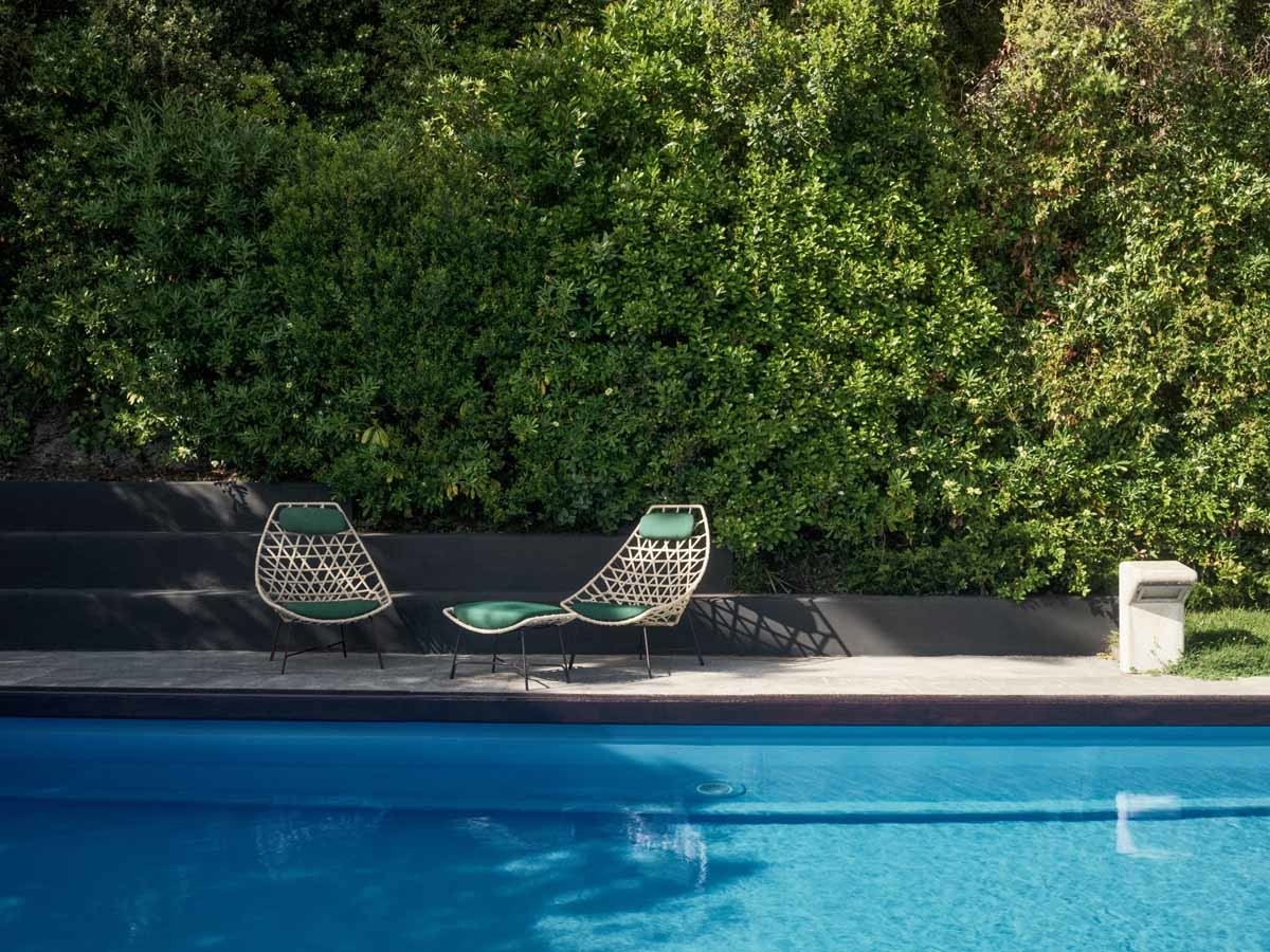 Кресло Cut Potocco BergèreCut, разработанное Стефаном Фейтом для Potocco, представляет собой кресло-бержер со структурой из стального стержня, окрашенного эпоксидными порошками и переплетенного бежевой лентой гасса. Подушка сиденья и подголовник выполнены из огнеупорного пенополиуретана, покрытого различными тканями для улицы.