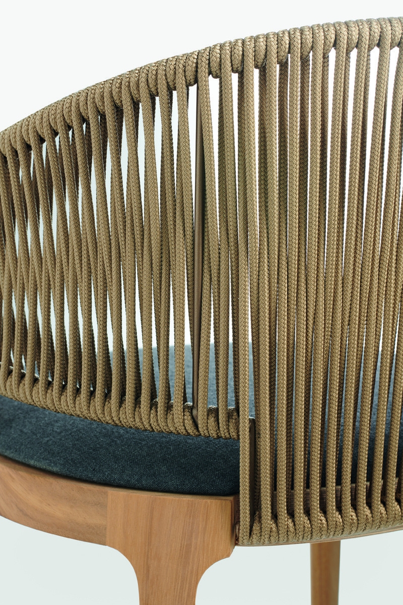 Velis Outdoor Potocco PoltronaVelis, разработанный Марио Феррарини для Potocco, представляет собой кресло для улицы с конструкцией из массива дерева ироко. Спинка изготовлена из окрашенного металла и оплетена газовой или пеньковой веревкой. Сиденье имеет огнестойкую подкладку из вспененного полиуретана и покрыто различными типами уличной ткани.