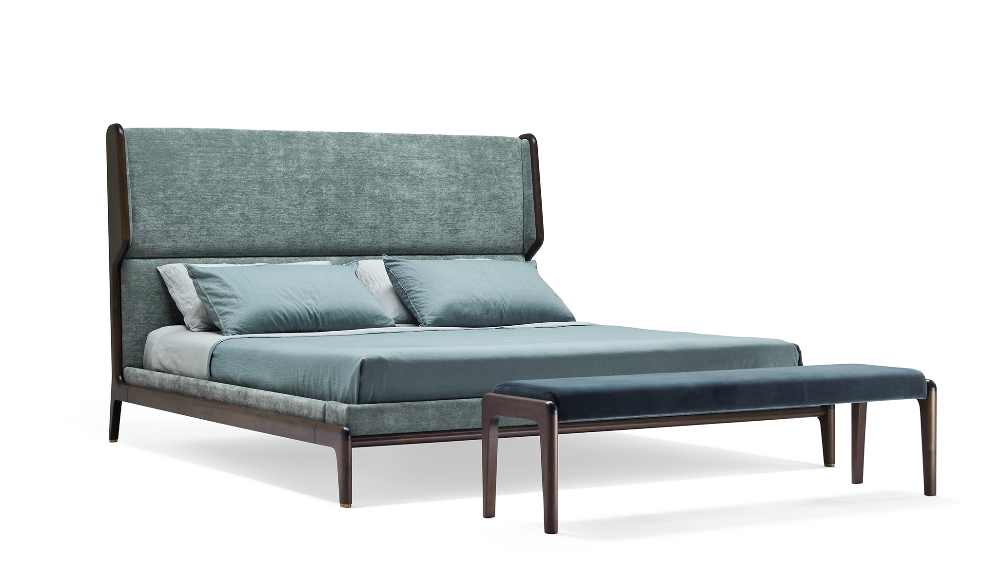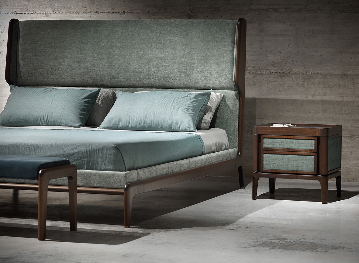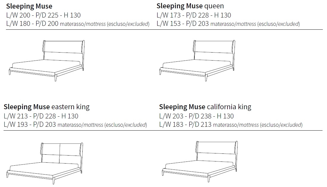 Sleeping Muse, разработанная Роберто Лаццерони для Ceccotti Collezioni, представляет собой кровать из массива американского ореха с поверхностью из шпонированной фанеры, мягким изголовьем и полосами по периметру, покрытыми тканью или кожей.