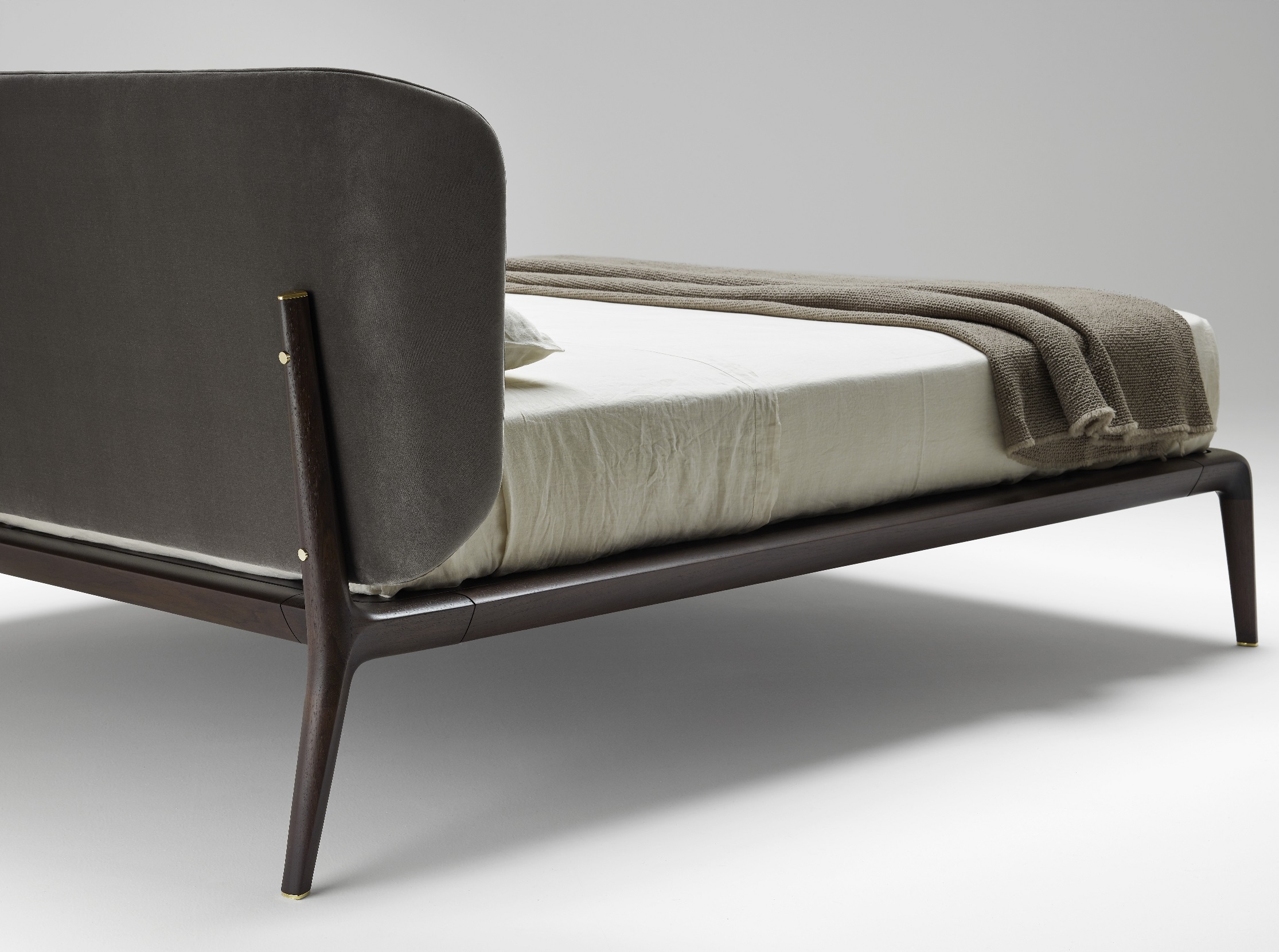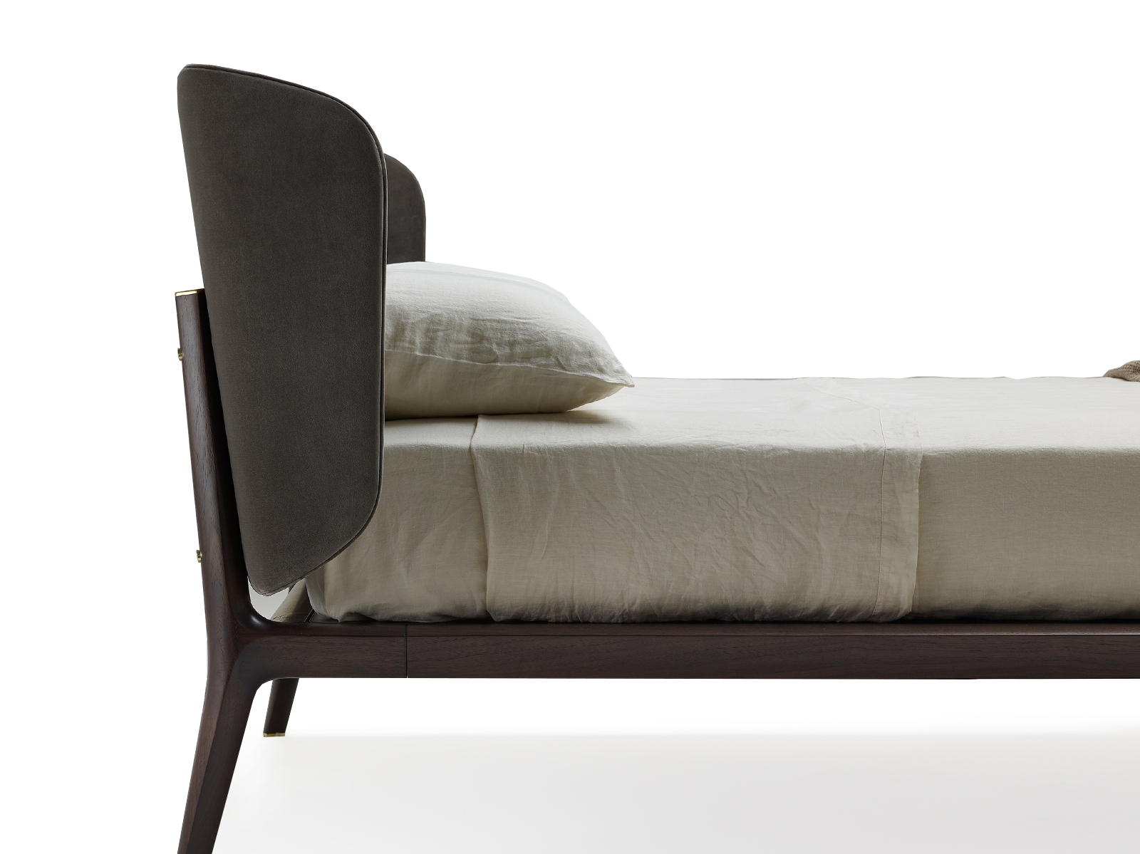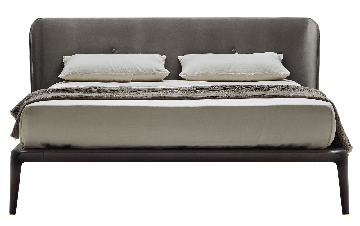 Спинка кровати имеет мягкую обивку, что добавляет удобства. Четкие контуры и лаконичные детали делают изделие универсальным для разных интерьеров. Кровать доступна в различных отделках, что позволяет выбрать подходящий вариант для спальни.