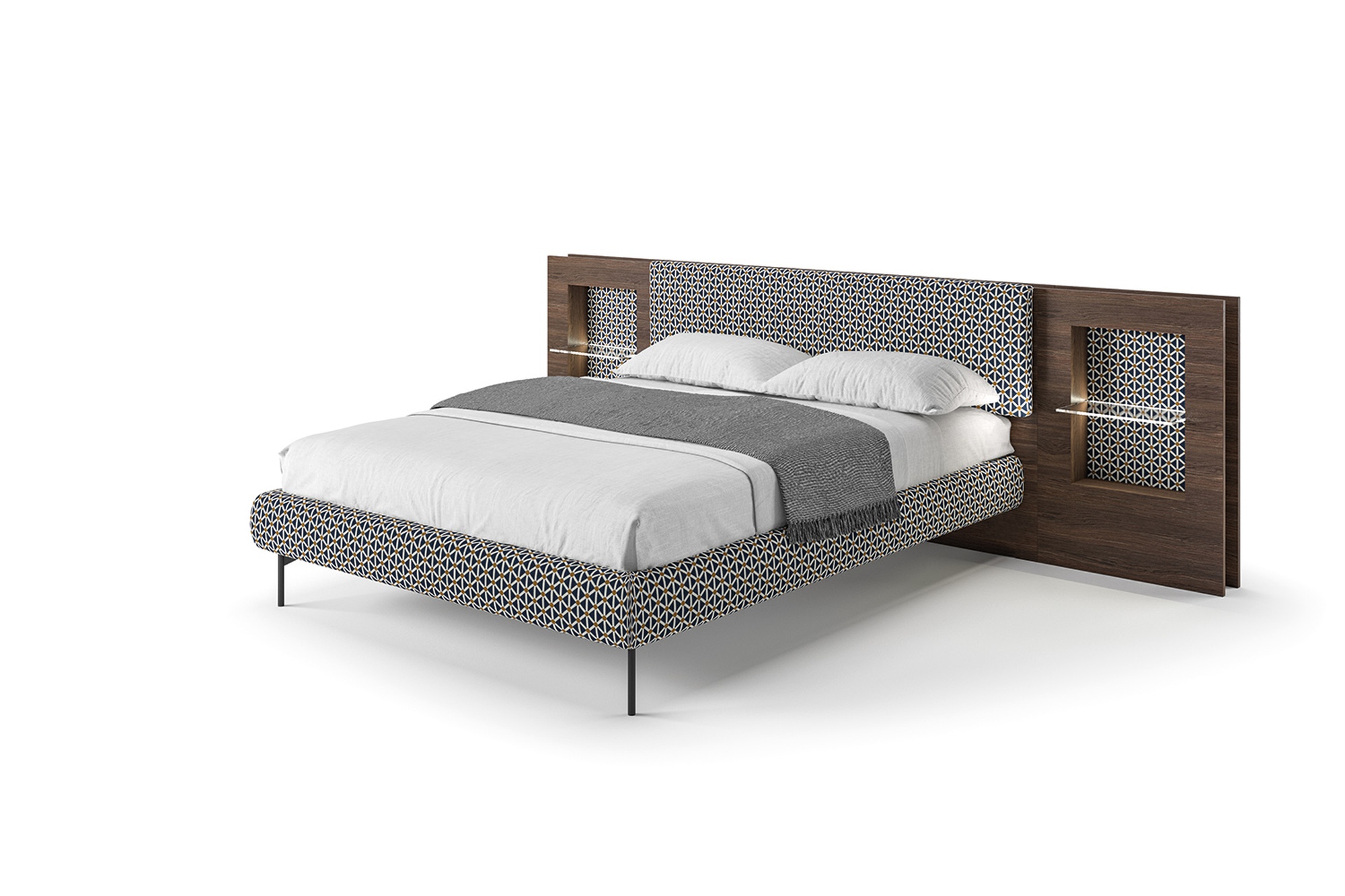 Конструкция кровати поражает своей универсальностью: каркас может быть выполнен как в деревянной отделке, так и в мягком исполнении с тканевым покрытием. Особую элегантность модели придаёт центральная металлическая ножка в сочетании со светодиодной подсветкой, встроенной в стеклянные полки.