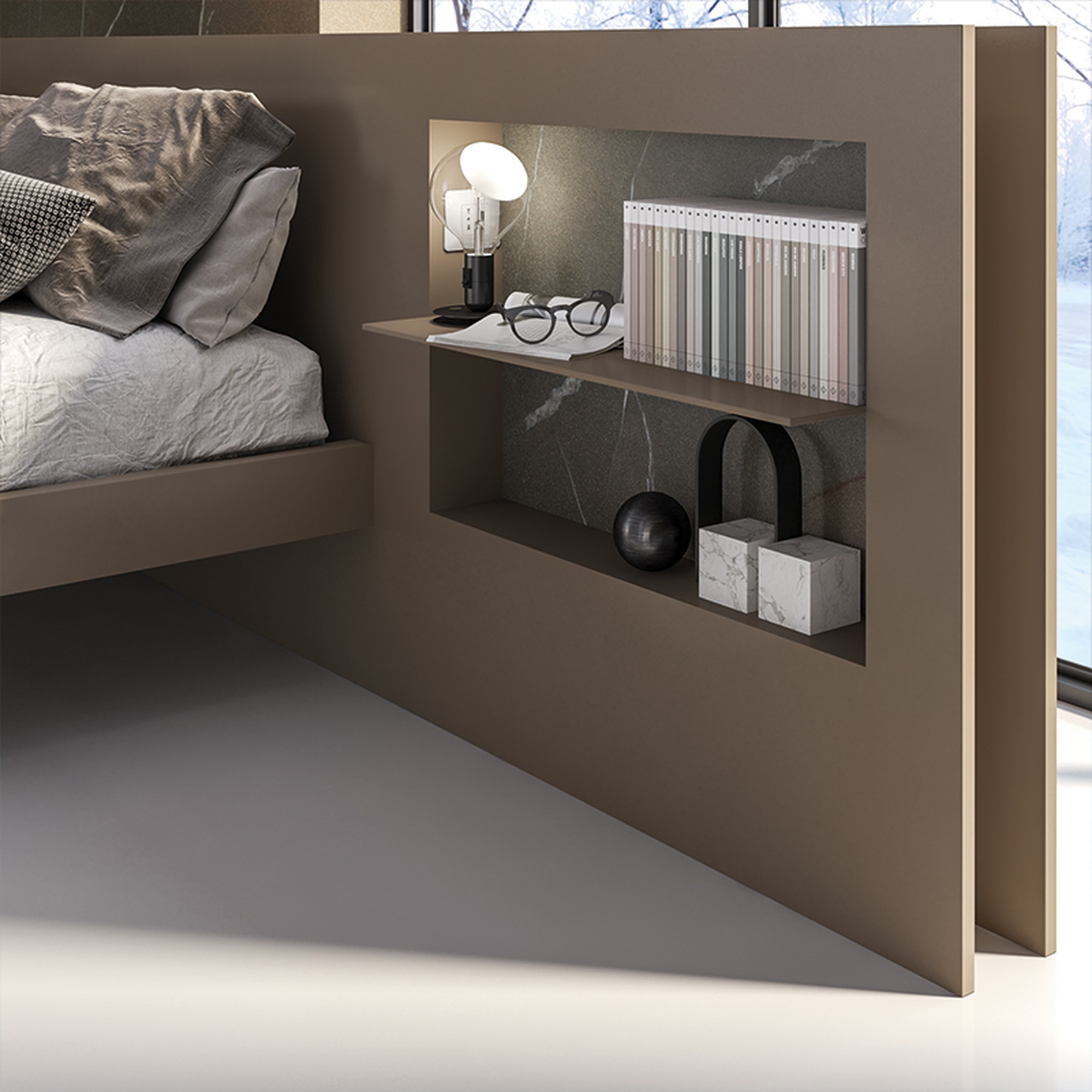 Боковые элементы дополнены практичными нишами с полками, где можно разместить необходимые аксессуары. Опциональные розетки Schuko и USB-порты обеспечивают удобство использования современных гаджетов.