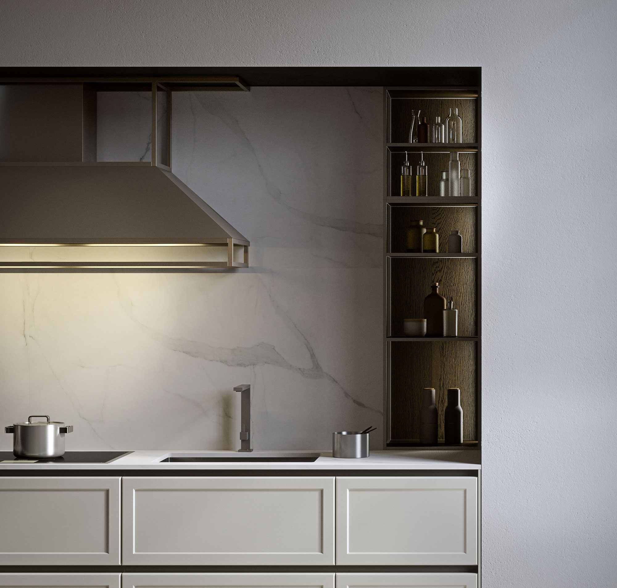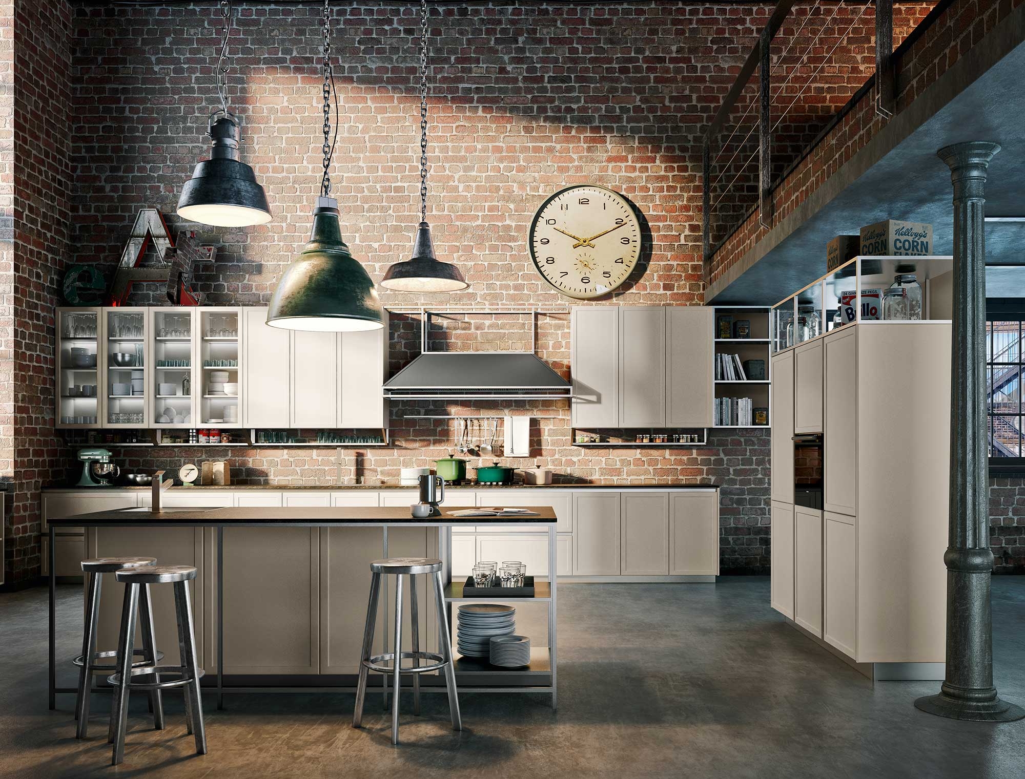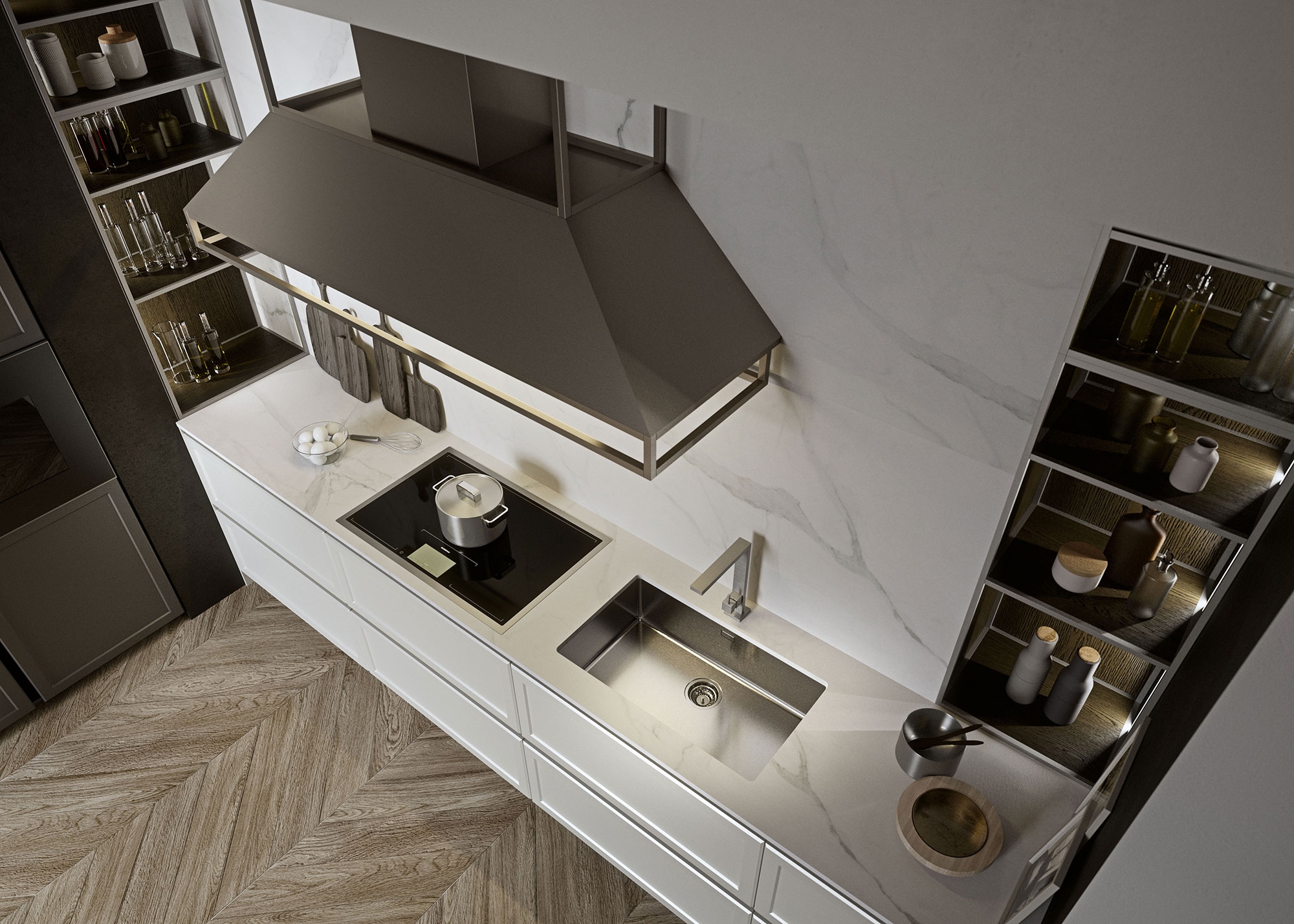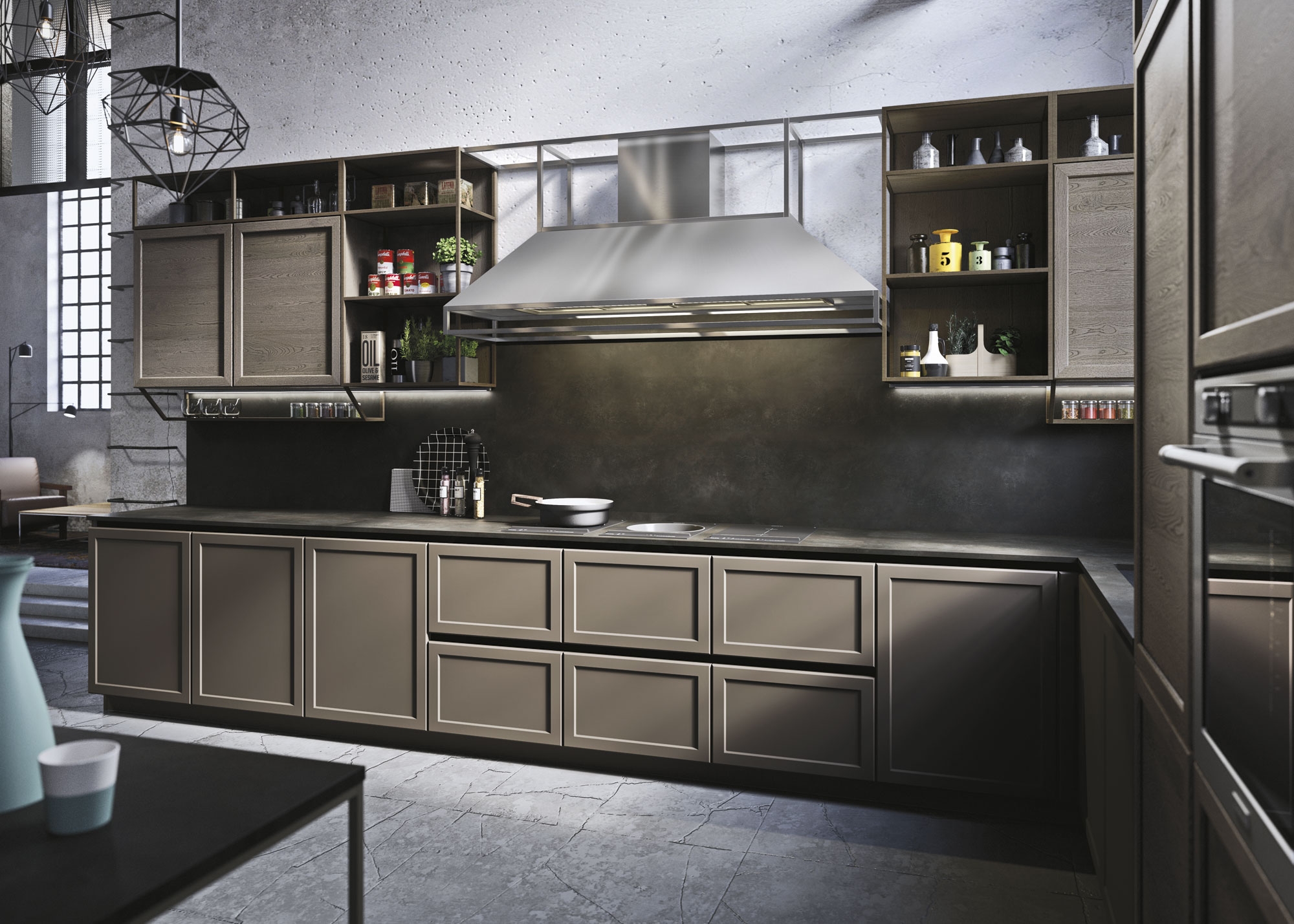 Frame Snaidero CucinaKelly, разработанная Массимо Иозой Гини для Snaidero, представляет собой кухню, которая является выражением классической домашней обстановки с элементами индустриального шика. Столешницы могут быть из керамики, кварца, нержавеющей стали, ламината с кромкой из АБС-пластика, дерева, мрамора, гранита или твердой поверхности.