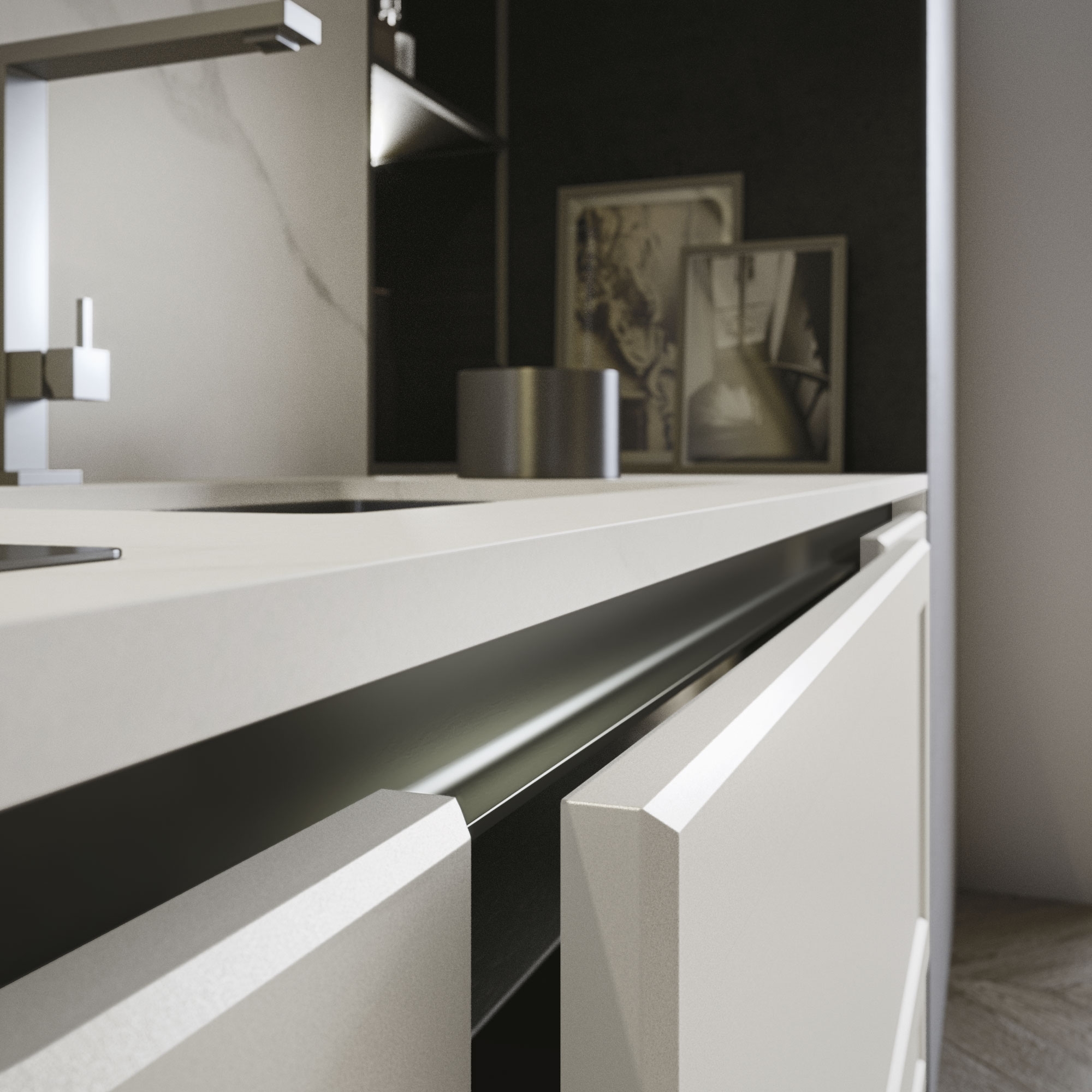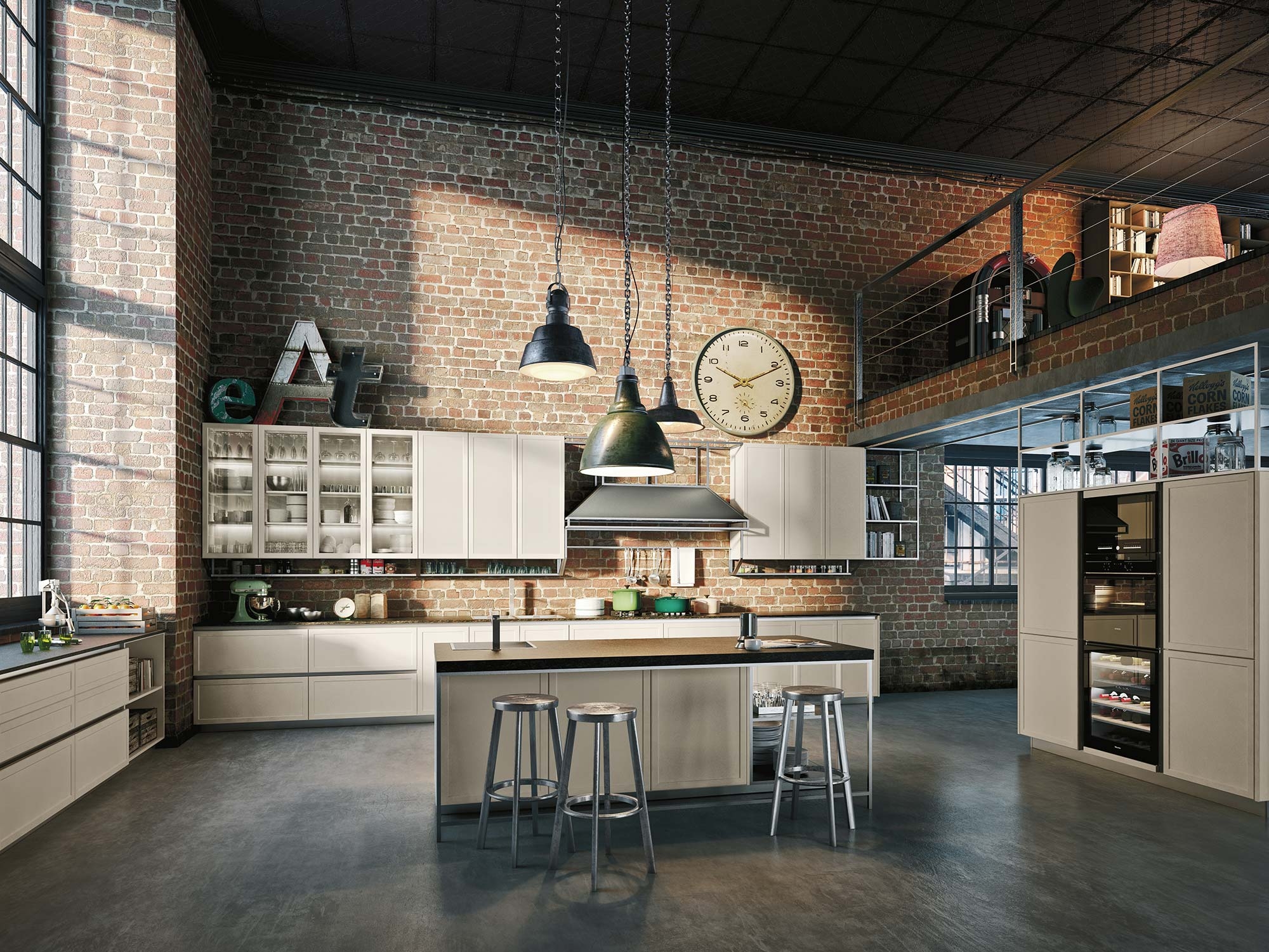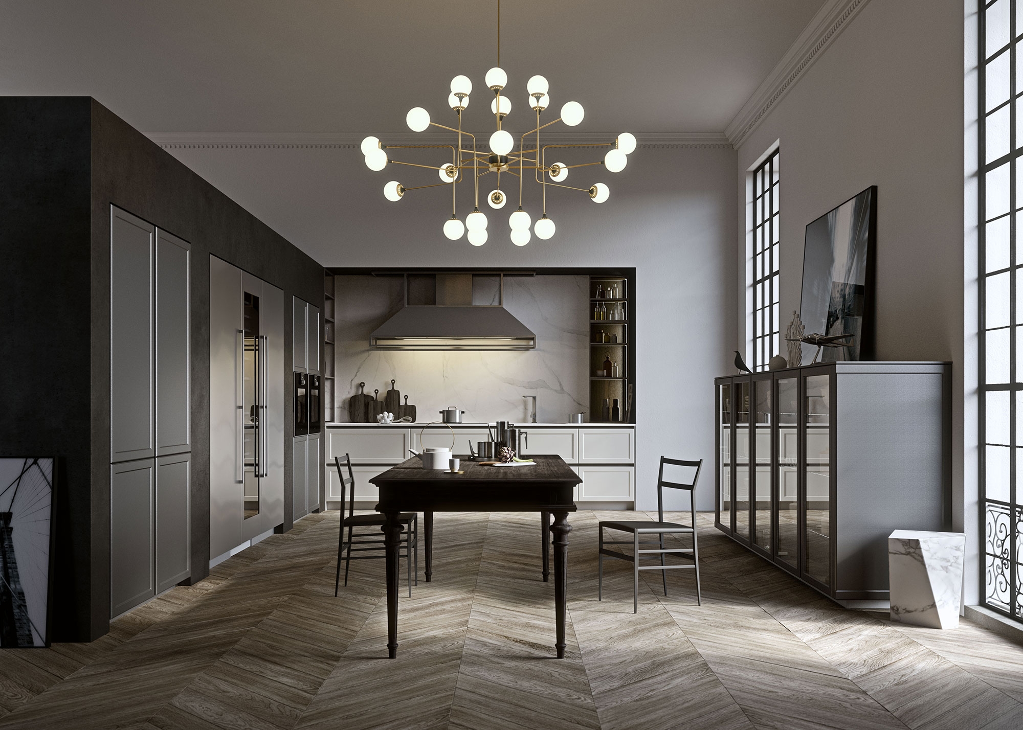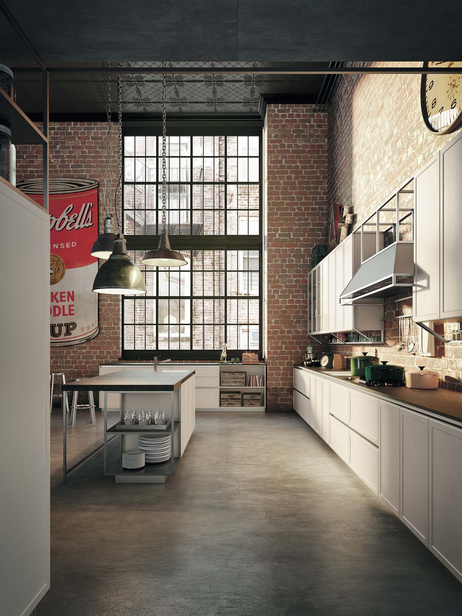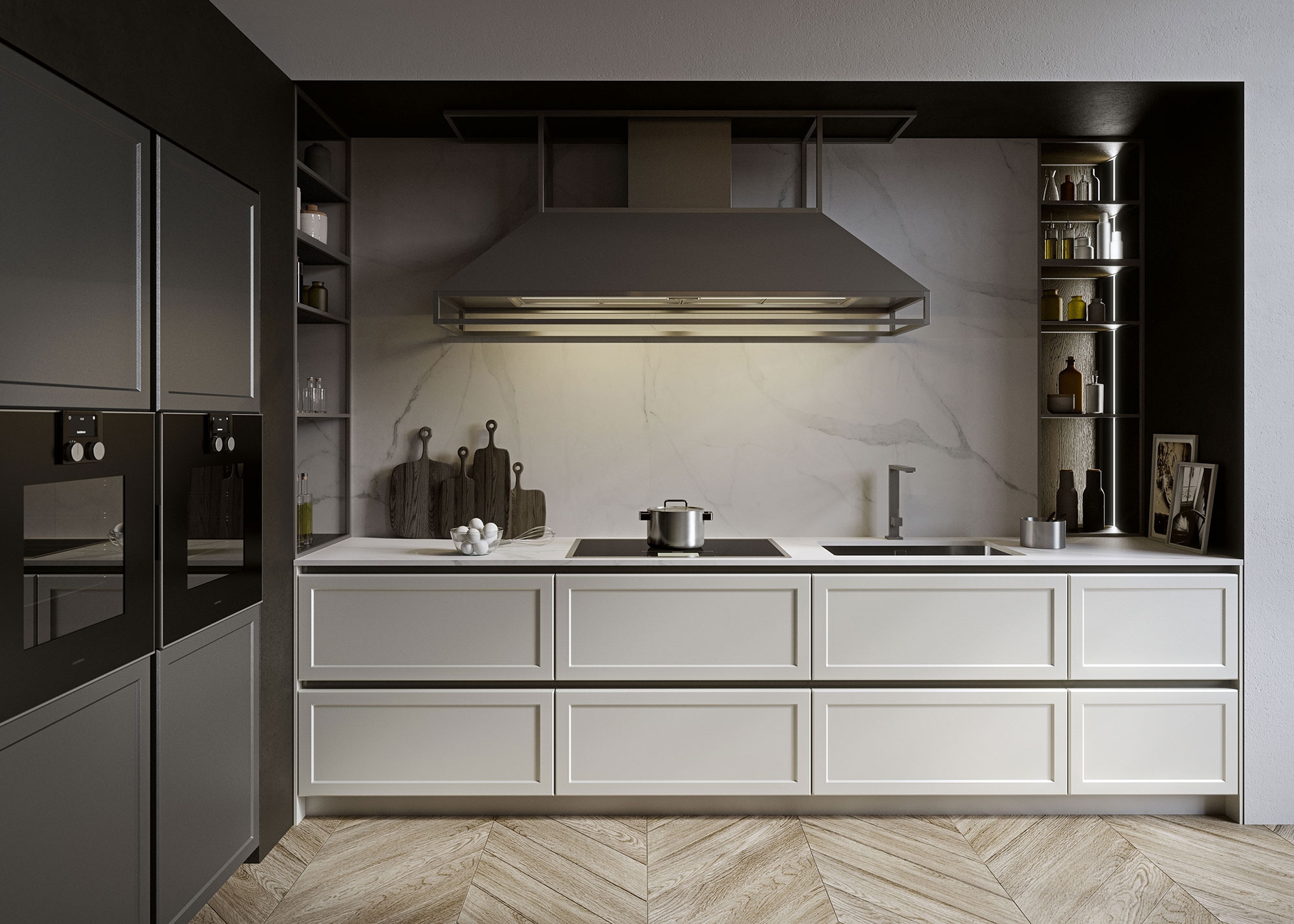 Frame Snaidero CucinaKelly, разработанная Массимо Иозой Гини для Snaidero, представляет собой кухню, которая является выражением классической домашней обстановки с элементами индустриального шика. Столешницы могут быть из керамики, кварца, нержавеющей стали, ламината с кромкой из АБС-пластика, дерева, мрамора, гранита или твердой поверхности.