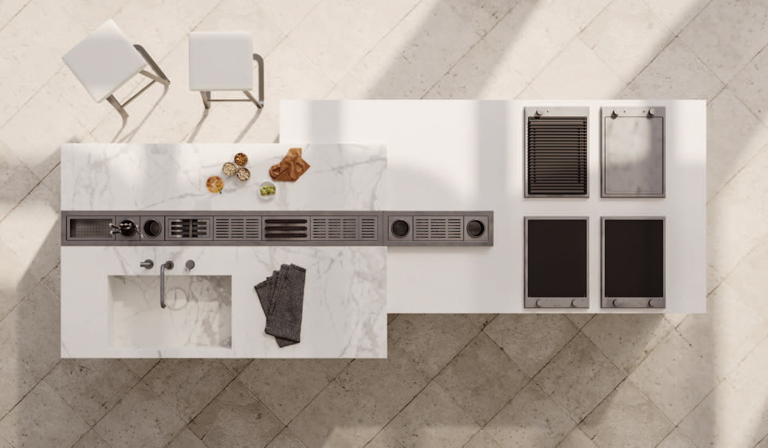 - гармоничная интеграция зоны приготовления пищи с жилой зоной и открытым пространством.