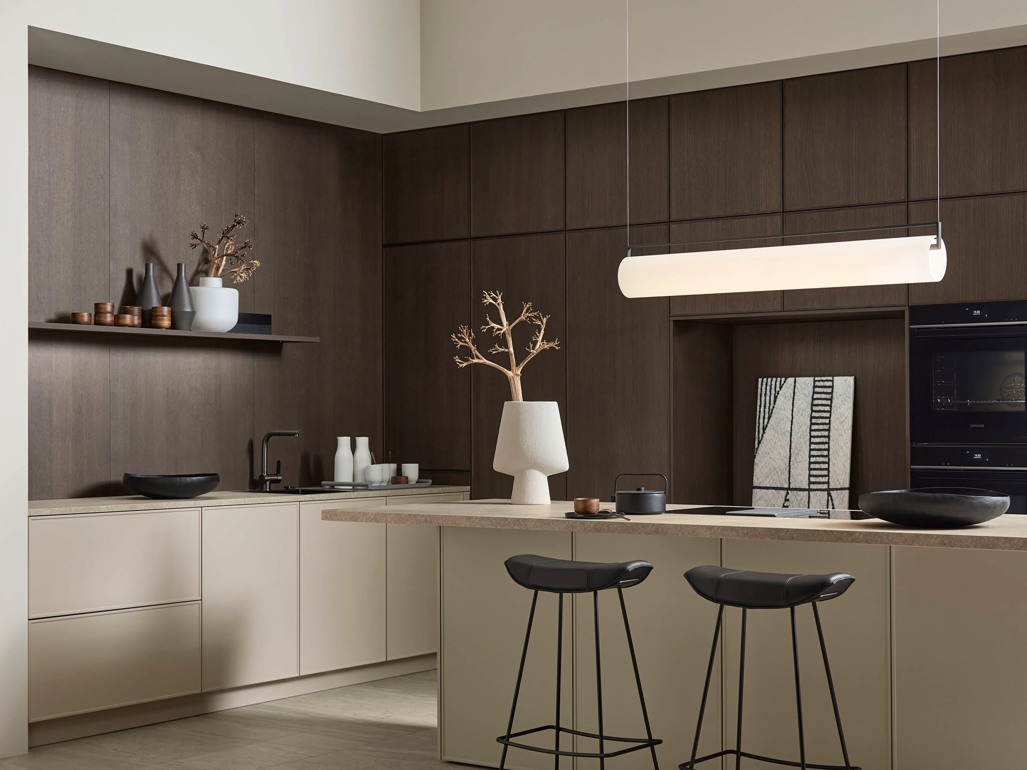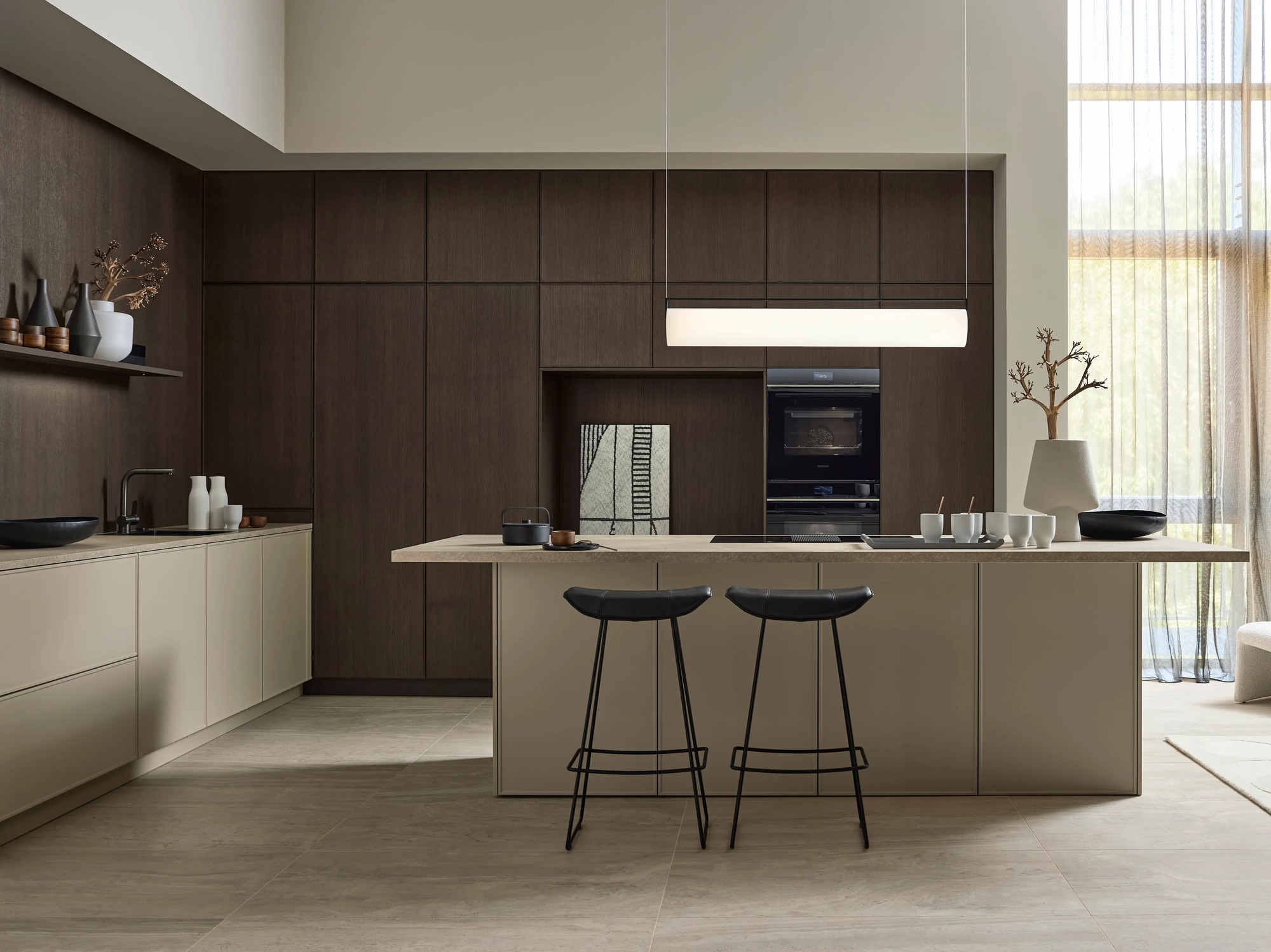 Кухня neoSLIM Oak Tobacco от фабрики Nolte — воплощение сдержанной элегантности в современном дизайне. Гарнитур с фасадами из шпона тёмного дуба создаёт благородный, вневременной образ, гармонично сочетаясь с актуальными стилистическими решениями.