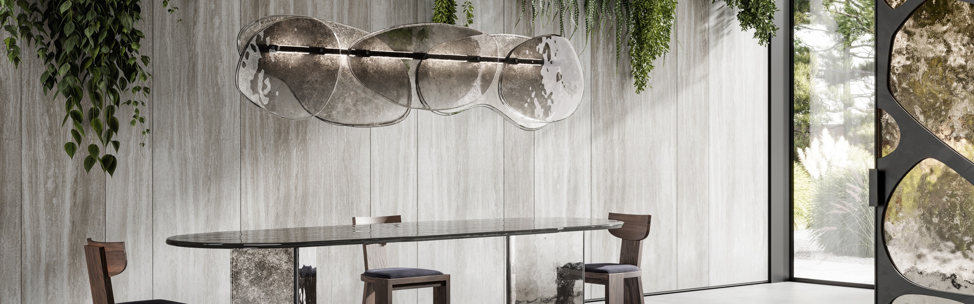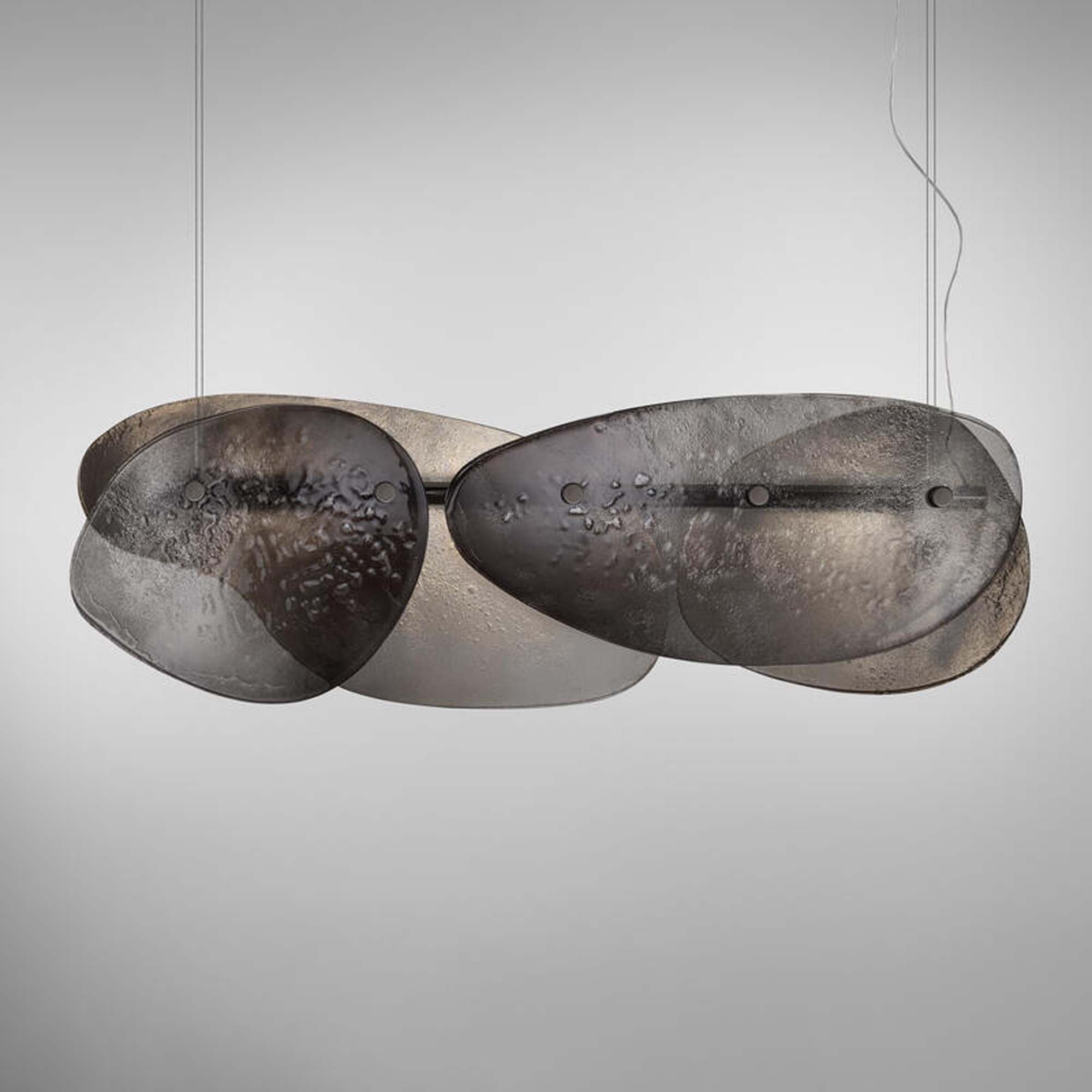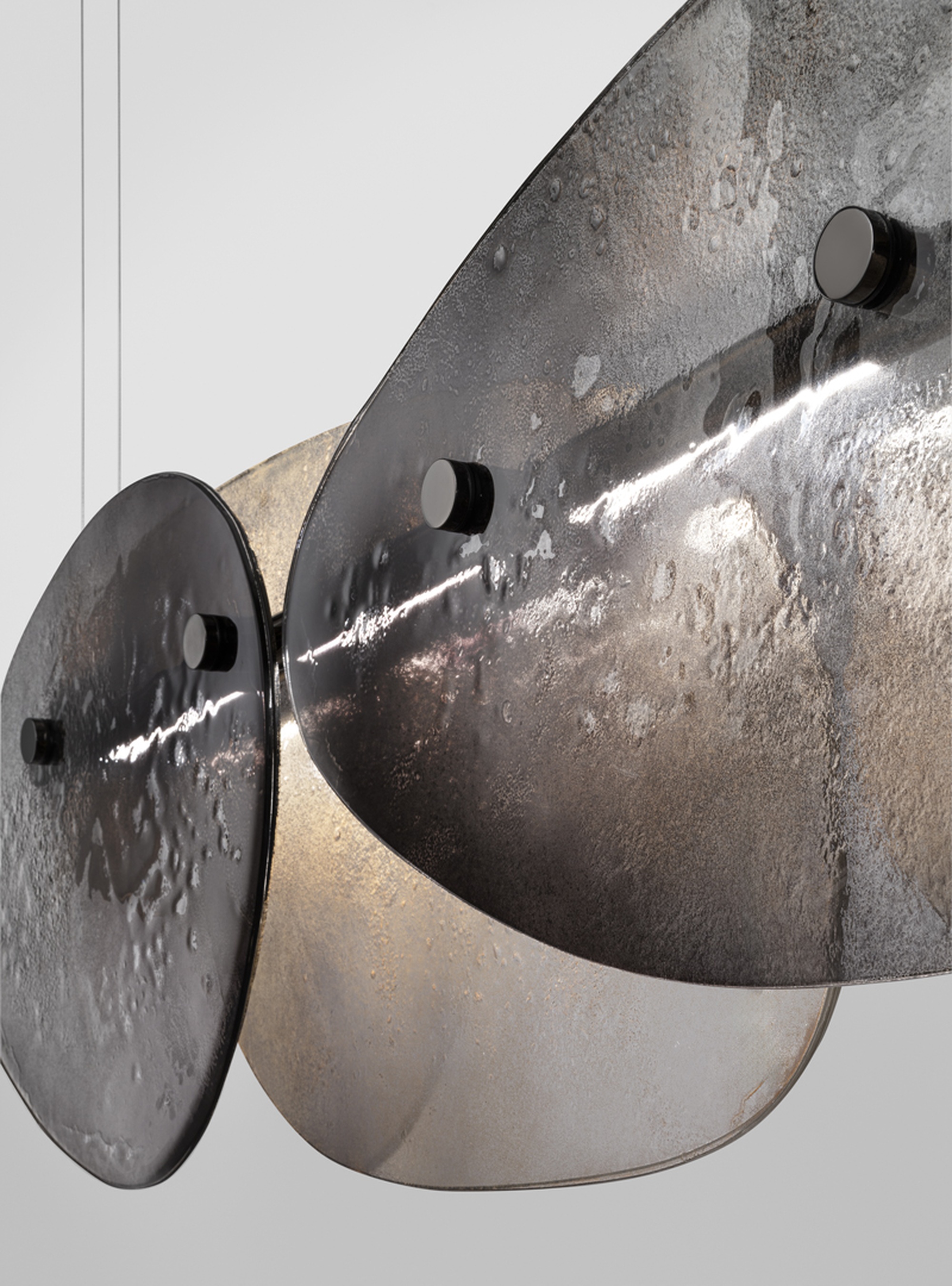 Люстра Floretta — это высокохудожественный светильник, где инновационные материалы встречаются с безупречным дизайном. Ее сердце — декоративные элементы из обожженного стекла, сформированные в два слоя с намеренно неровными краями. Эффект градиента от свинцово-серого до полностью прозрачного дополнен частичным серебрением на обратной стороне, создавая игру света и глубину. Полированная рама из черного никеля и встроенная LED-подсветка на центральной трубе обеспечивают современную эстетику и энергоэффективность.