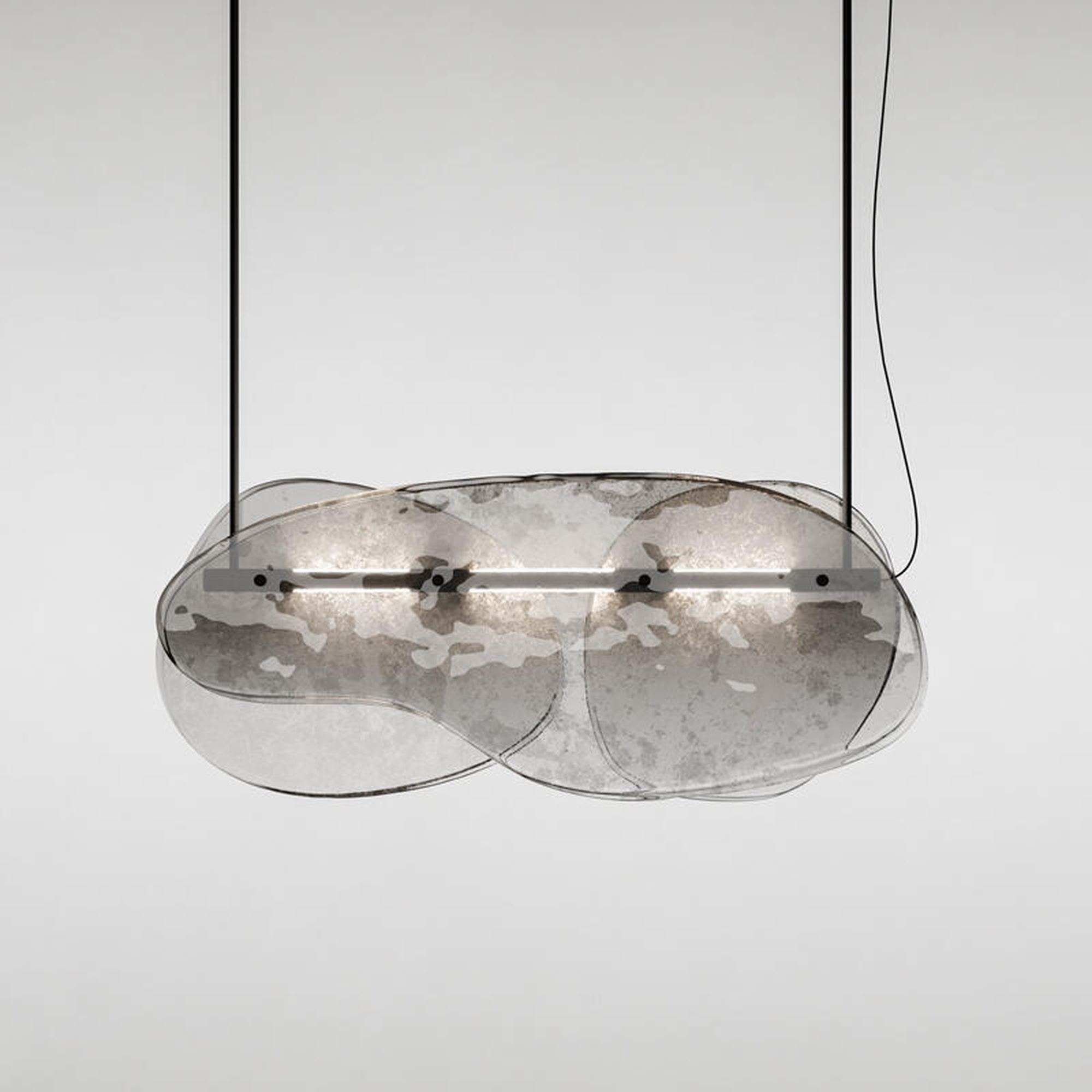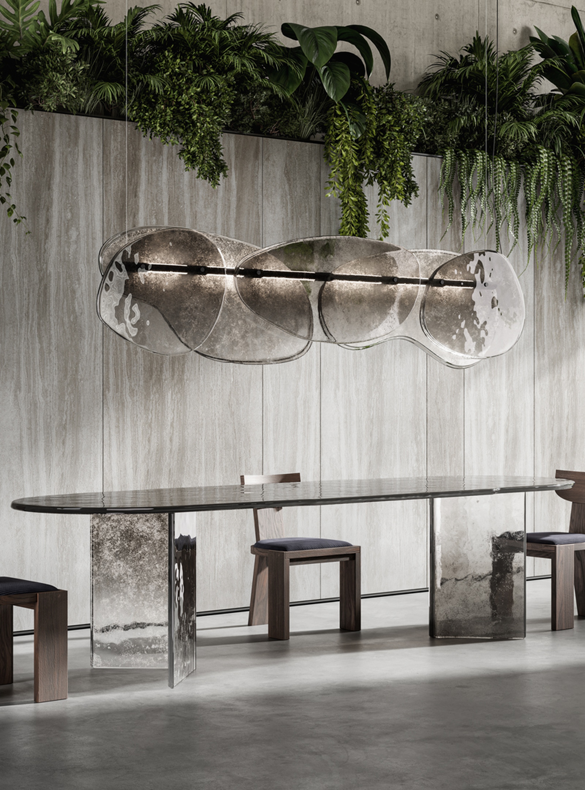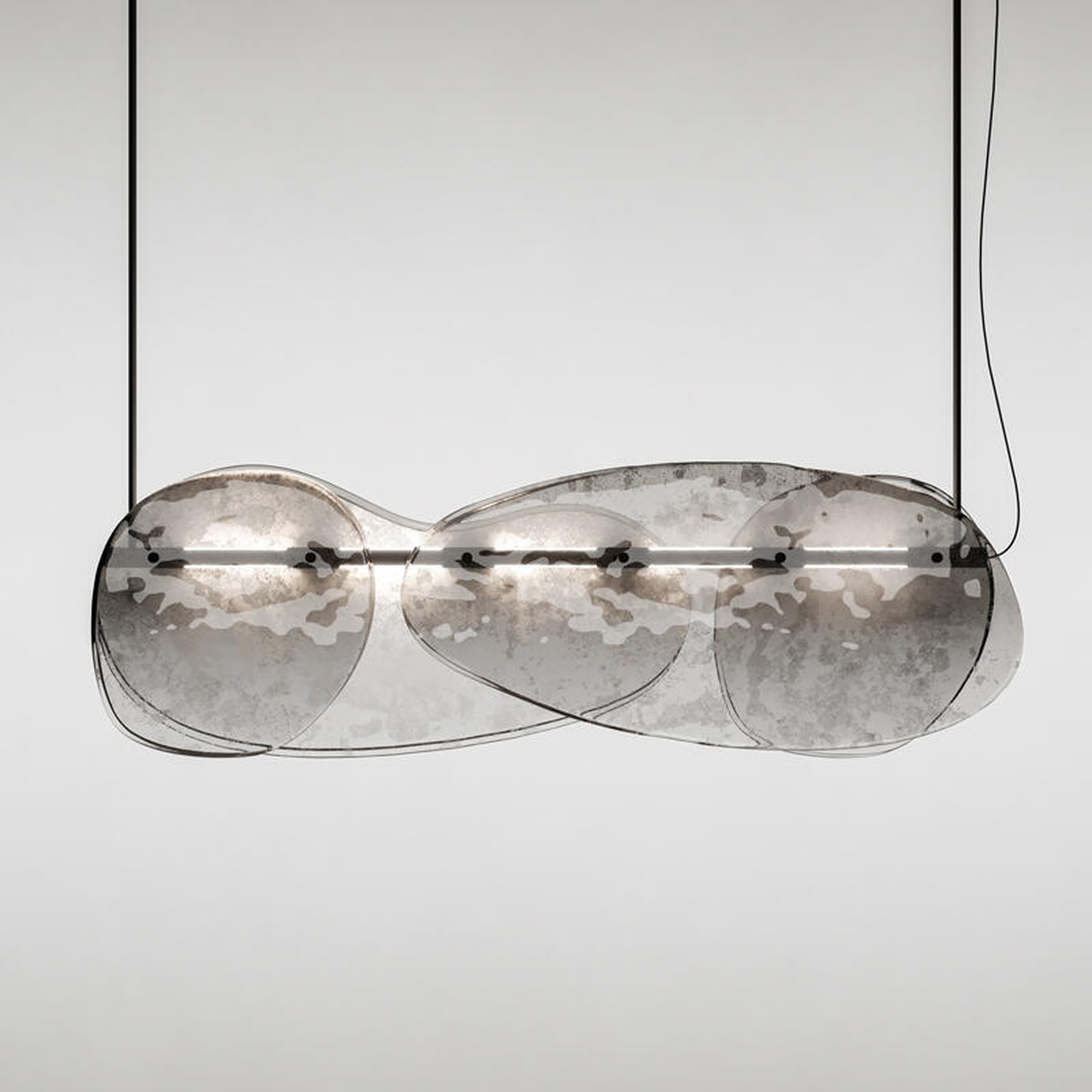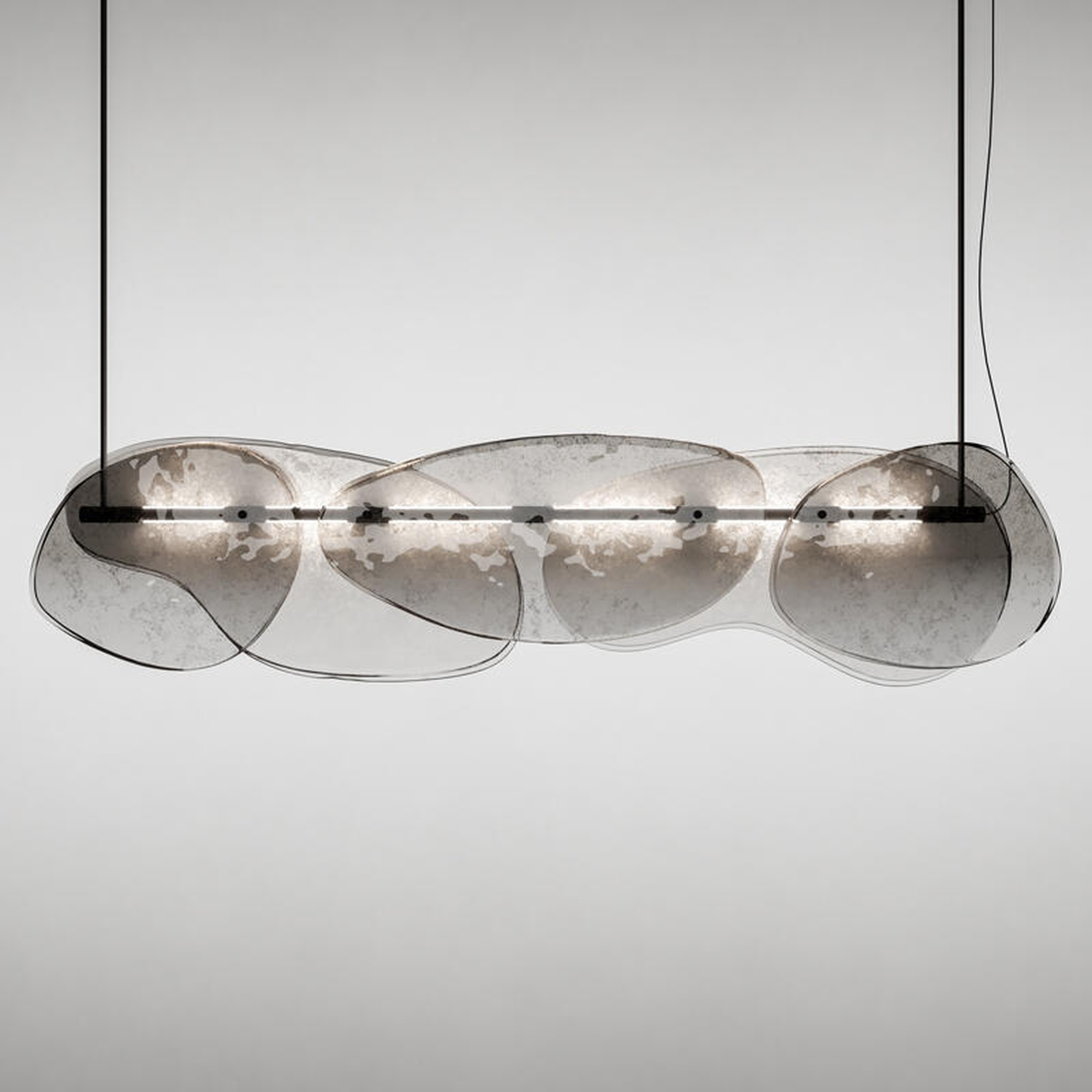 Люстра Floretta — это высокохудожественный светильник, где инновационные материалы встречаются с безупречным дизайном. Ее сердце — декоративные элементы из обожженного стекла, сформированные в два слоя с намеренно неровными краями. Эффект градиента от свинцово-серого до полностью прозрачного дополнен частичным серебрением на обратной стороне, создавая игру света и глубину. Полированная рама из черного никеля и встроенная LED-подсветка на центральной трубе обеспечивают современную эстетику и энергоэффективность.