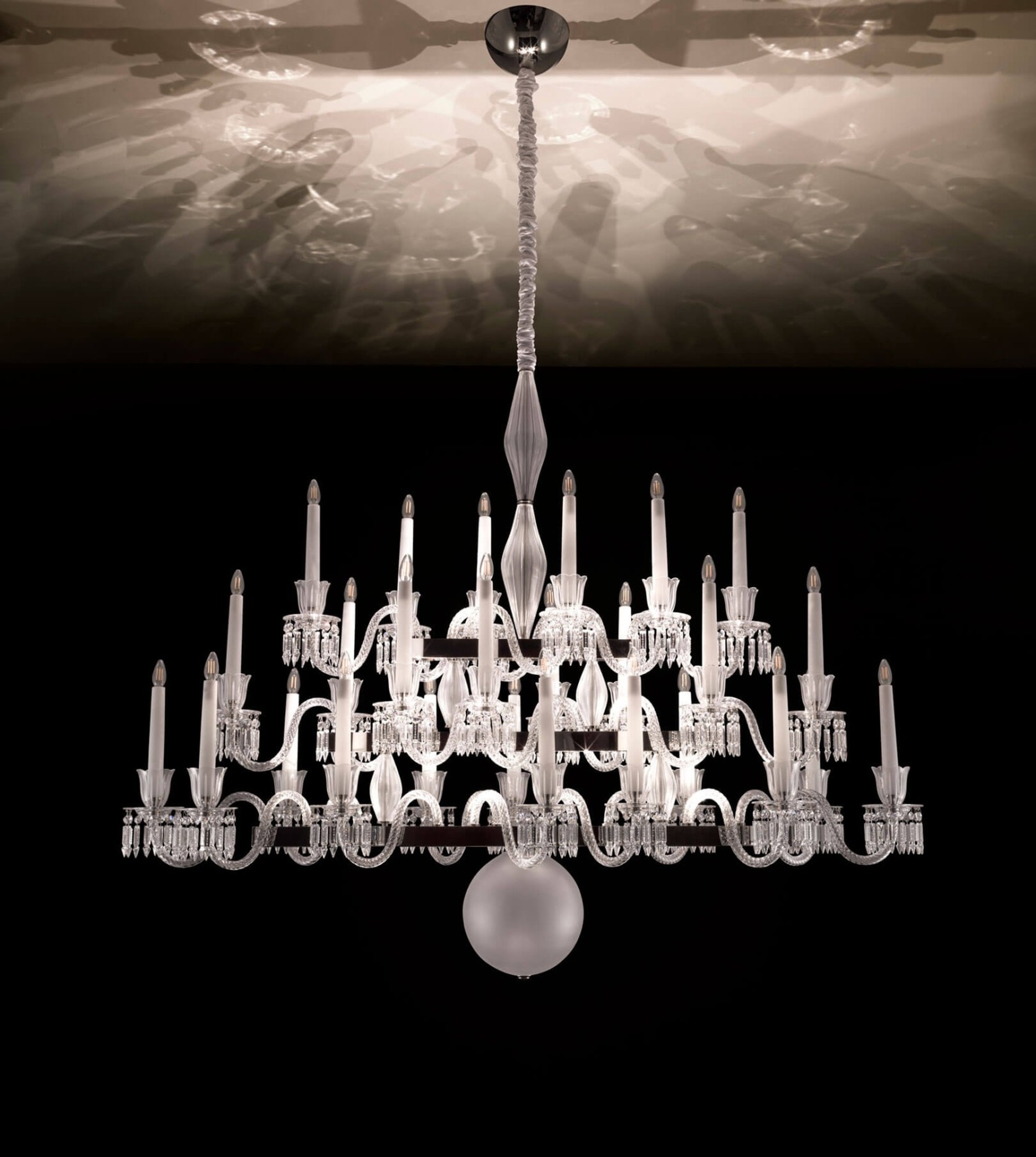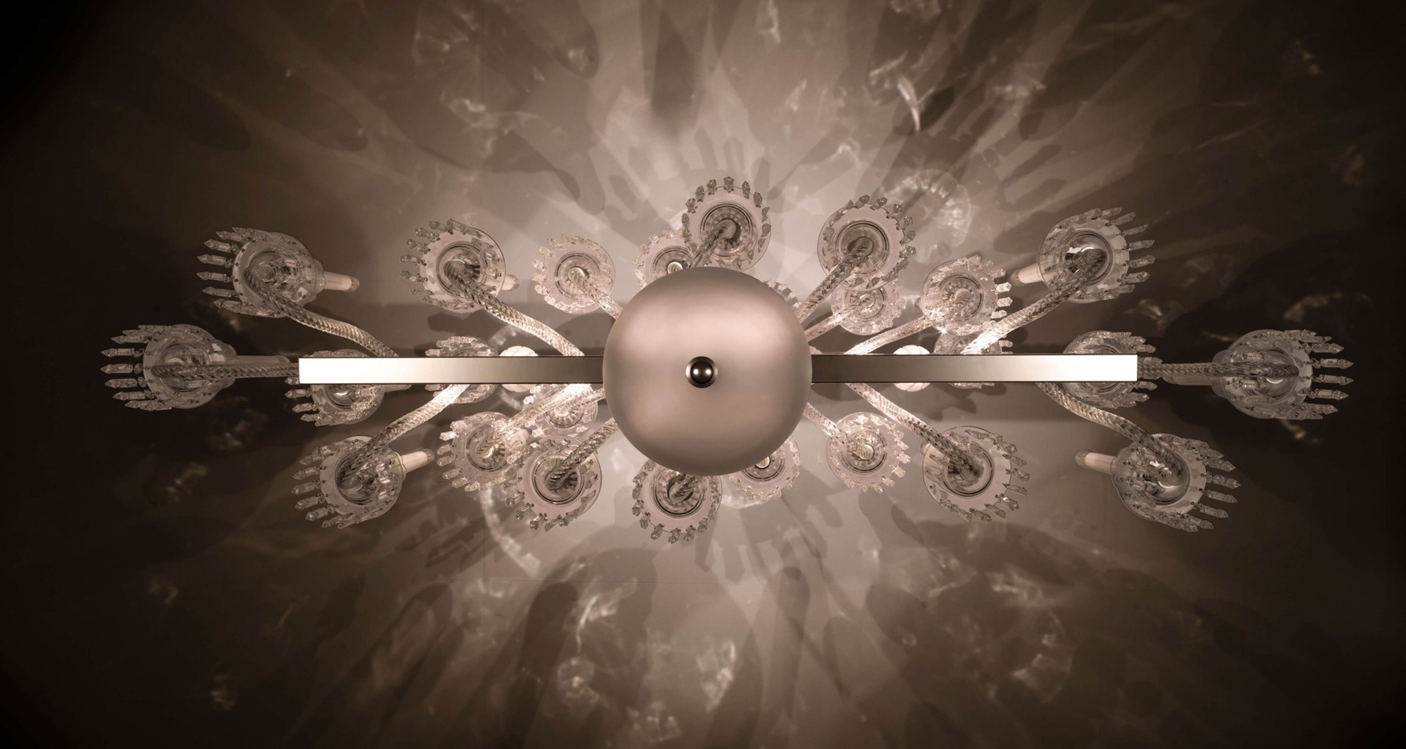 Люстра Keplero от Italamp — воплощение современного дизайна от Роберты Витаделло. Линейная конструкция сочетает художественное стекло, матовое чёрное и прозрачное травлёное стекло с металлической структурой в трёх вариантах отделки: