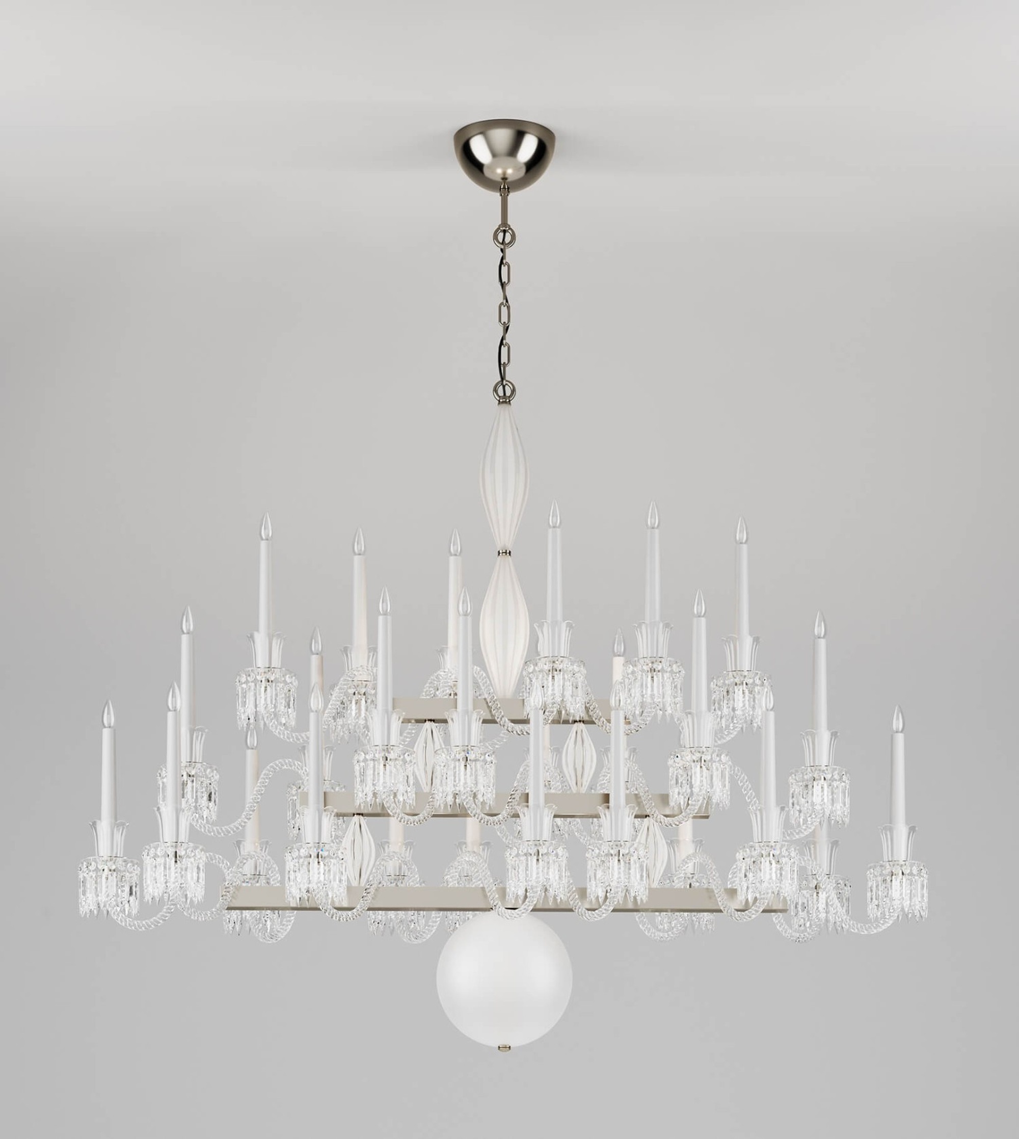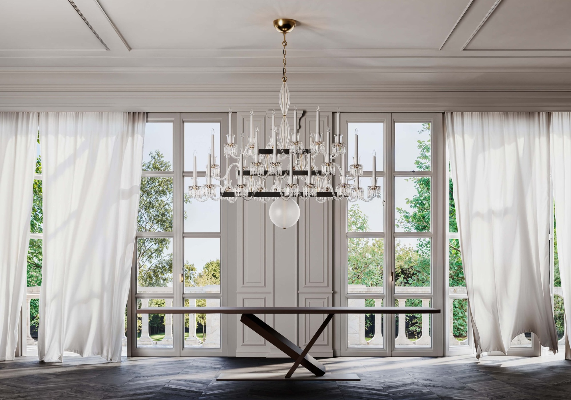 Изысканное сочетание материалов создаёт игру света и тени, а регулируемая высота (10–100 см) позволяет адаптировать люстру под особенности помещения.