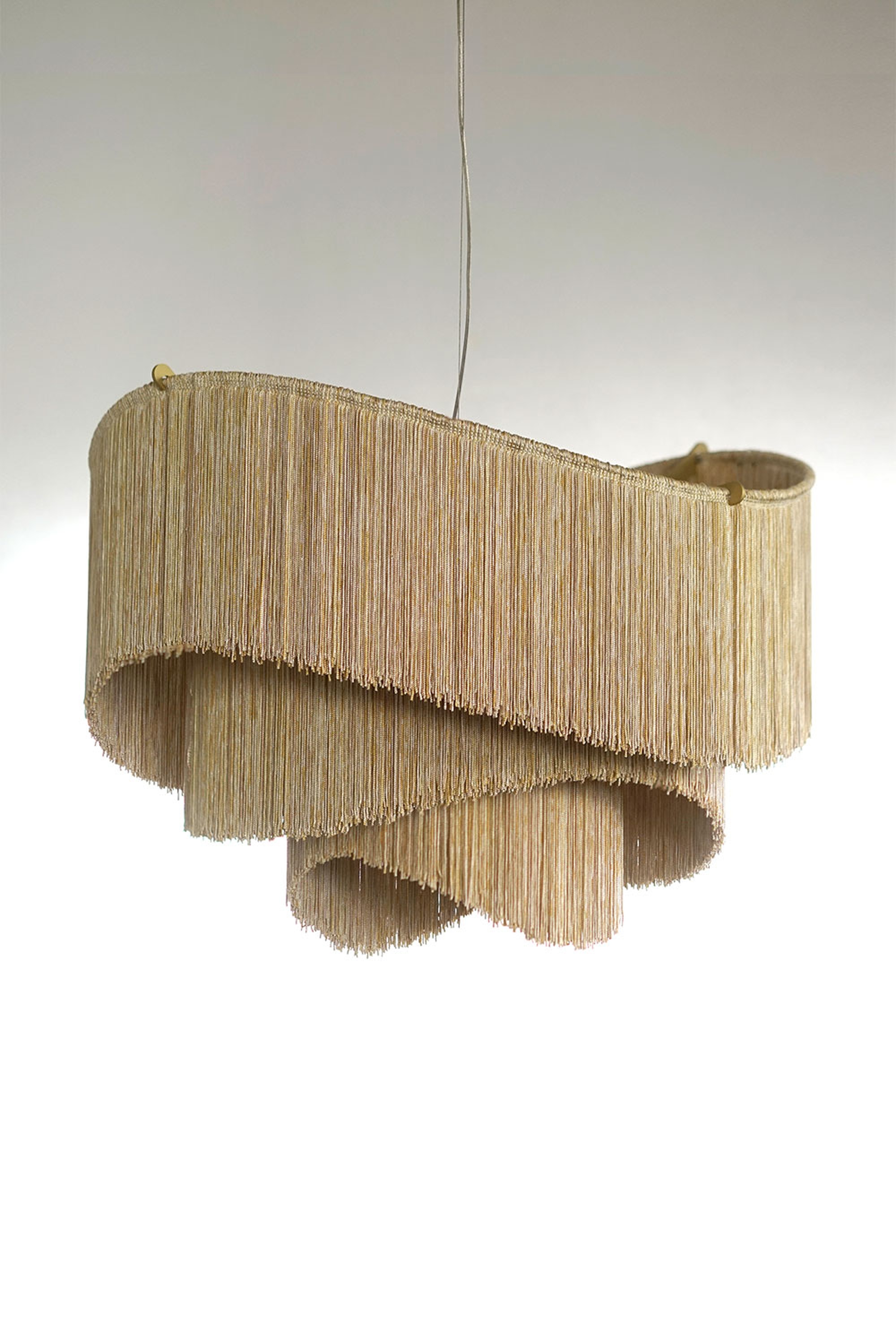 Люстра Maya от фабрики Fraumaier — это воплощение живой легкости. Танцующие в воздухе нити из матового шелка свободно ниспадают тремя изящными дугами, пропуская свет сквозь себя. В отличие от серии Pascha, у Maya нет непрозрачного основания — каждая текстильная бахрома работает как рассеиватель. При включении свет мерцает сквозь волокна, создавая эффект воздушного балета.