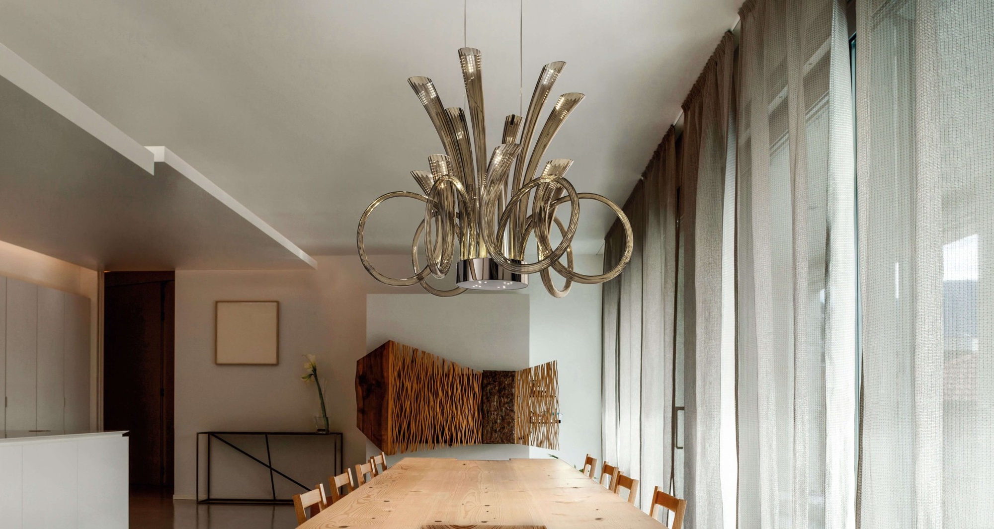 Люстра Pulsa 439/6+6 от фабрики Italamp — это подвесной светильник из коллекции, созданной дизайнером Данило Де Росси. Главная деталь — художественное выдувное стекло оттенков «дымчато-белый» или «голубиный». Металлическая конструкция доступна в отделке железно-серый или светлое золото. Встроенный LED-модуль мощностью 32 Вт даёт 4300 люмен при 3000K (опционально 2700K), CRI >80.