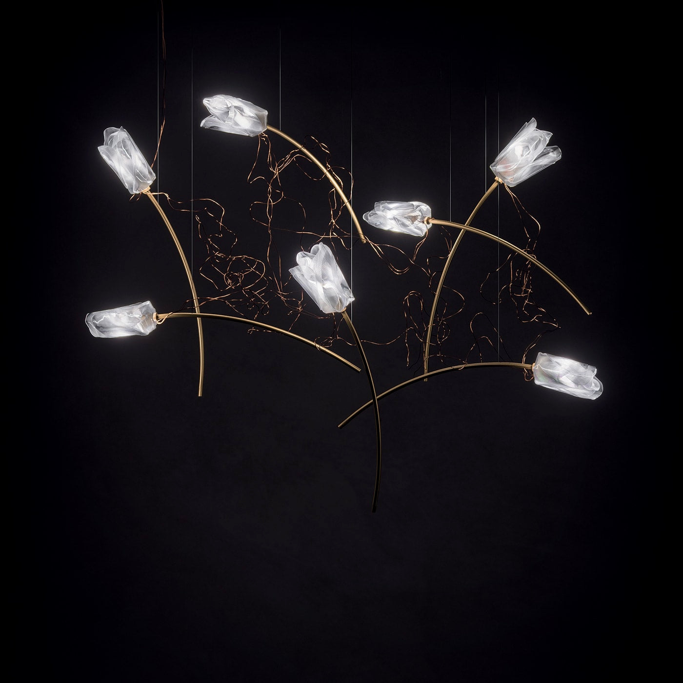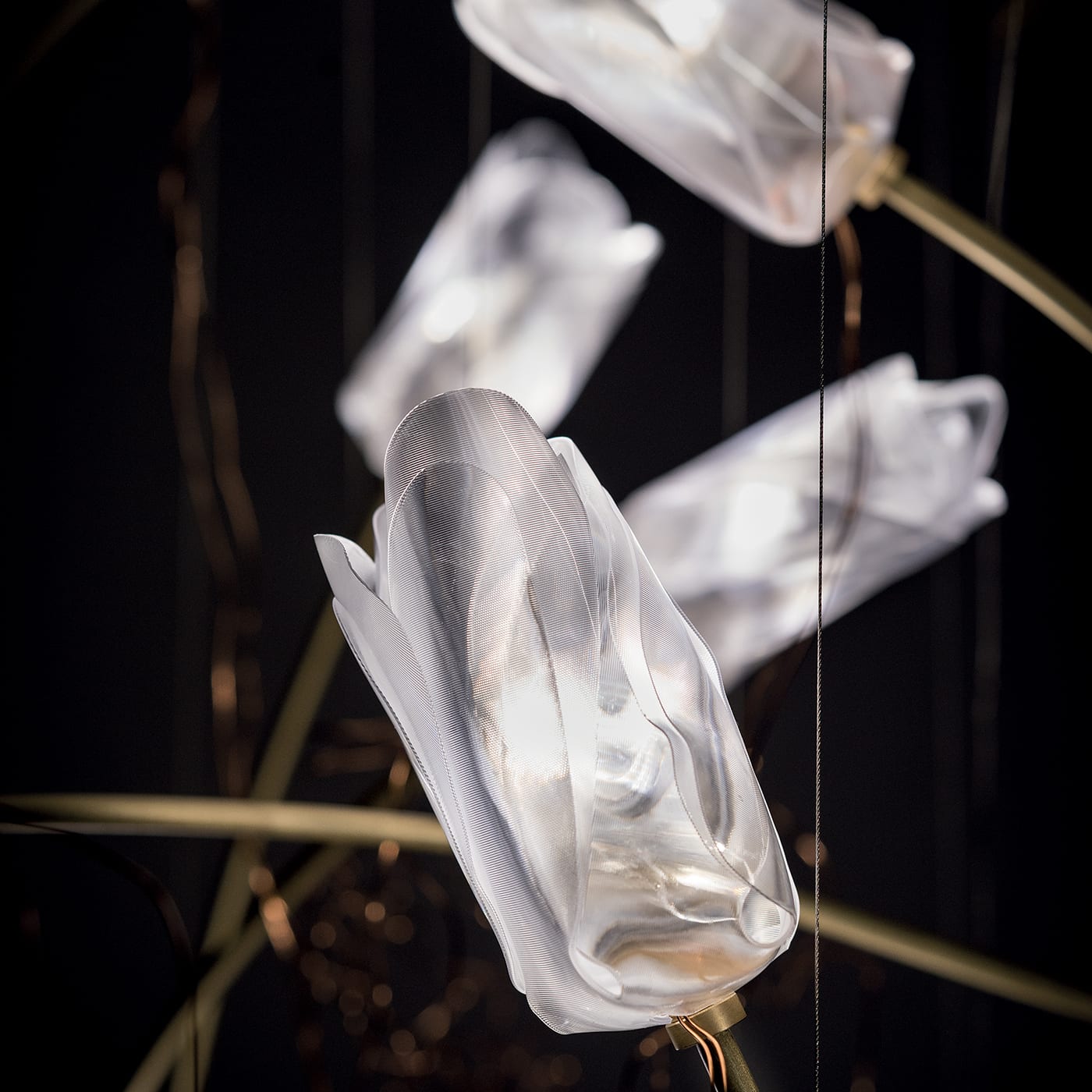 Изысканная, элегантная, невесомая. Tulip украшает пространство парящими цветами, вручную отлитыми по технологии Slamp, что делает каждый из них уникальным. Почти невидимые тросы удерживают подвешенные цветы, распускающиеся на матовых латунных стеблях; каждый тюльпан расположен под определённым углом, создавая ощущение естественной морфологии. Каждый тюльпан соединён со следующим посредством ряда замысловатых медных проводов, проводящих низковольтный ток.