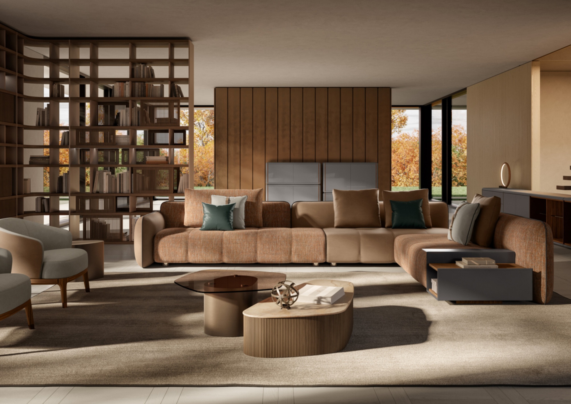 Модульная система адаптируется под любые потребности — собирайте конфигурацию по своему вкусу. Каркас из дерева покрыт пенополиуретаном с прослойками дакрона и нейлоновым бархатом, а спинки подушек выполнены из переработанного PET‑материала.