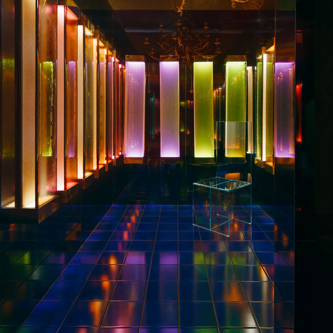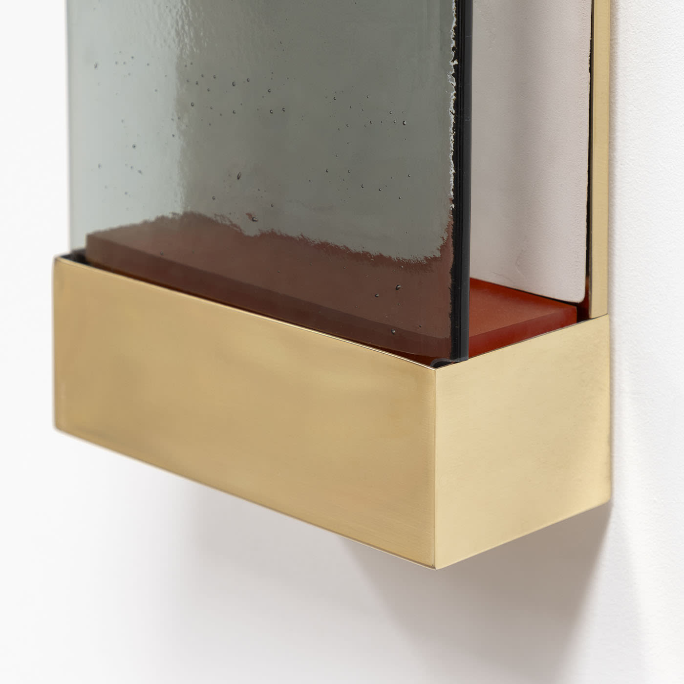 Настенный светильник Jud, отличающийся строгими формами и минималистичными контурами, воплощает эстетику Дональда Джадда. Геометрическая латунная рама обрамляет полупрозрачное тонированное стекло, скрывающее два цветных полимерных фильтра, которые, взаимодействуя со светодиодной лентой, создают мягкое свечение. Этот светильник, словно люминесцентная скульптура, создаёт завораживающие полихромные блики. Он оснащён одной кнопкой включения и выключения, которая также позволяет регулировать интенсивность света лёгким прикосновением и удержанием. Доступен в различных цветах.