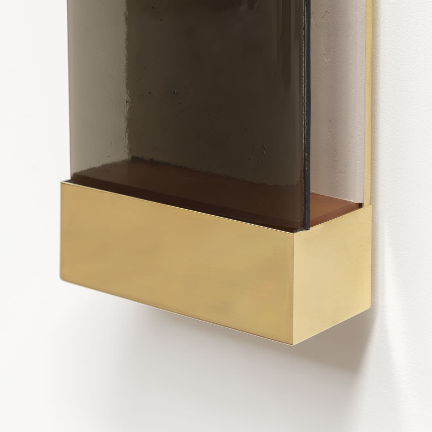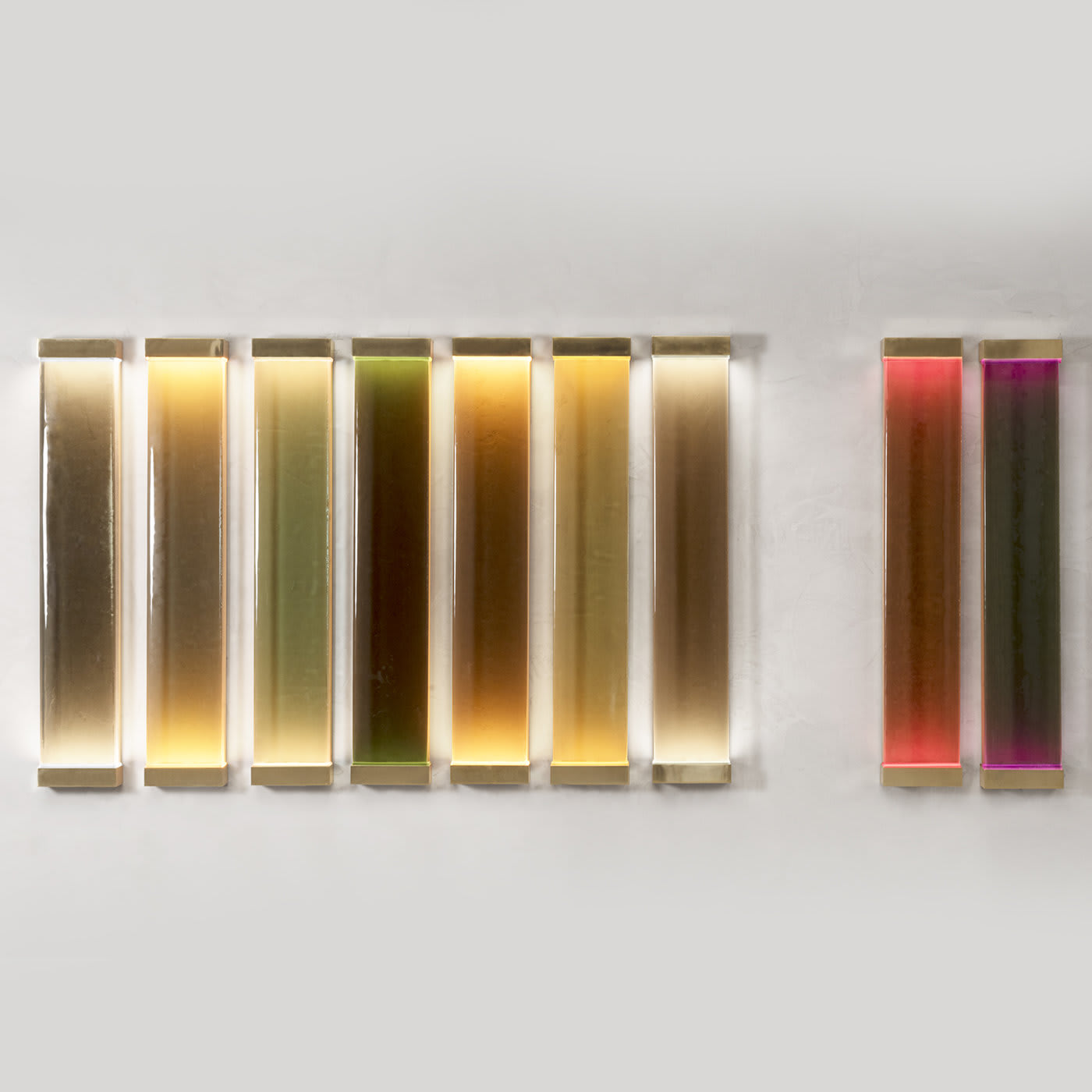 Настенный светильник Jud, отличающийся строгими формами и минималистичными контурами, воплощает эстетику Дональда Джадда. Геометрическая латунная рама обрамляет полупрозрачное тонированное стекло, скрывающее два цветных полимерных фильтра, которые, взаимодействуя со светодиодной лентой, создают мягкое свечение. Этот светильник, словно люминесцентная скульптура, создаёт завораживающие полихромные блики. Он оснащён одной кнопкой включения и выключения, которая также позволяет регулировать интенсивность света лёгким прикосновением и удержанием. Доступен в различных цветах.