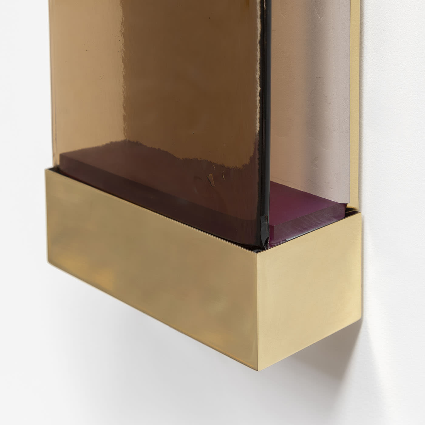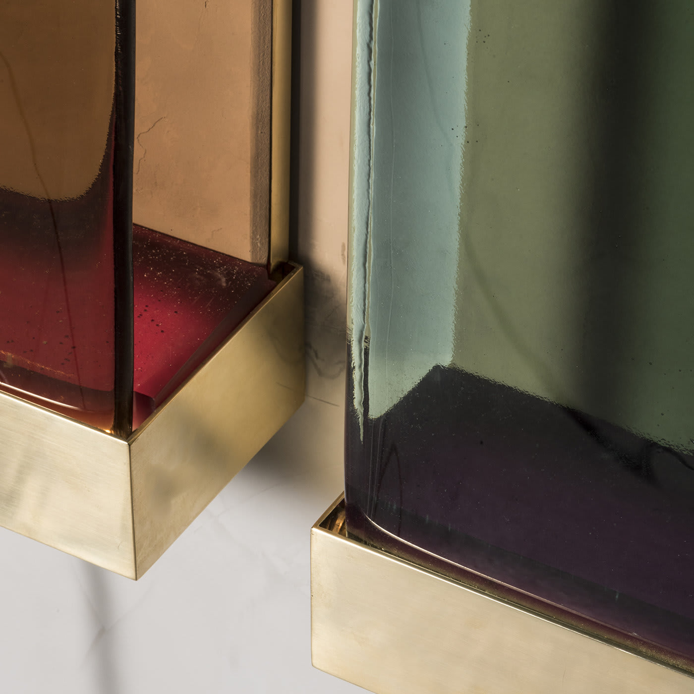 Настенный светильник Jud, отличающийся строгими формами и минималистичными контурами, воплощает эстетику Дональда Джадда. Геометрическая латунная рама обрамляет полупрозрачное тонированное стекло, скрывающее два цветных полимерных фильтра, которые, взаимодействуя со светодиодной лентой, создают мягкое свечение. Этот светильник, словно люминесцентная скульптура, создаёт завораживающие полихромные блики. Он оснащён одной кнопкой включения и выключения, которая также позволяет регулировать интенсивность света лёгким прикосновением и удержанием. Доступен в различных цветах.