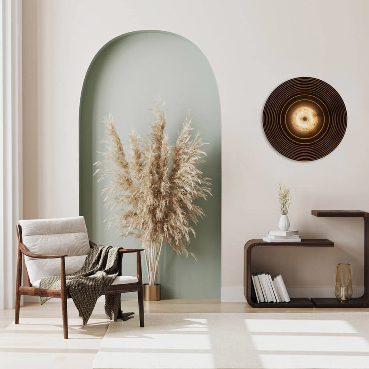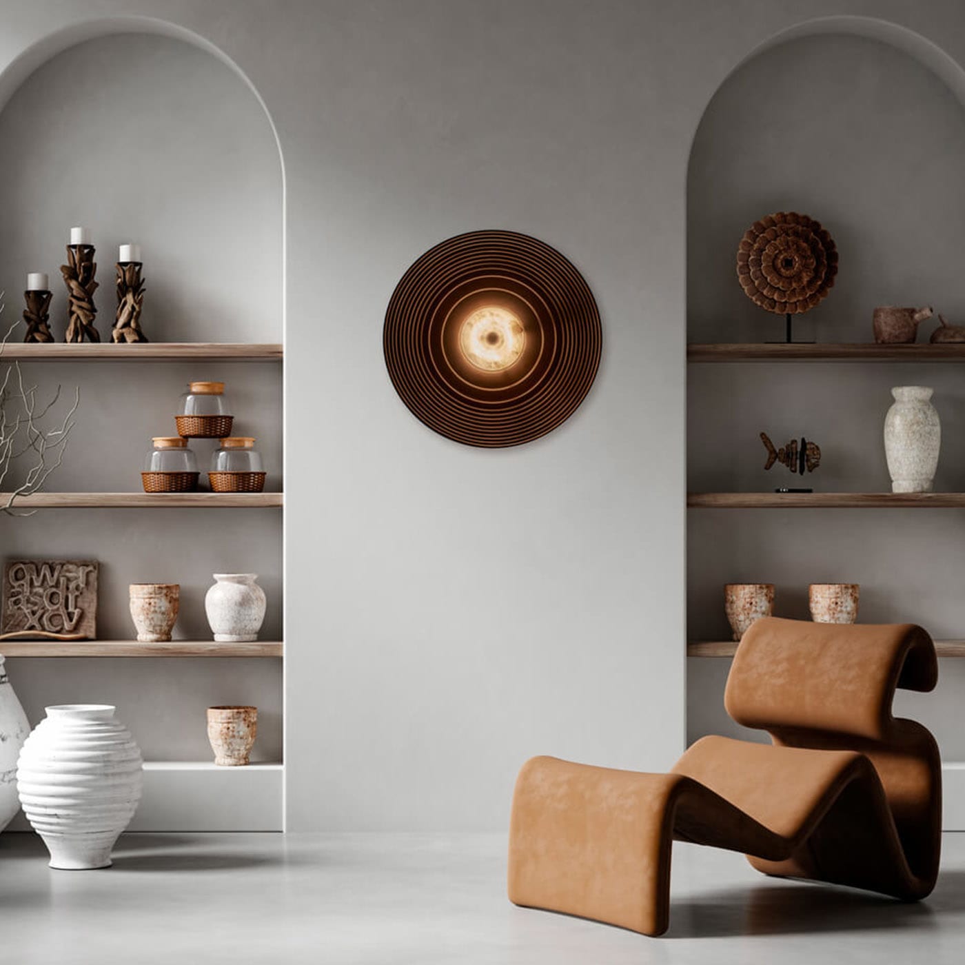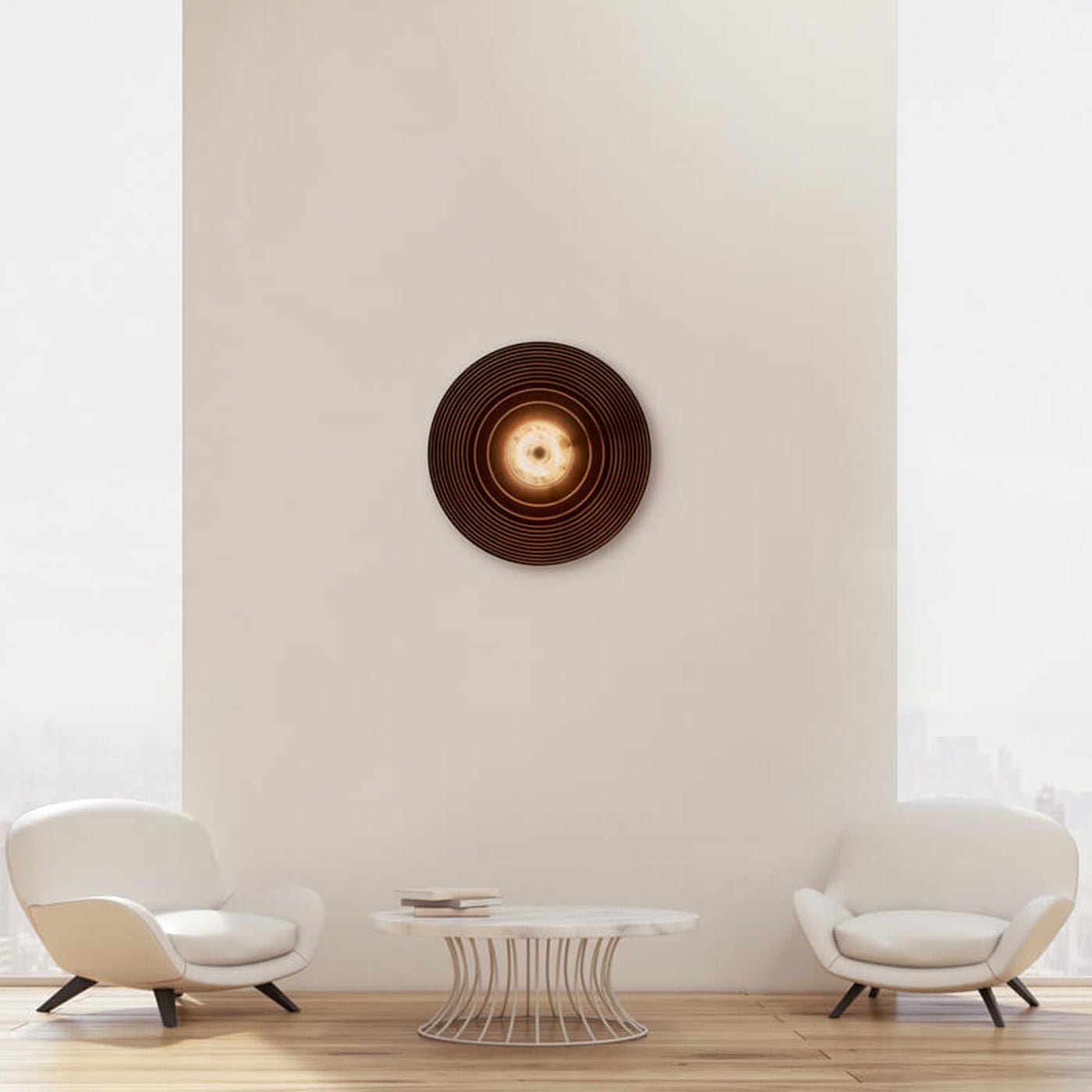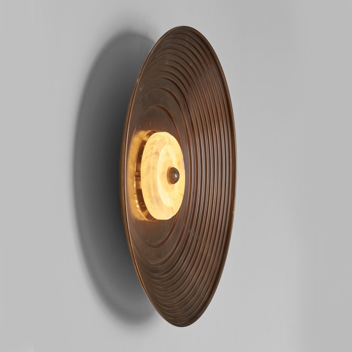Скульптурный настенный светильник «Гонг» был разработан для Matlight миланской студией дизайна интерьера LC Atelier. Скульптурная многослойная вогнутая пластина из латуни с отделкой под светлую бронзу изготовлена вручную и оснащена алебастровым дисковым рассеивателем с центральным болтом. Световые эффекты на ступенях гонга и сквозь алебастр создают волшебный, притягивающий взгляд эффект.