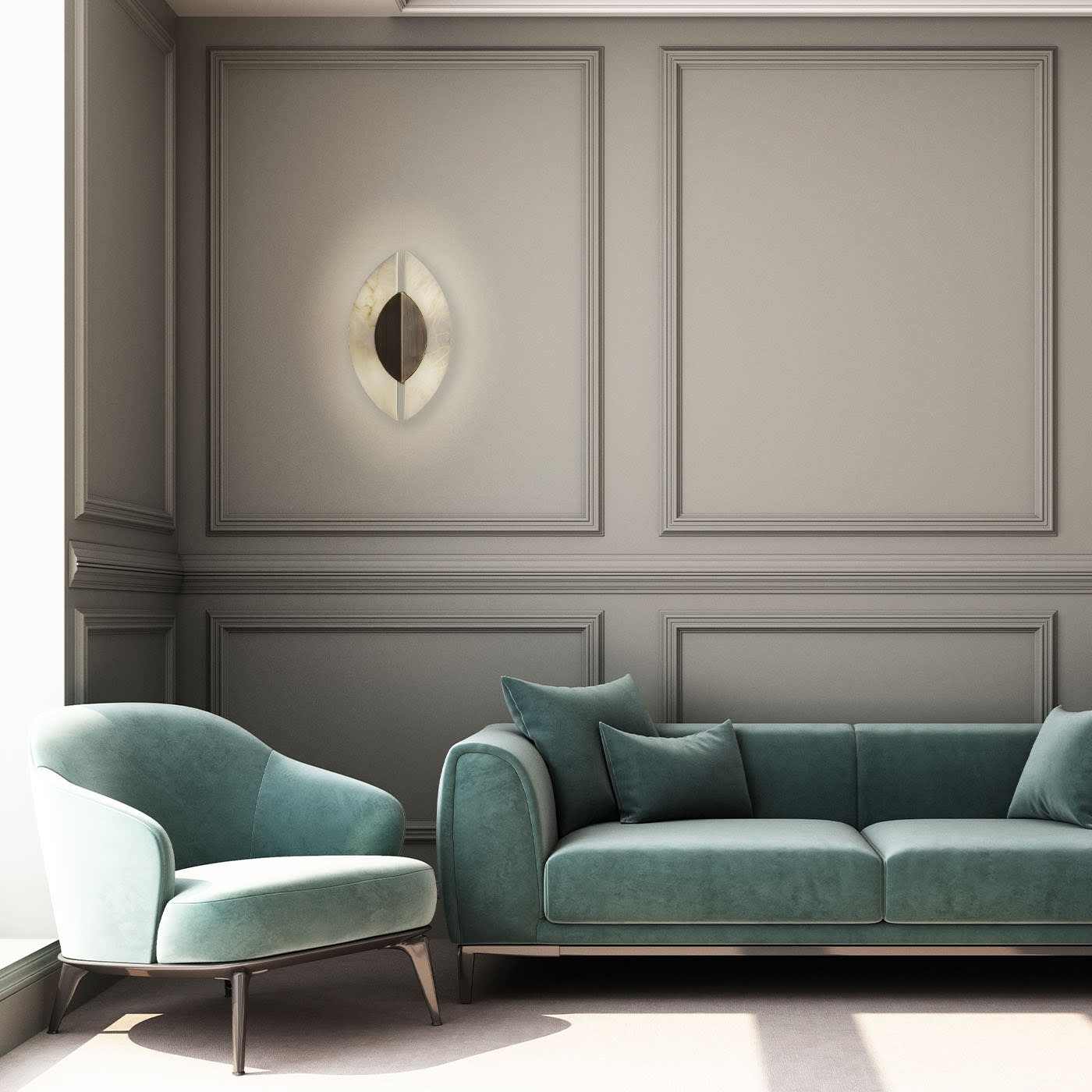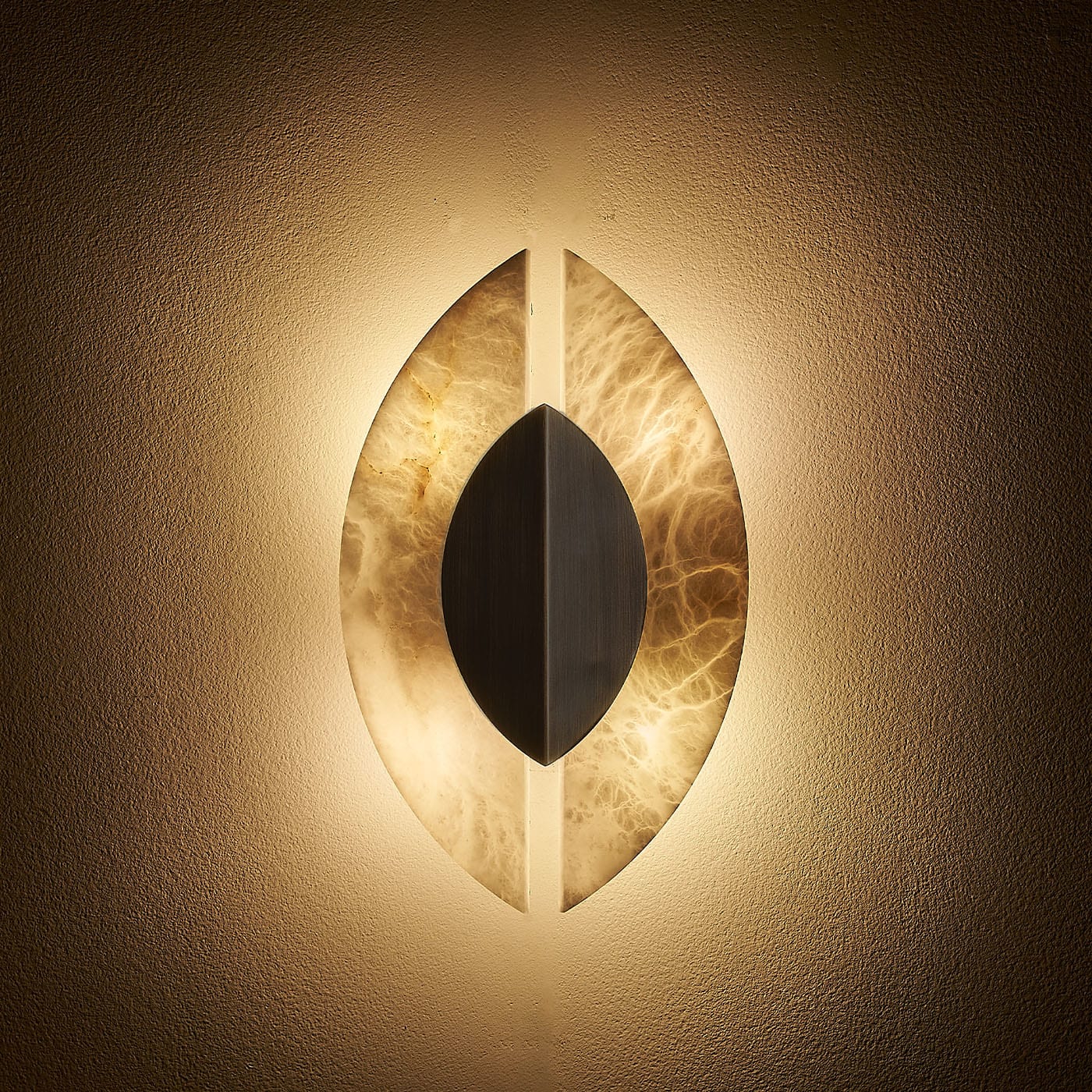 Настенный светильник Shields, выполненный из шлифованной бронзы и алебастра, напоминает старинные средневековые щиты. Использование алебастра также добавляет дизайну естественную текстуру, которую подчёркивает мягкий, размытый свет лампочек за щитами.