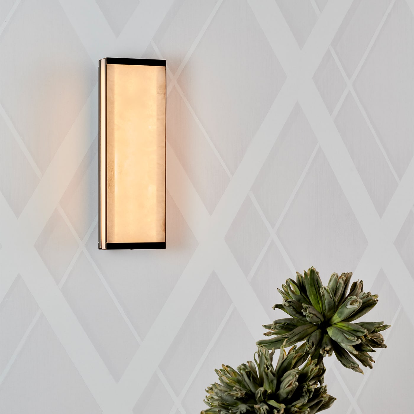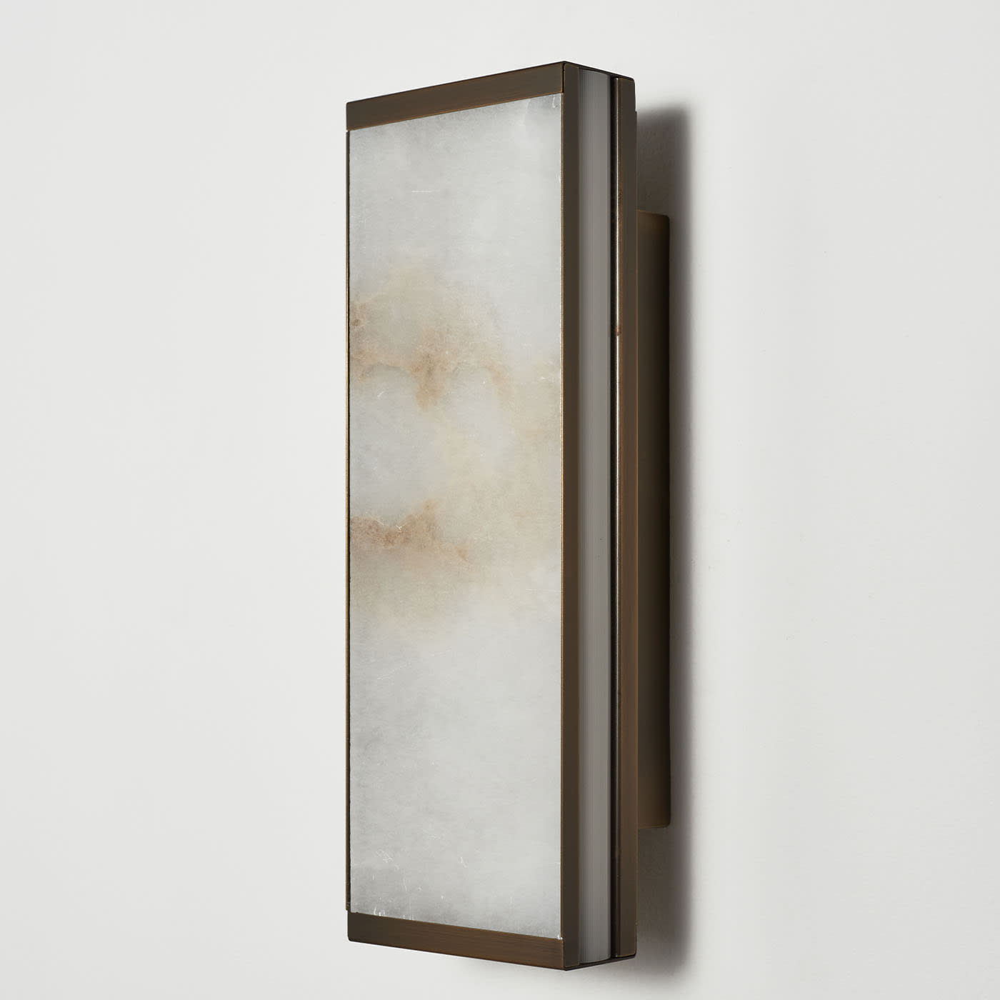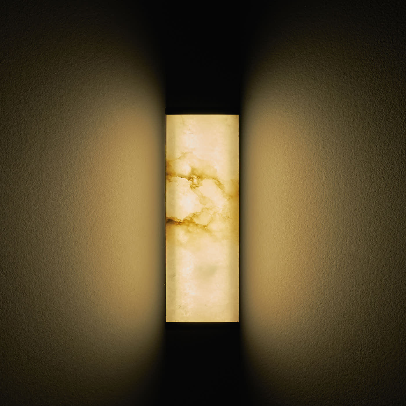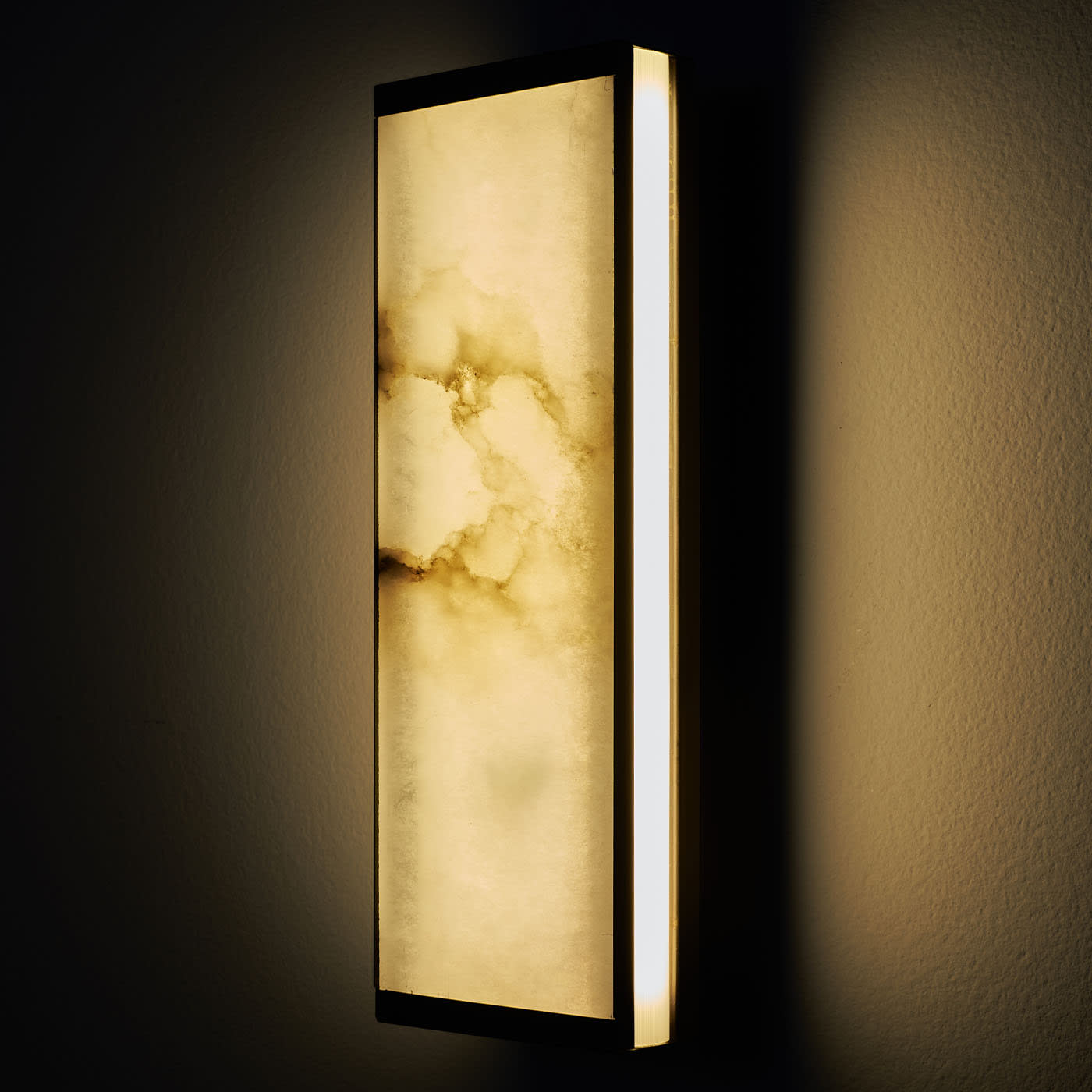 Короткий настенный светильник Tech был задуман как единое целое, объединяющее светильник и абажур, играя на прозрачности света, проникающего сквозь сверхтонкий оникс, заключенный в сатинированную латунную рамку простой линейной прямоугольной формы, которая еще больше подчеркивает красоту натурального камня.