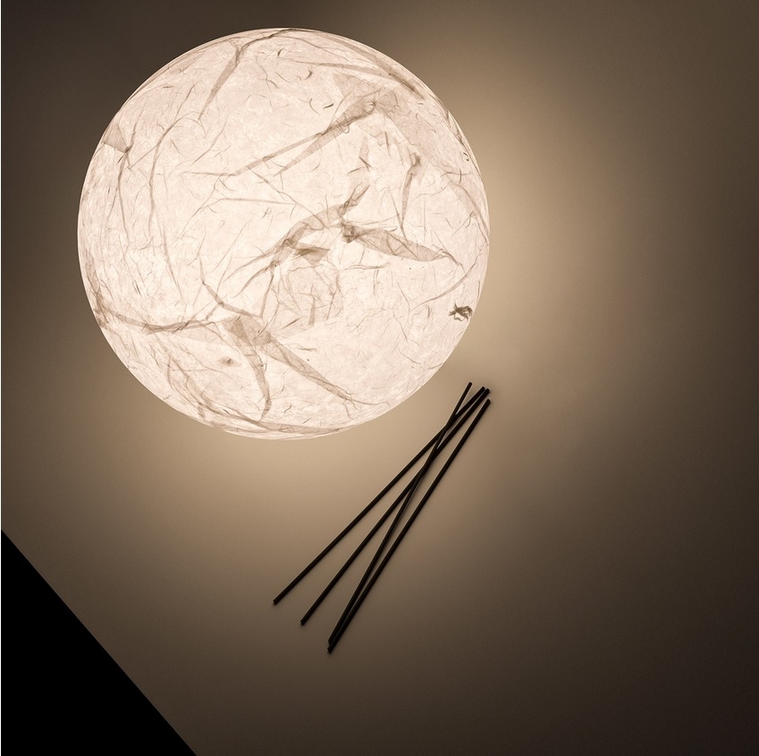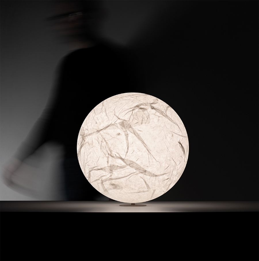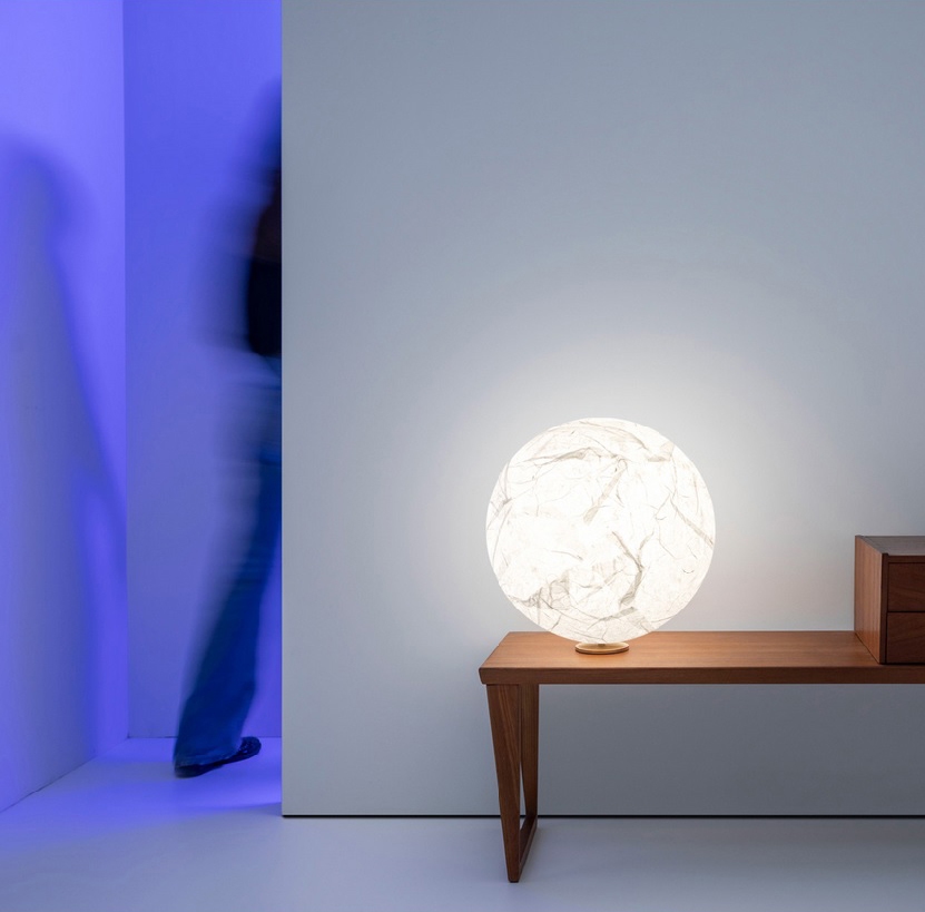 Настольная лампа Moon T Davide GroppiMoon T, разработанная и произведенная Давиде Гроппи, представляет собой сферическую настольную лампу с металлическим основанием, окрашенным в золотой цвет. Рассеиватель имеет текстуру японской бумаги и экранирует источник света с помощью светодиодного патрона E27 с диммерной системой на кабеле питания.