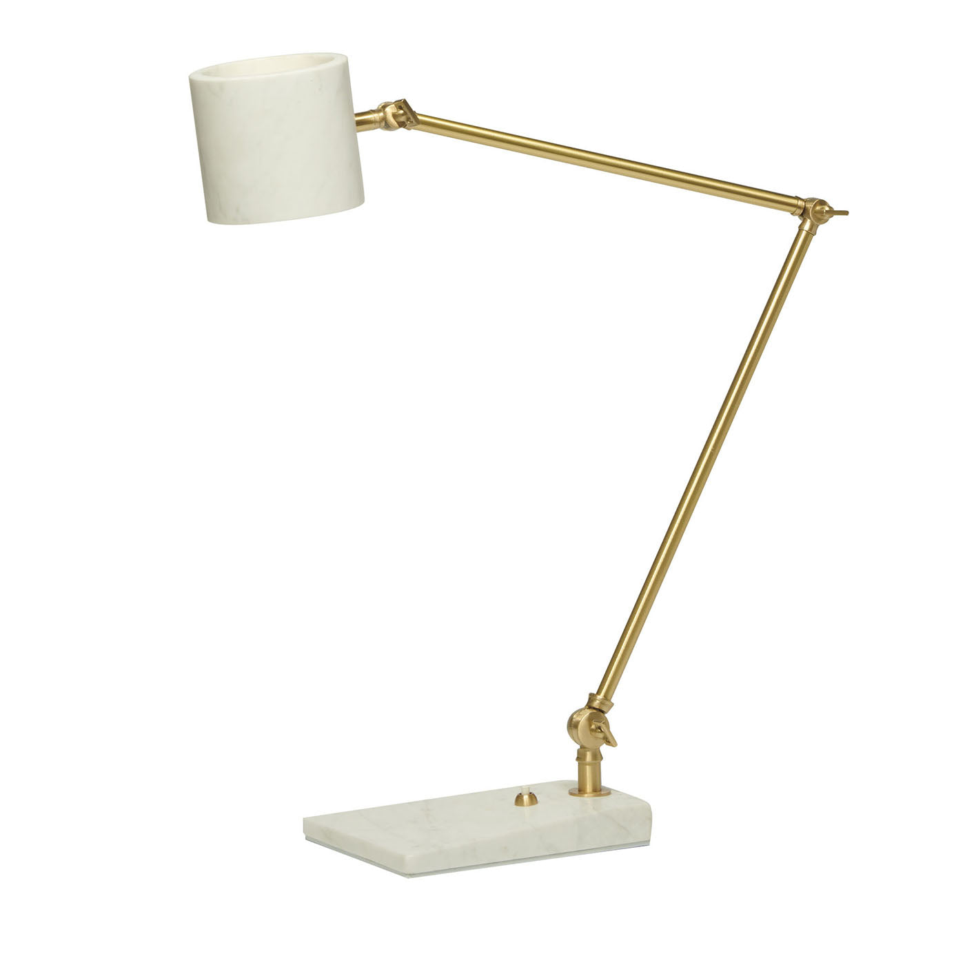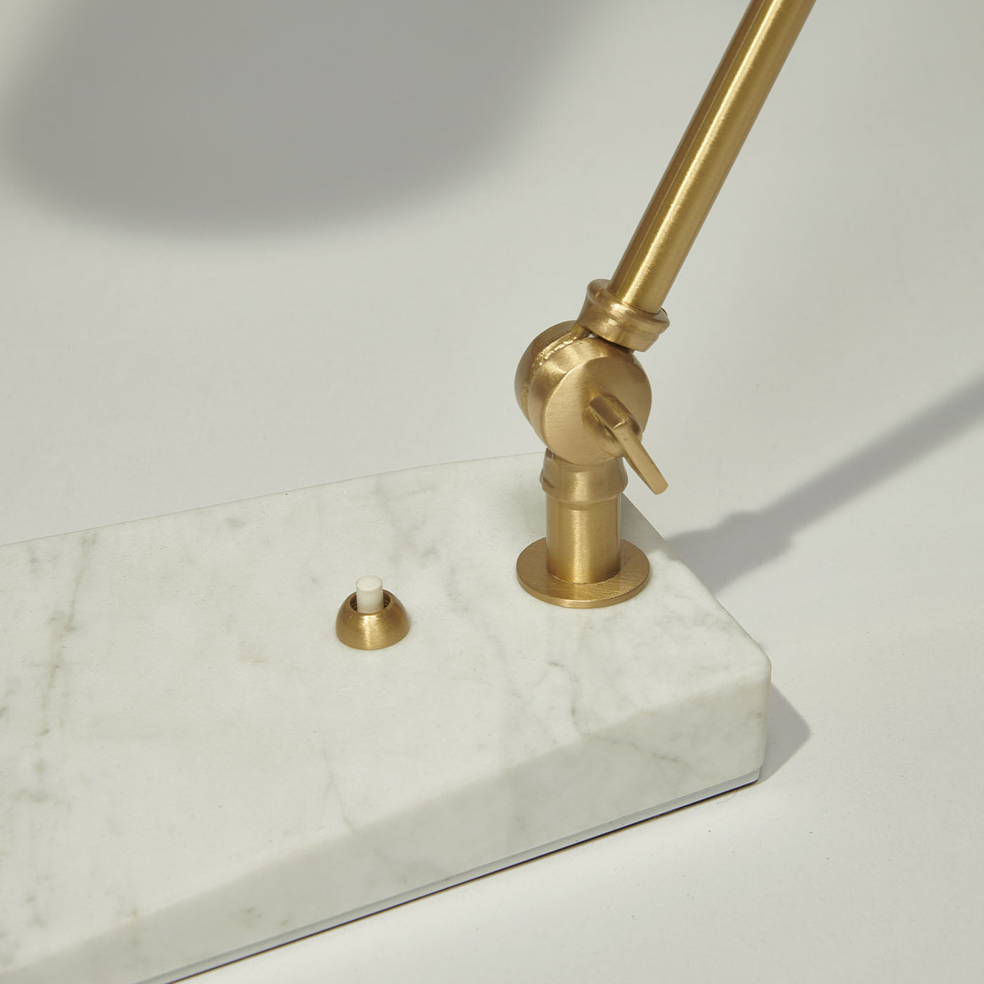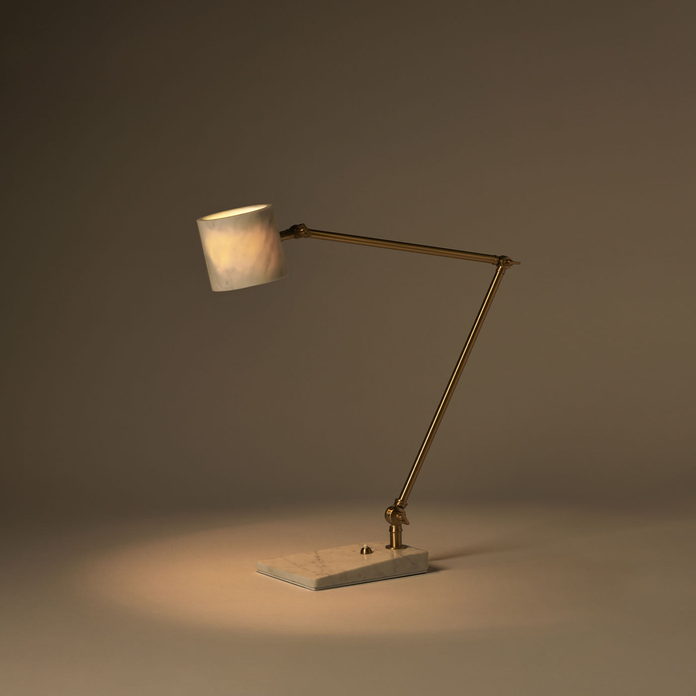 Настольная лампа Flamingo отличается контрастом объемов ее элементов: тонкость регулируемого углового латунного кронштейна контрастирует с необычным регулируемым мраморным абажуром.