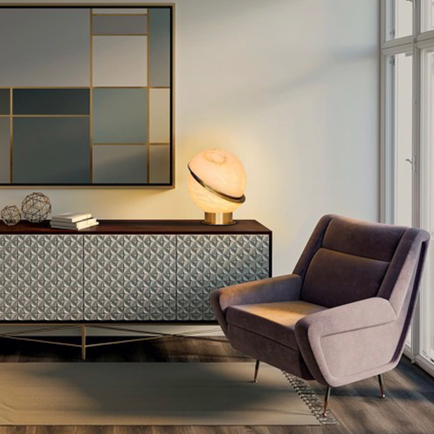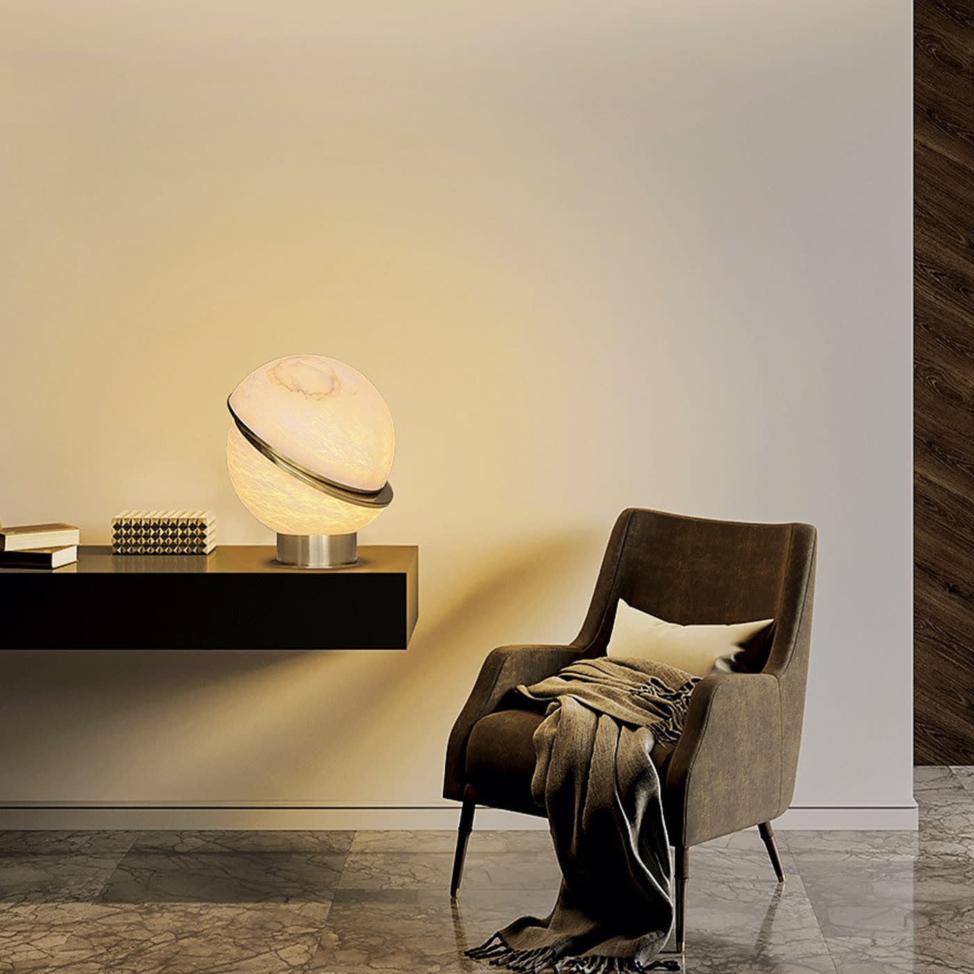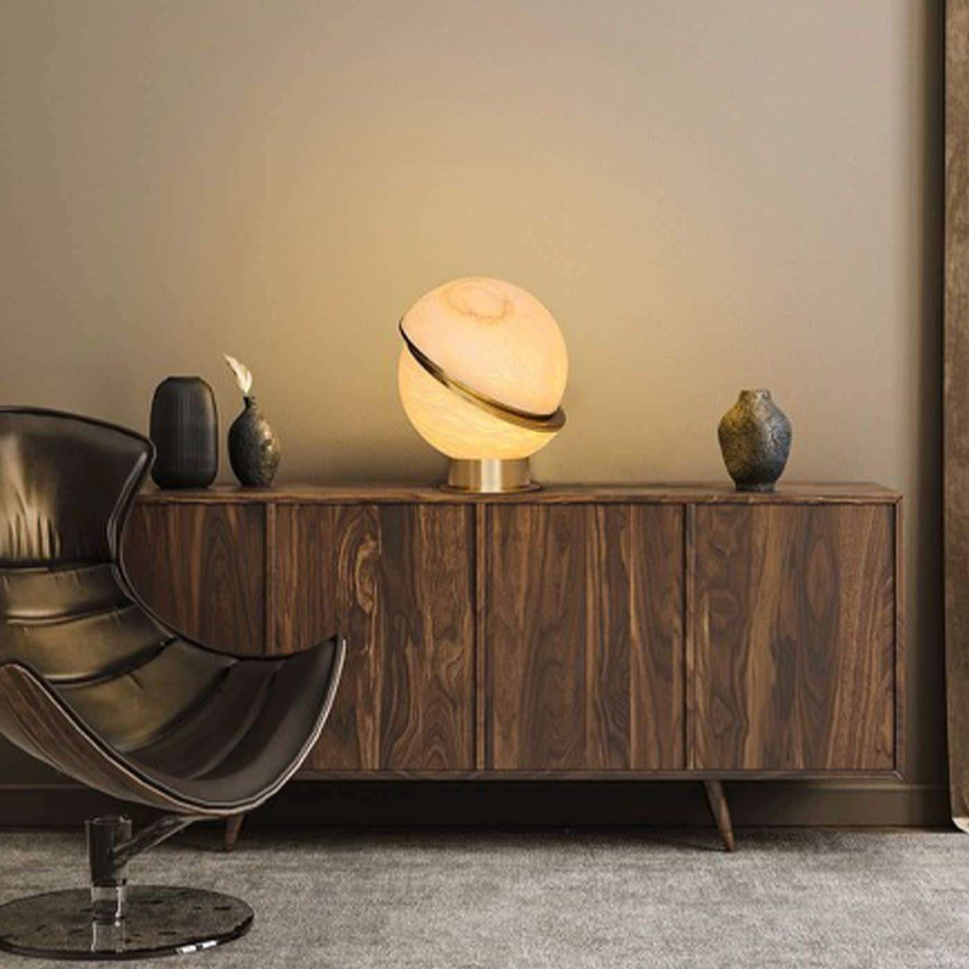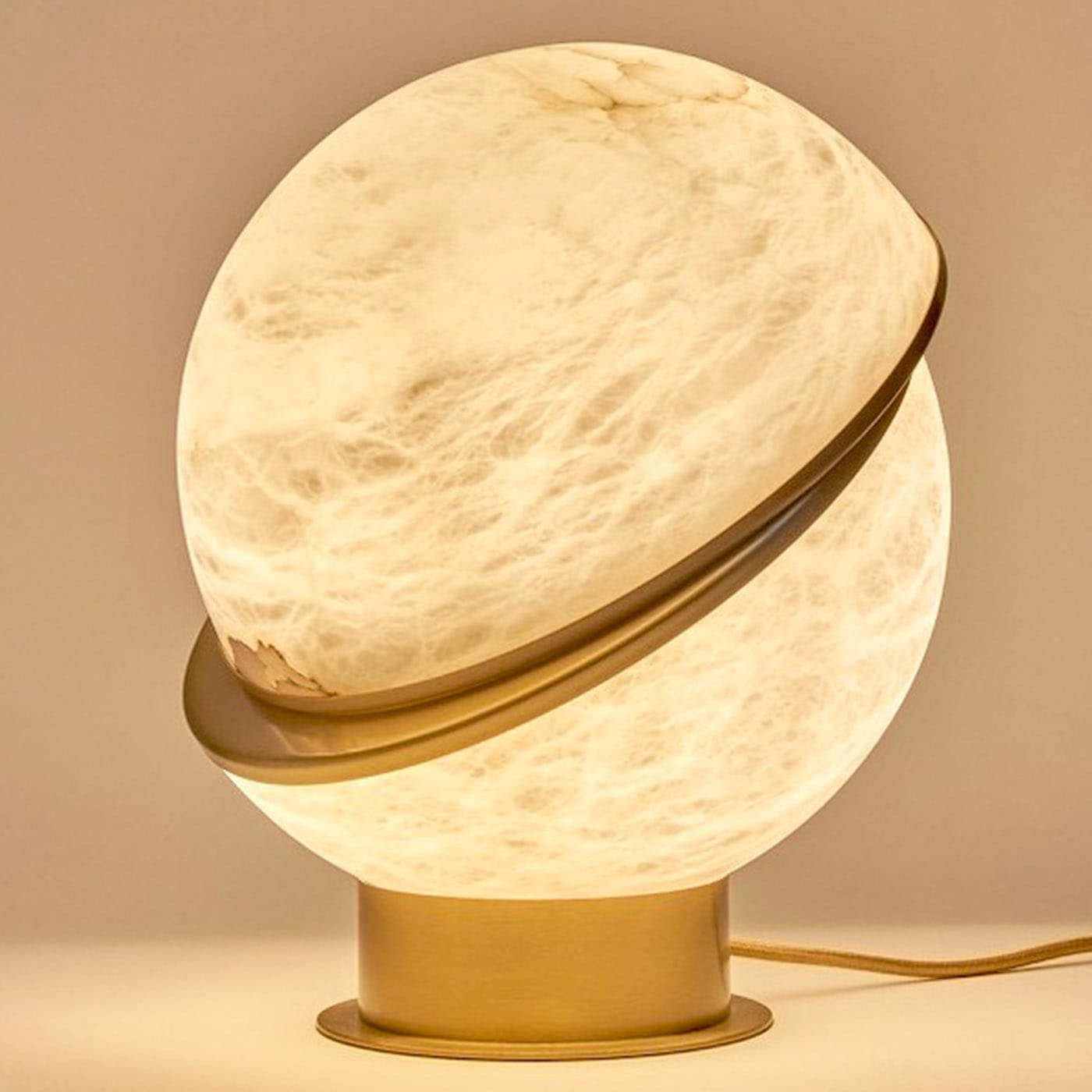 Alabaster Globe — настольная лампа, состоящая из двух алебастровых полусфер, соединенных тонким латунным контуром. Сочетая в себе воздушность алебастра и теплое сияние латуни, эта лампа станет великолепным дополнением к изысканному интерьеру.