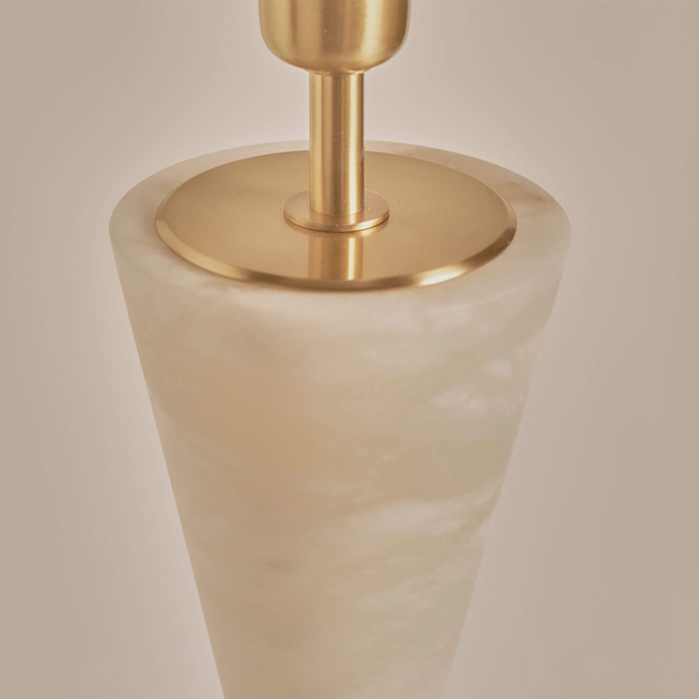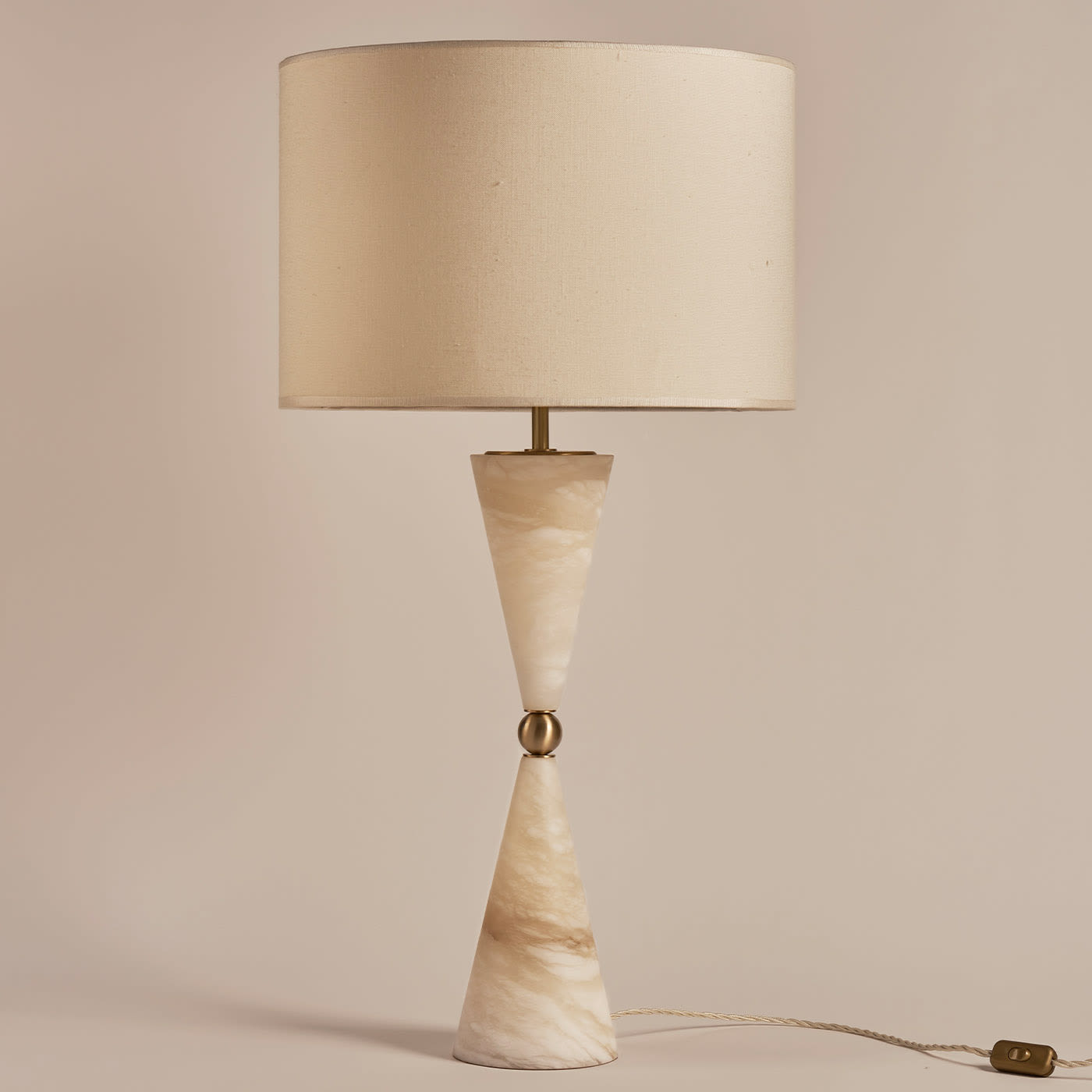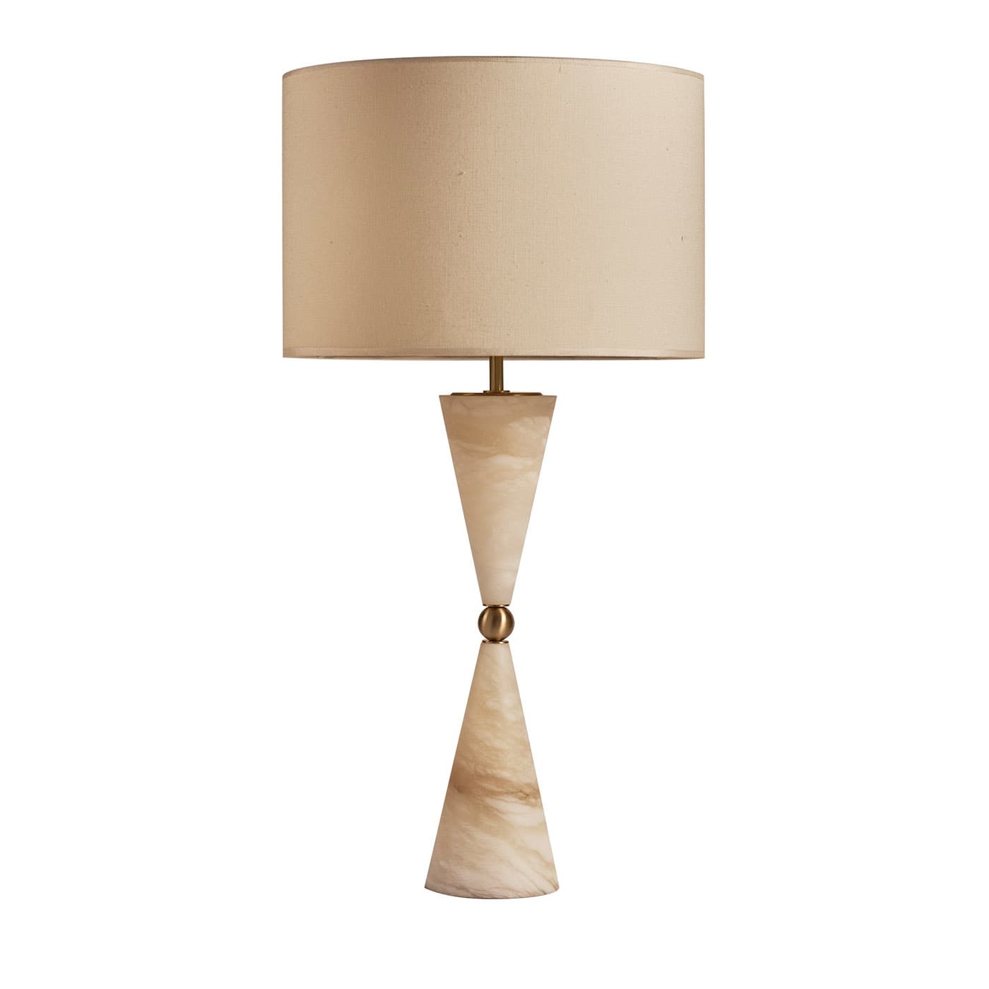 Внушительная и одновременно извилистая настольная лампа. Центральный сферический элемент из латуни уравновешивает два перевёрнутых алебастровых конуса, которые словно устремляются к концам основания. Абажур в комплект не входит.