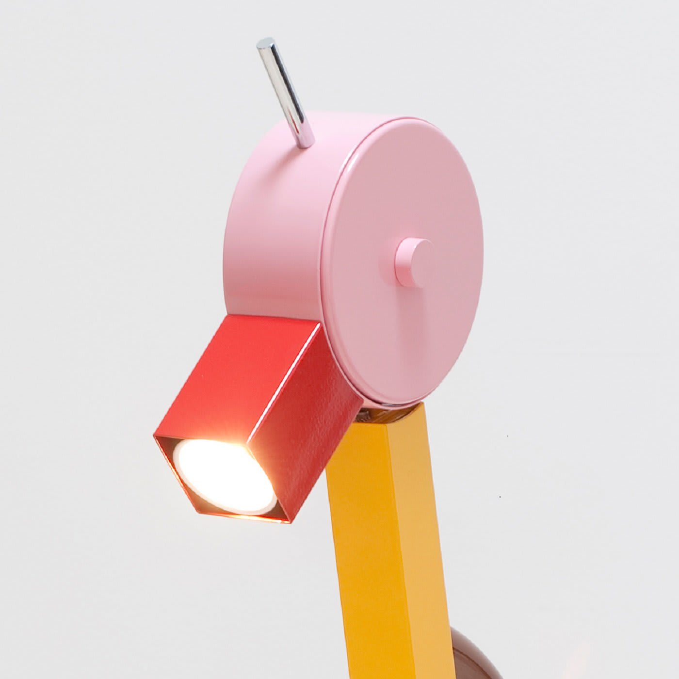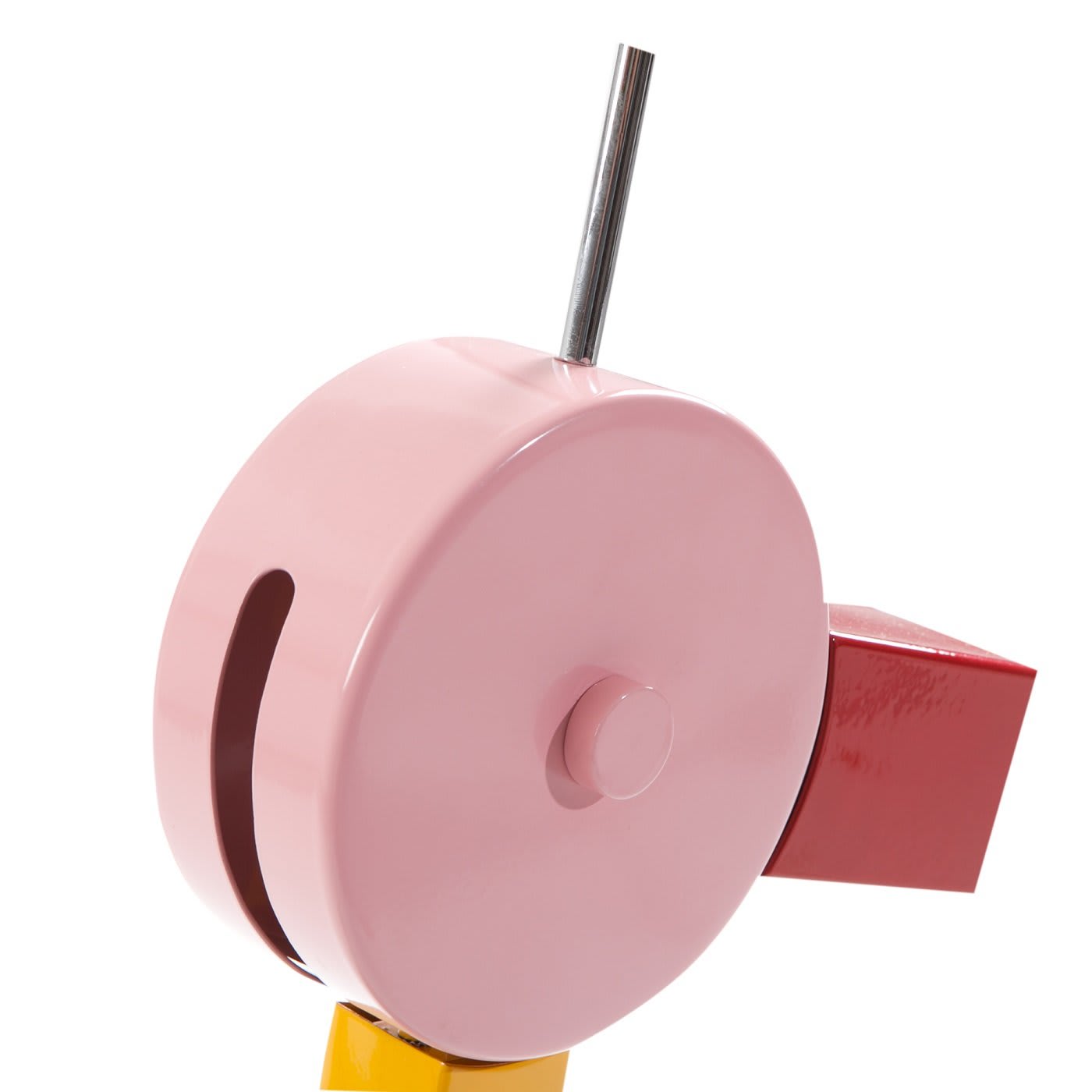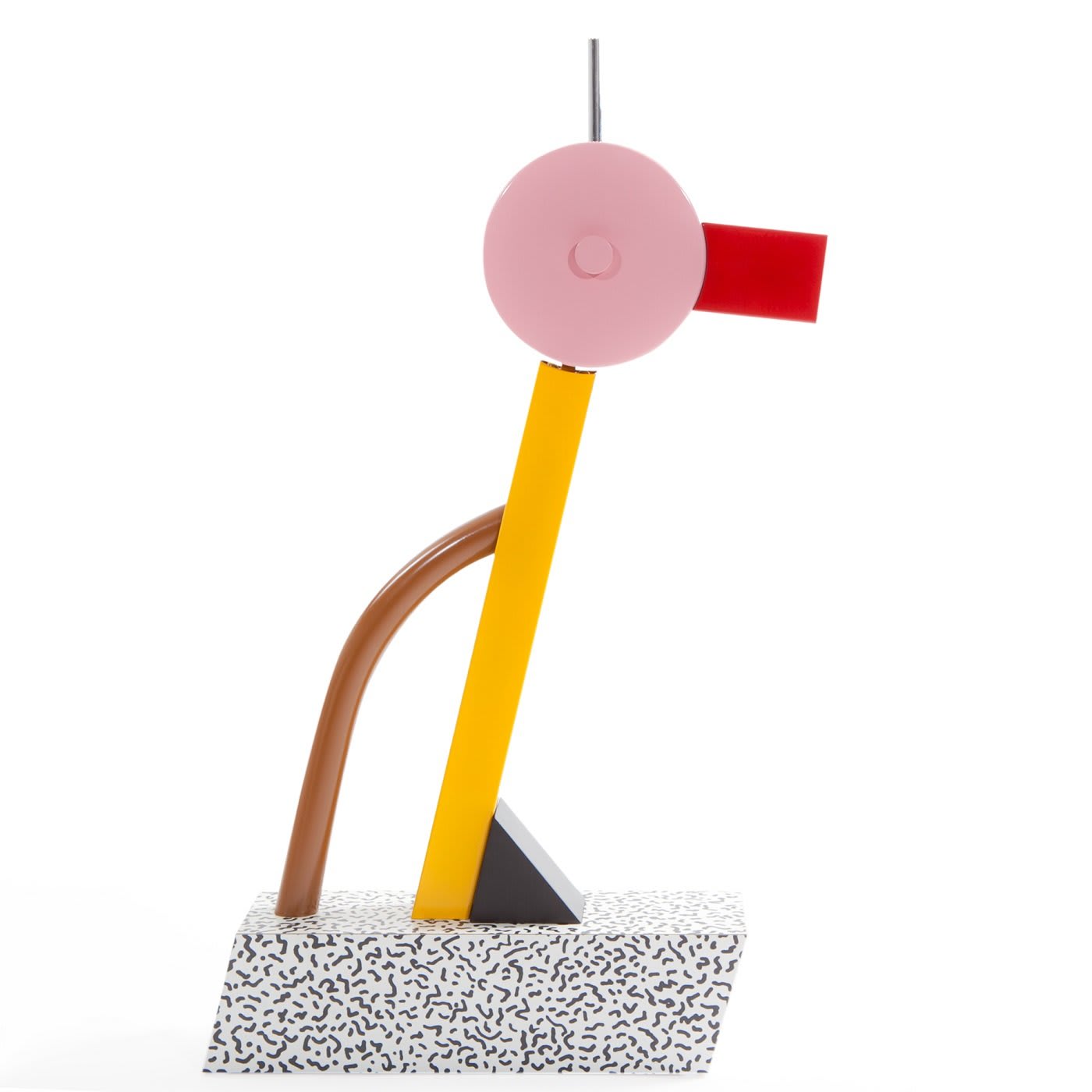 Эта великолепная настольная лампа, разработанная Этторе Соттсассом, поразительно напоминает силуэт утки. Черно-белое основание из ламината с бактериальным узором поддерживает эклектичный силуэт: желтый стебель, подчеркнутый черным основанием, поддерживает круглую розовую головку, которая поворачивается, чтобы направлять свет от красного клюва в нужном направлении. Этот предмет станет прекрасным дополнением к современному столу, консоли или тумбочке. Его можно комбинировать с другими изделиями того же художника, а также заказать 100V, связавшись с консьержем перед покупкой.
