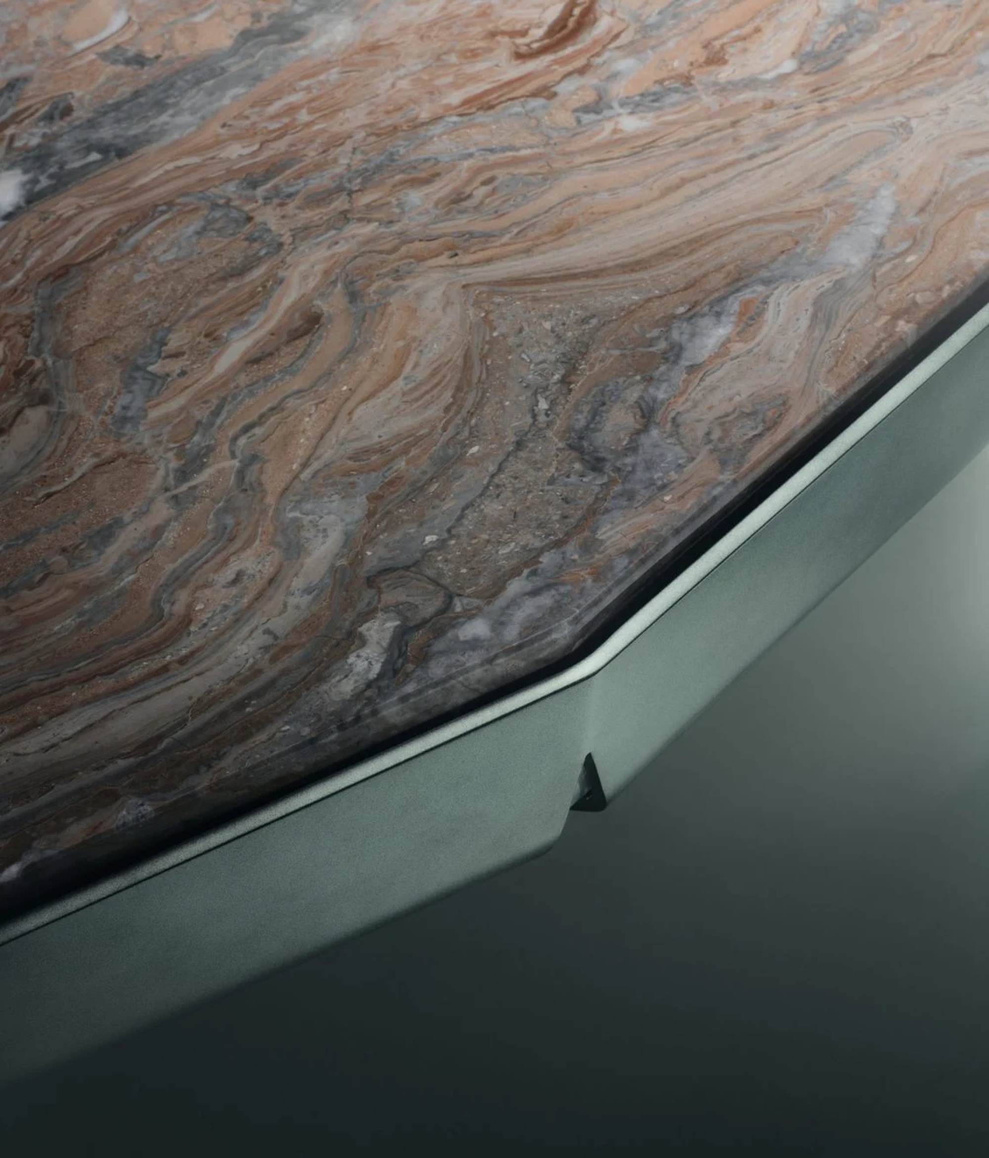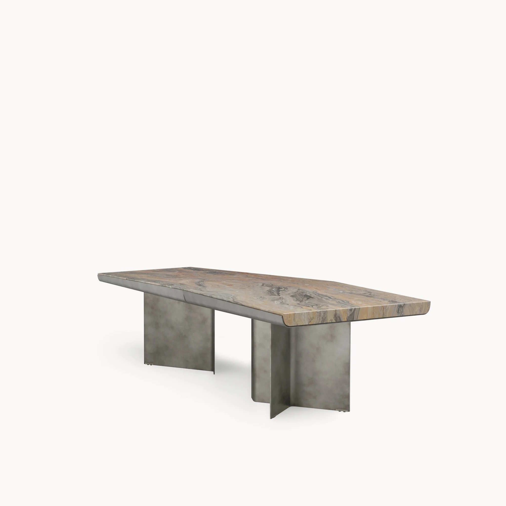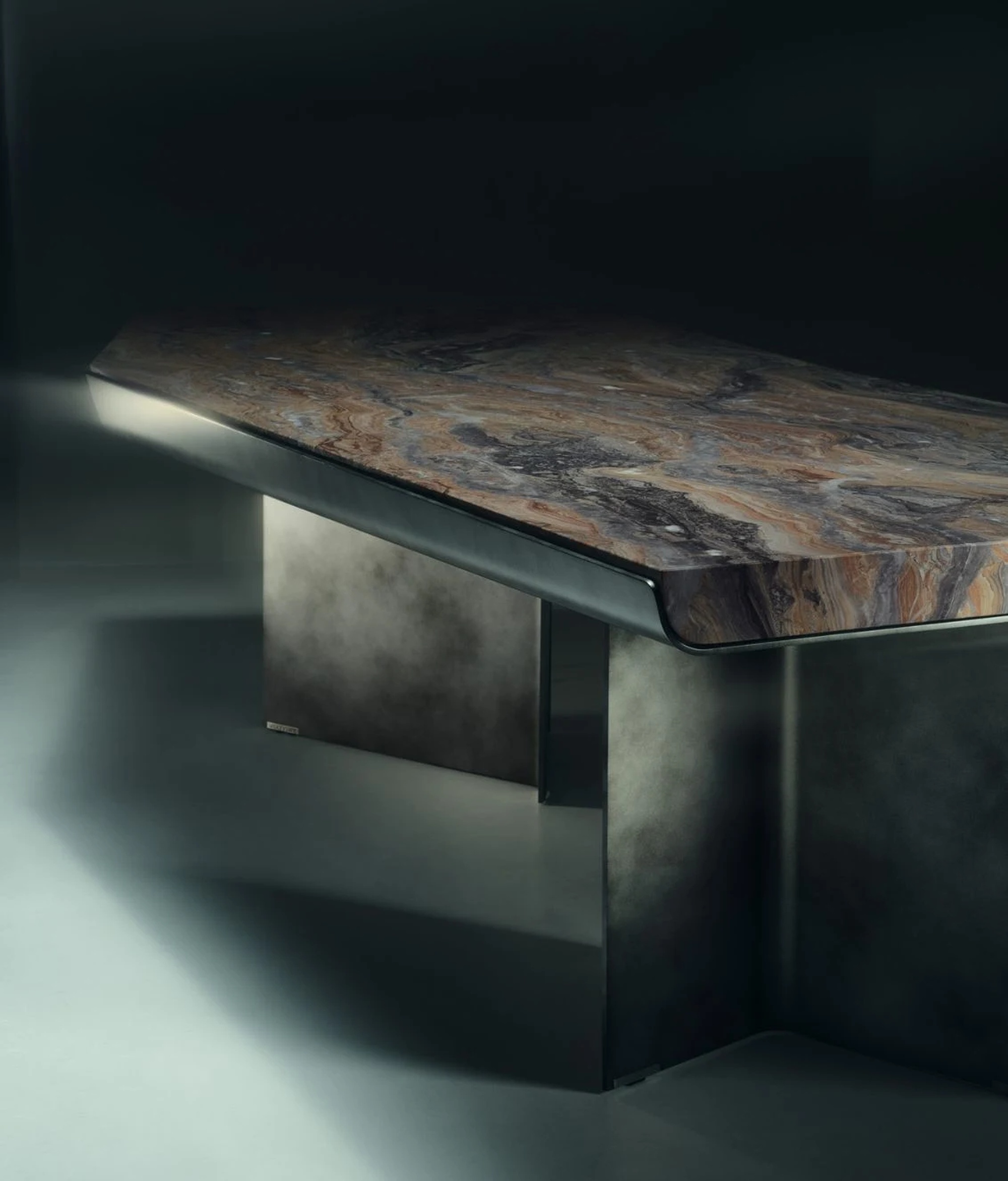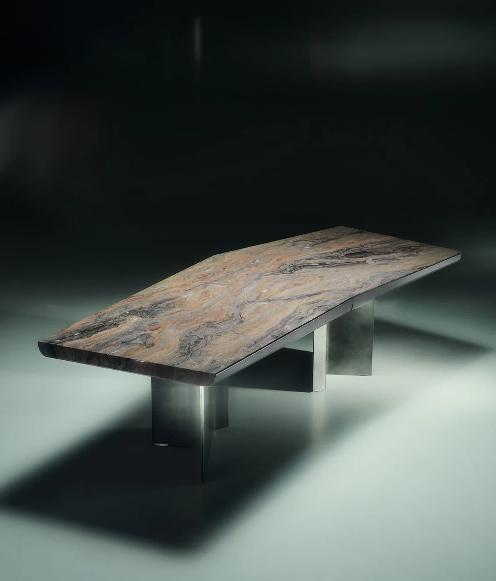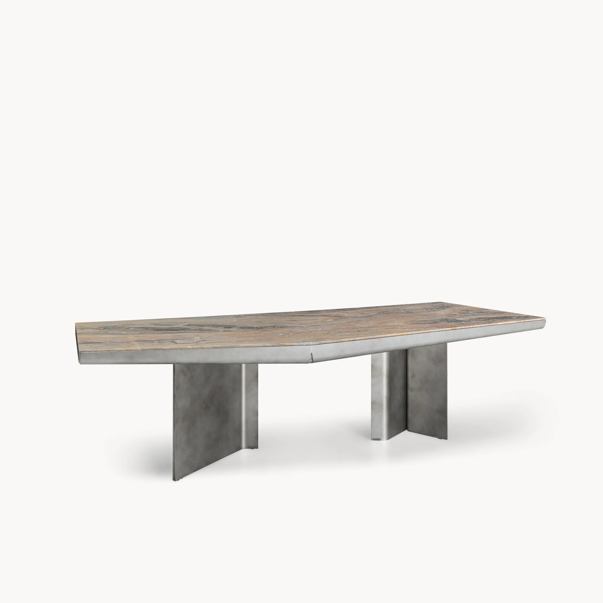 Обеденный стол Catskill от Ipe Cavalli Visionnaire — это объект скульптурной силы и архитектурной тонкости. Модель строится на контрасте тяжёлого мрамора и лёгкого металла. Рама из толстого калёного листового металла с сужающимся профилем сварена в асимметричную центральную форму, напоминающую парящую конструкцию. Узкие прорези в раме открывают вид на мраморные вставки под столешницей, создавая игру глубины и света.