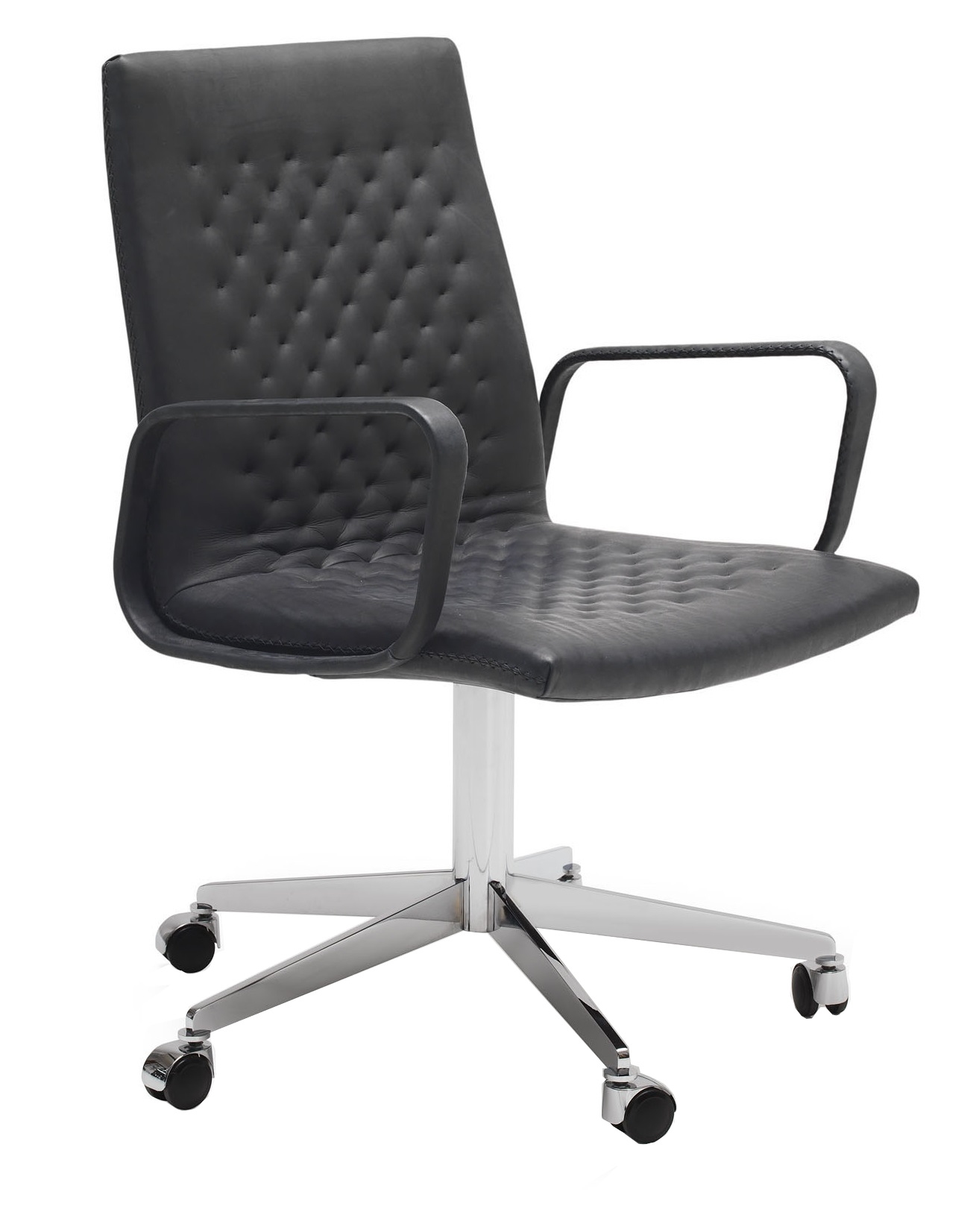 DS-1051 Стул De Sede на колесахDS-1051, разработанный командой дизайнеров de Sede для De Sede, представляет собой стул с колесами, блестящей хромированной структурой и сиденьем с кожаной обивкой SEDEX. Доступны версии с подлокотниками или без них.
