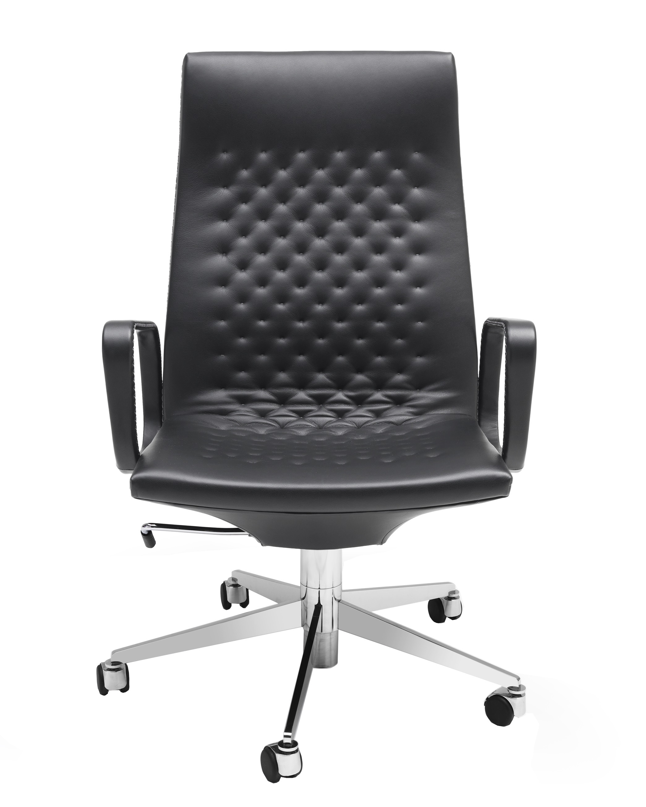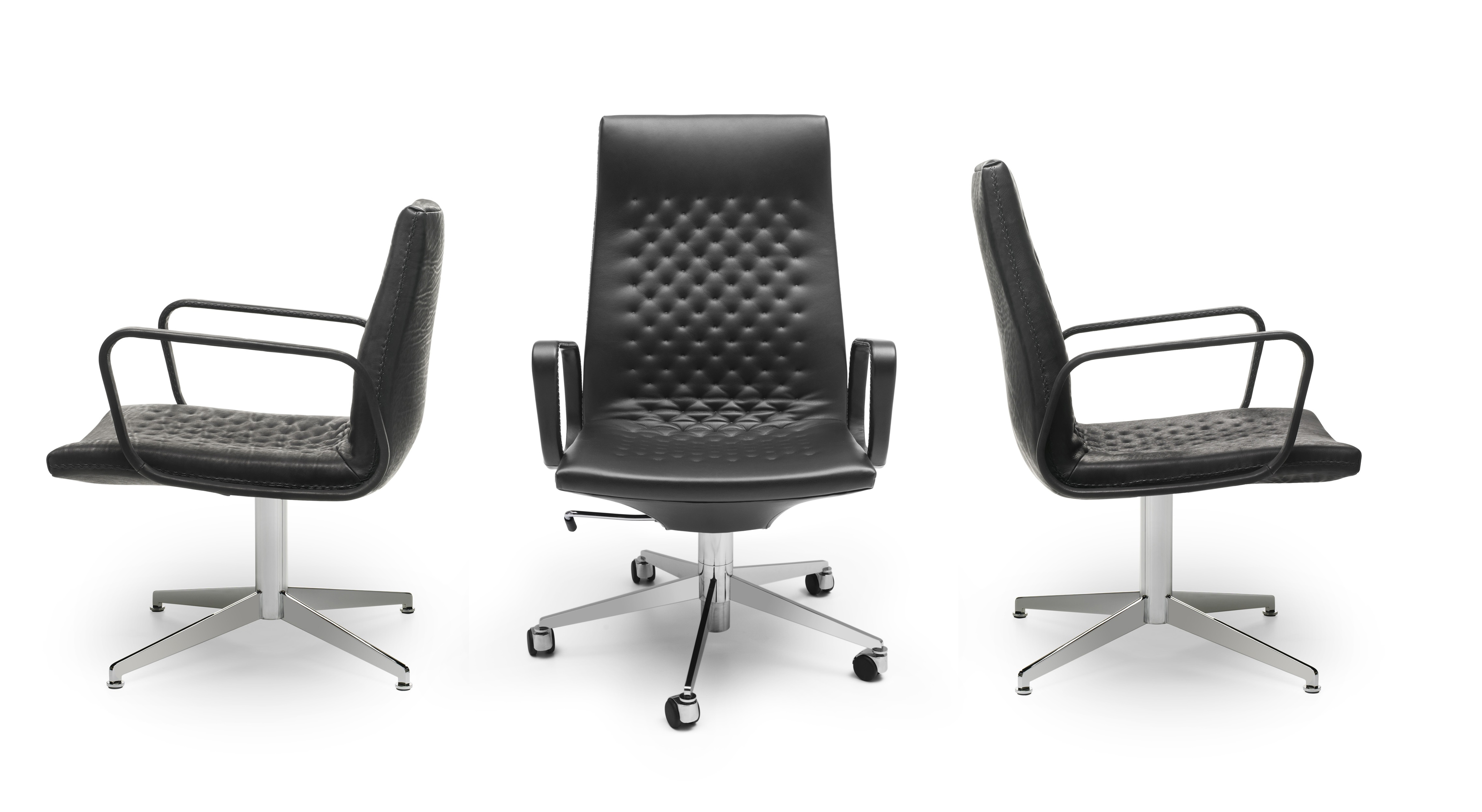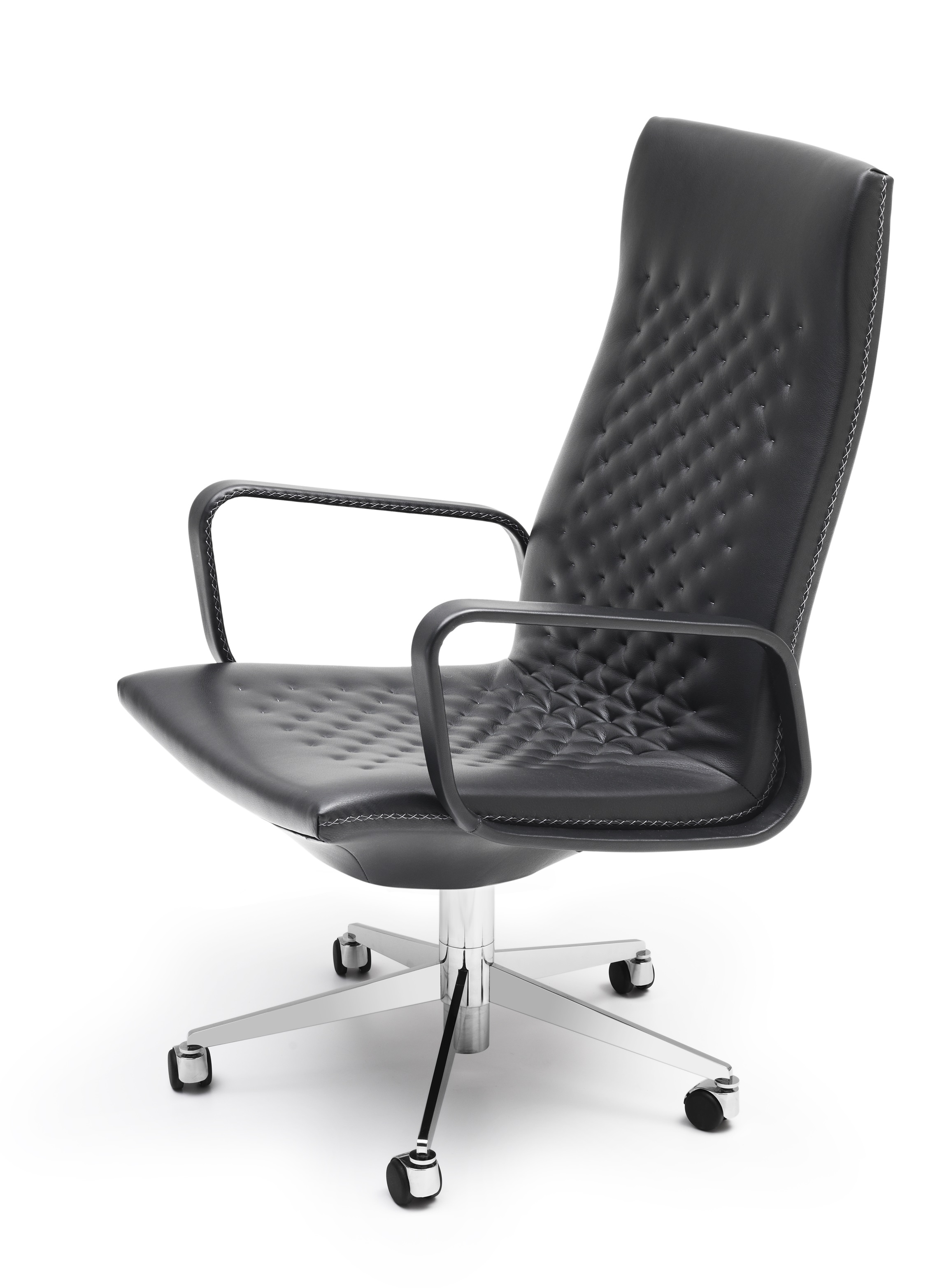 DS-1051/112 Кресло для руководителя De SedeDS-1051/112, разработанное командой дизайнеров de Sede для De Sede, представляет собой стул с пятиточечной полированной хромированной структурой и черными роликами для твердых и мягких полов, регулируемый по высоте с помощью механизма наклона. Обивка из дакрона с фиксированной строчкой и вышивкой крестиком нитками тон в тон. Доступен в различных вариантах отделки.