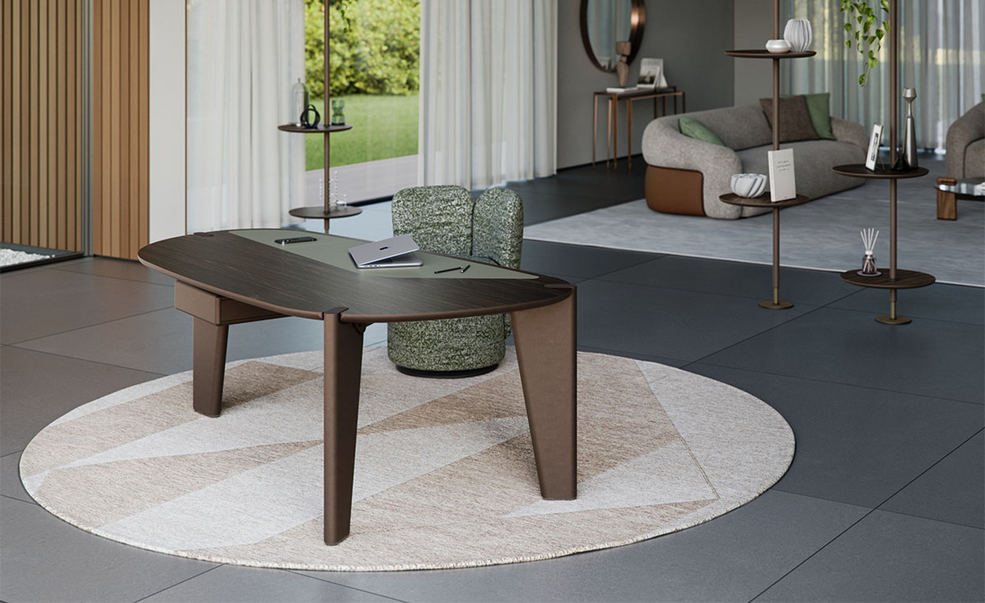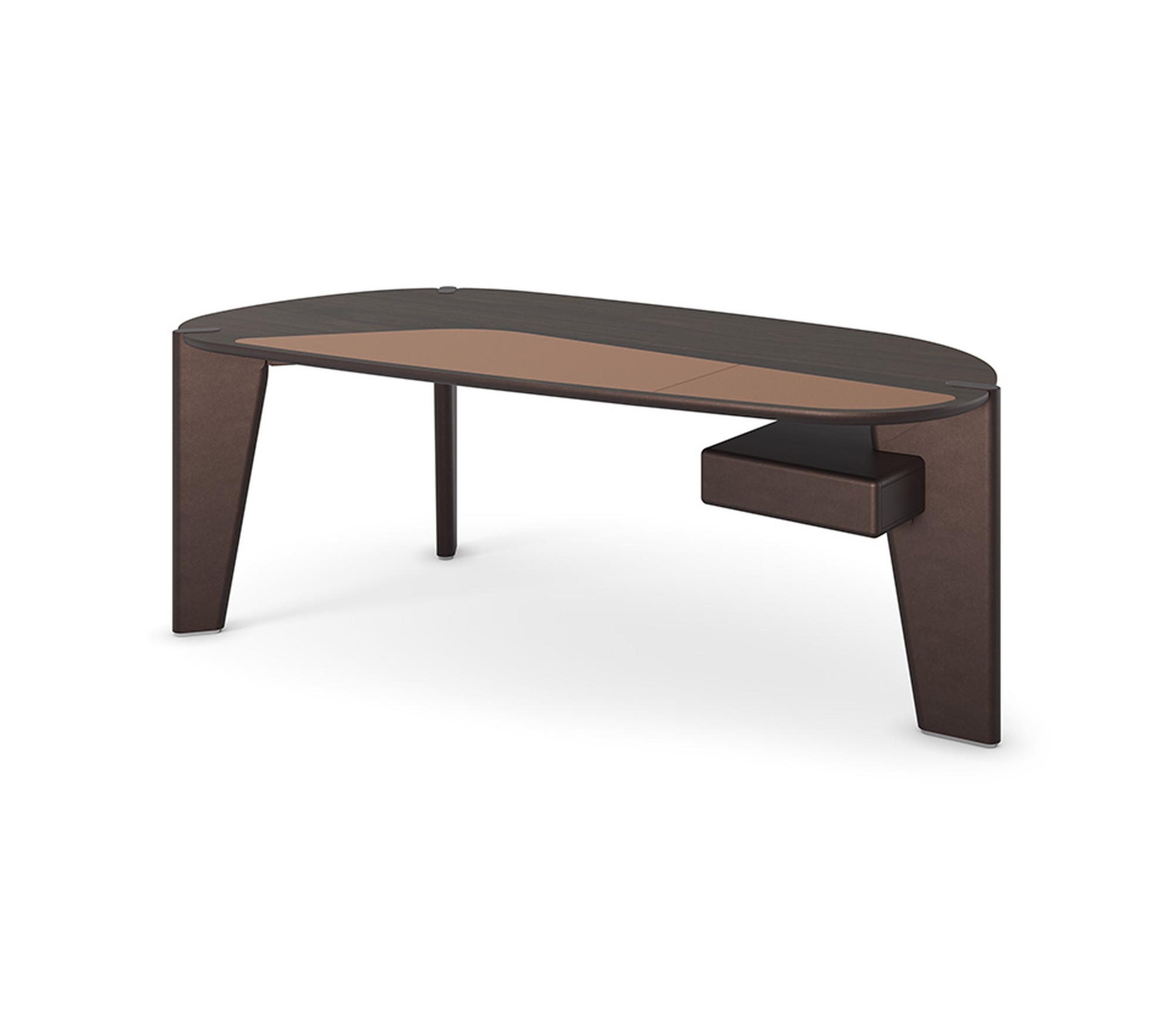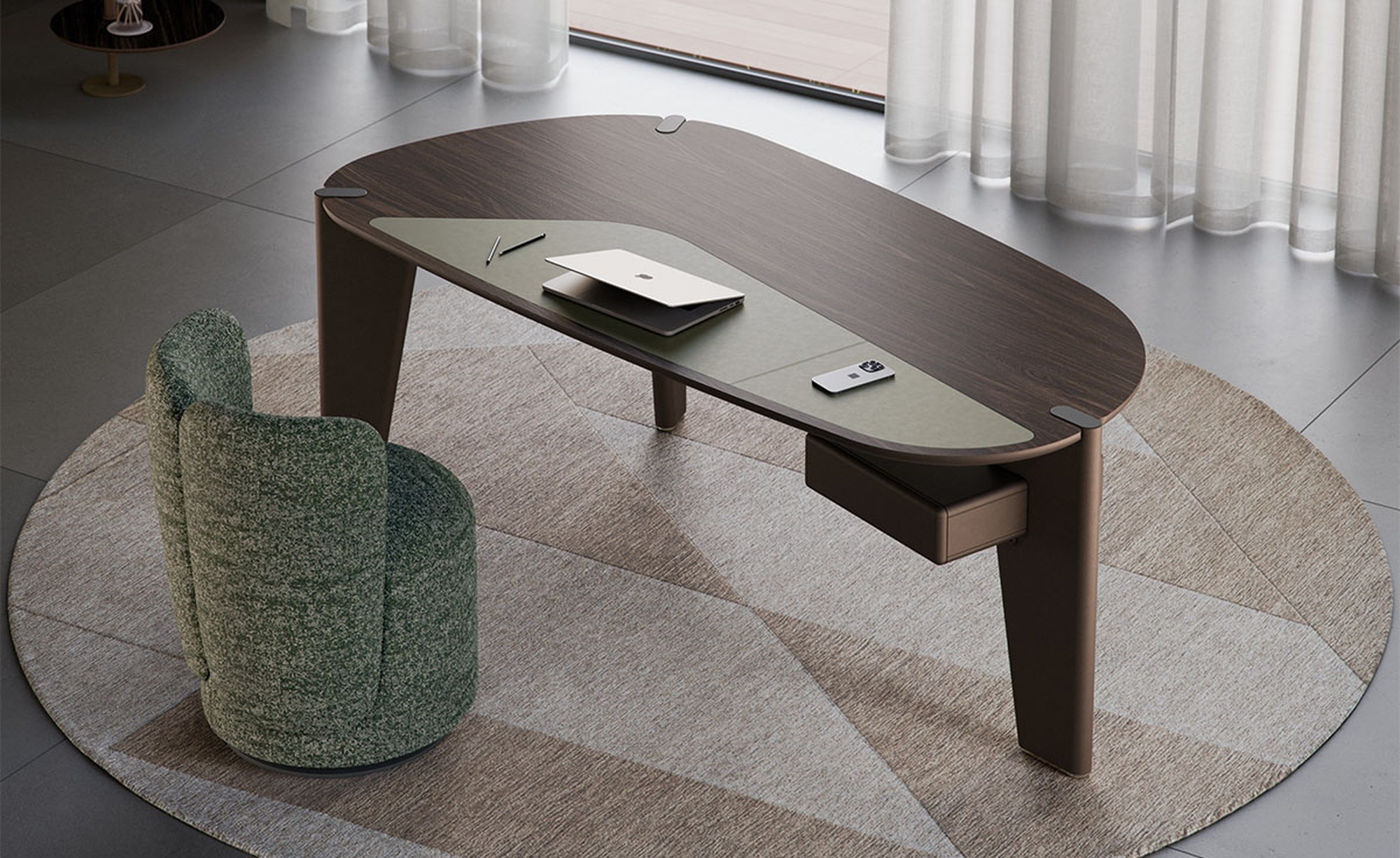 Письменный стол Boston фабрики Cattelan воплощает органичный дизайн 2026 года, где природная текстура дерева встречается с благородством металла в интерьере премиум-класса. Столешница из каналетто или мореного дуба дополнена асимметричной вставкой из мягкой кожи, повторяющей волнообразный изгиб профиля.